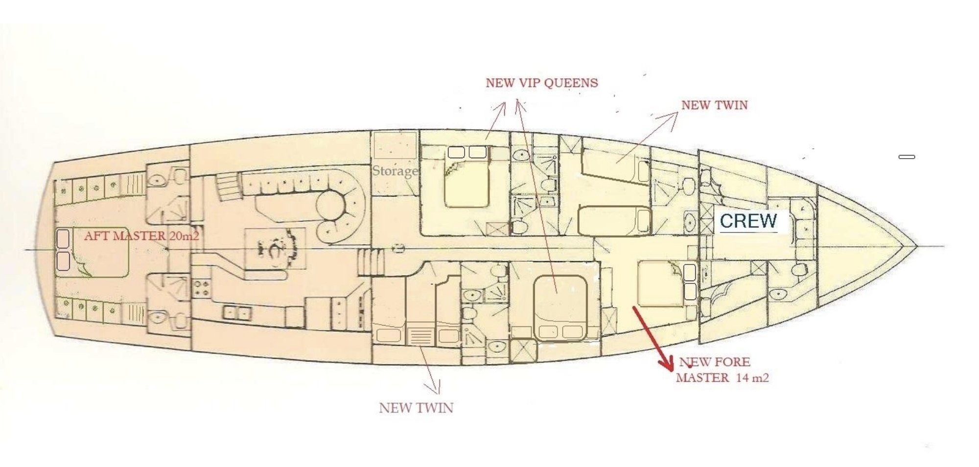 2 master cabins (Aft master with king size bed, fore master with queen size bed), 2 VIP Double with queen size bed and 2 twin cabins with 2 single beds