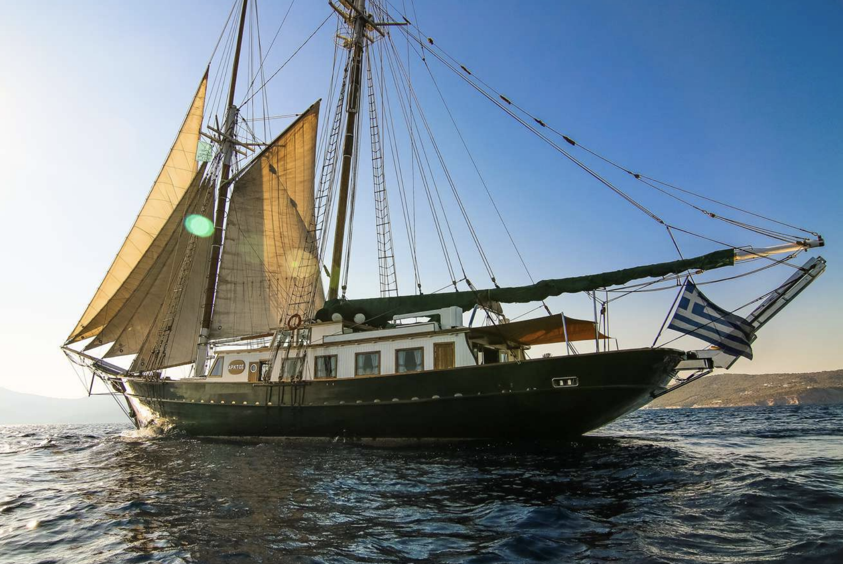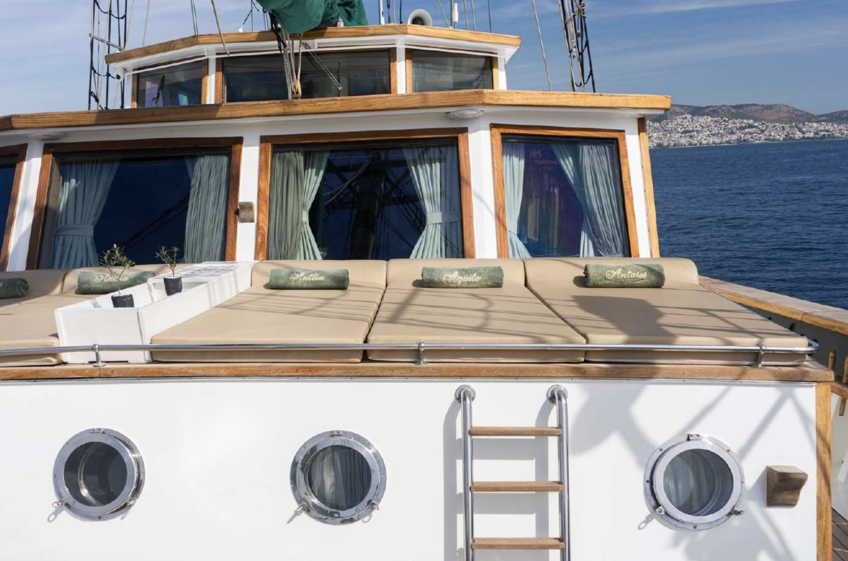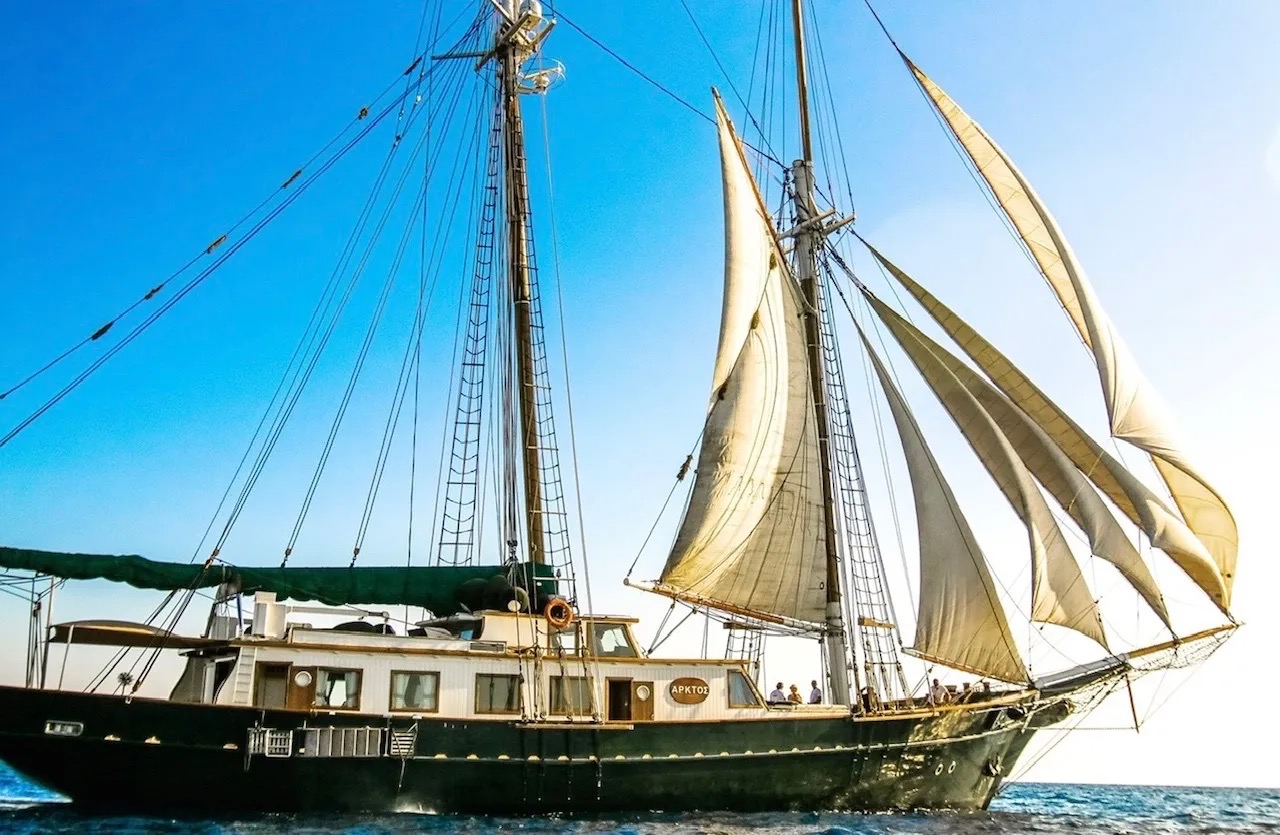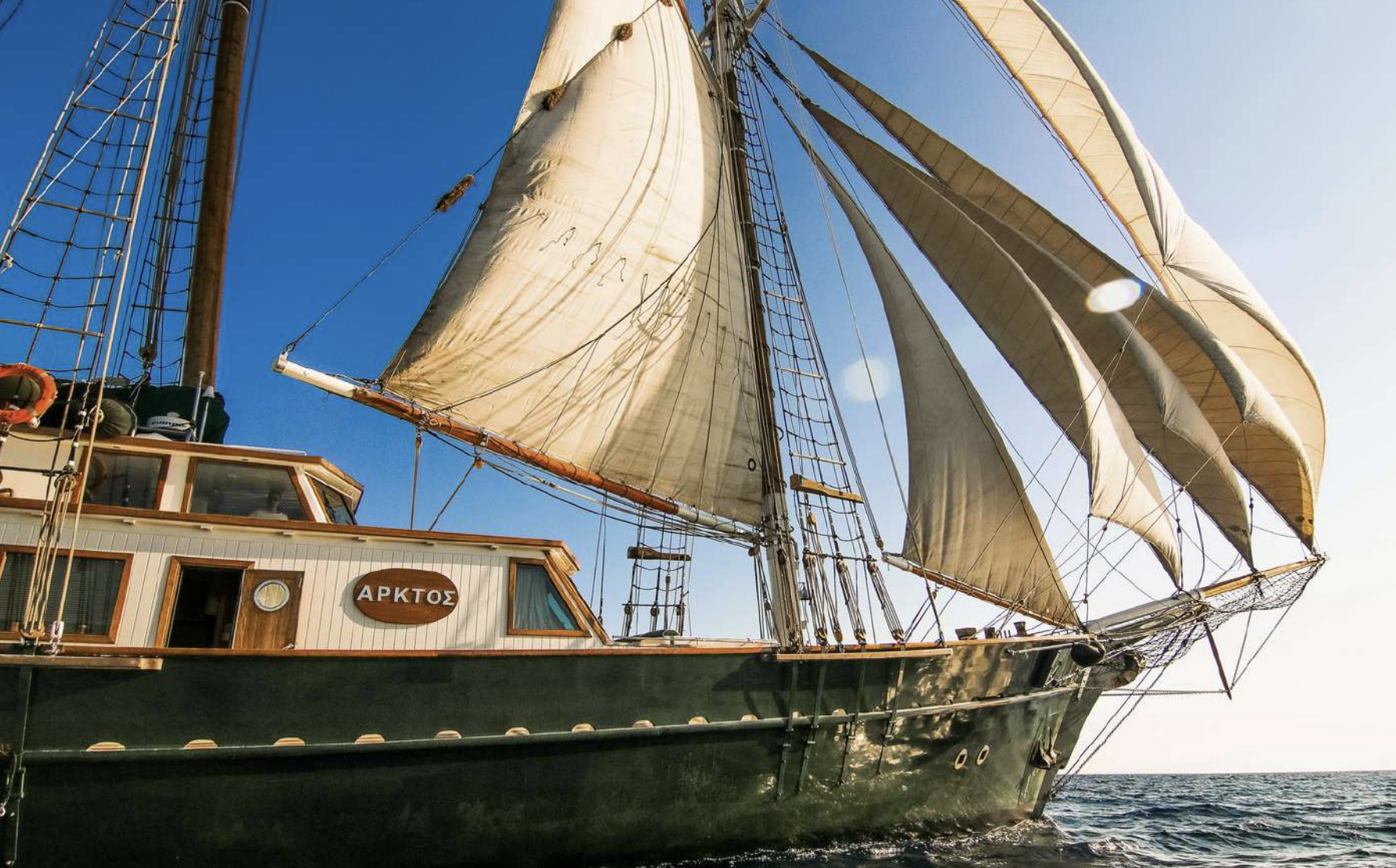 The luxurious ARKTOS, invites a group of 10 or 11 guests to experience the joy of sailing in classical style in Greece, attended by a Greek crew of four. She has two masts supporting more than 840 square metres of sail, and these sails are used daily if her guests so desire!