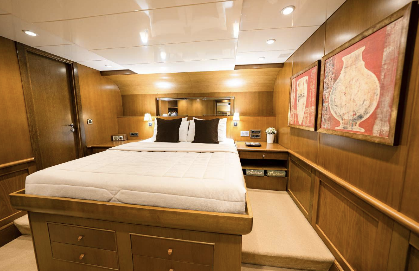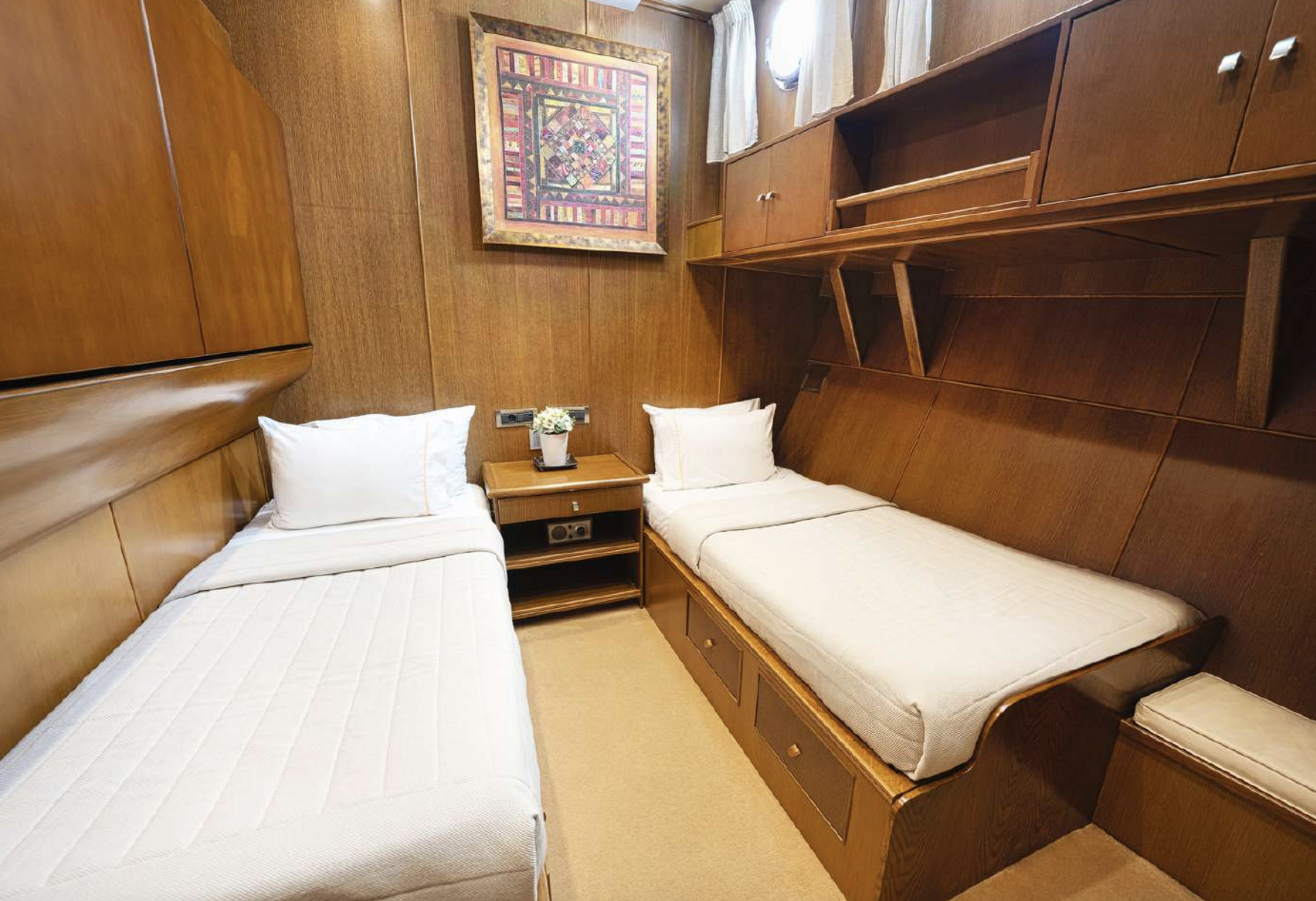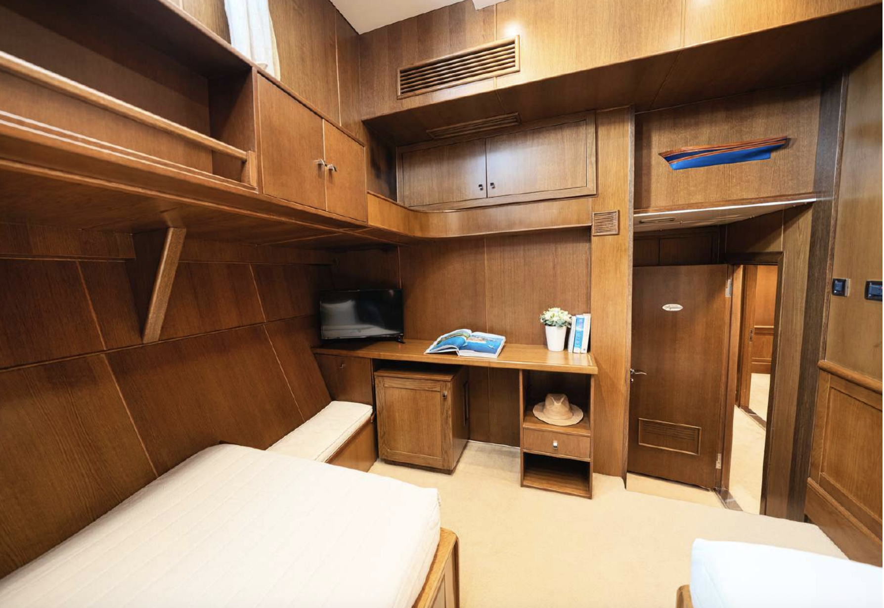 Accommodation is provided for between 10 and 11 guests in five ensuite cabins, all beautifully furnished and very spacious. The layout comprises one master suite, two double cabins and two twin cabins, one with an additional pullman bed and one which can be converted into a double berth if required. The full-width master suite has all the makings of a honeymoon suite with the addition of a walk-in closet and a writing desk. All cabins are fitted with LCD/DVD, while four are fitted with mini-fridges.