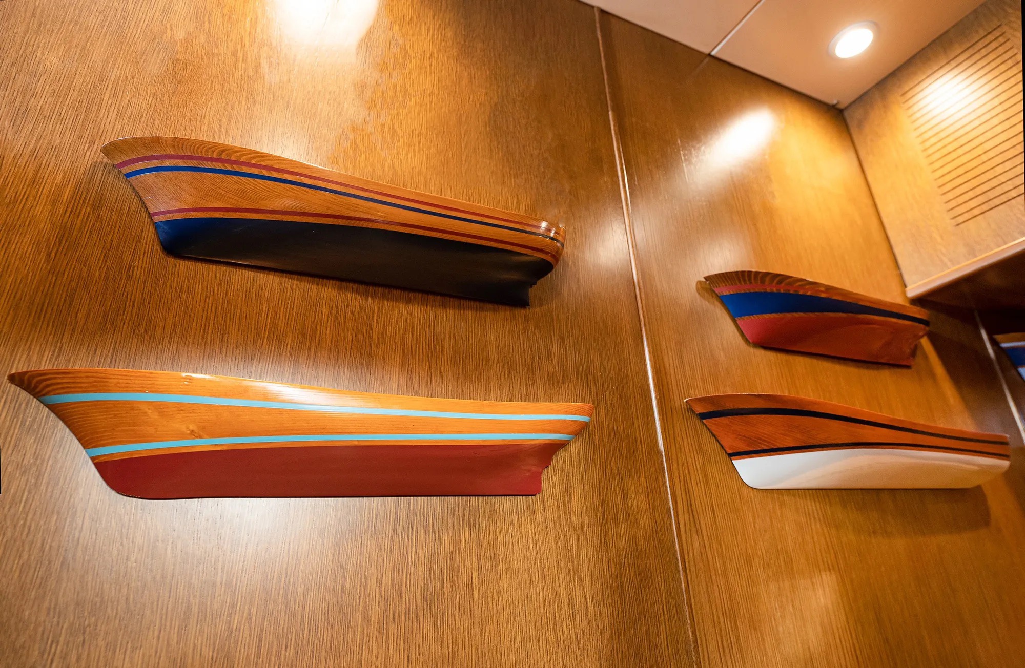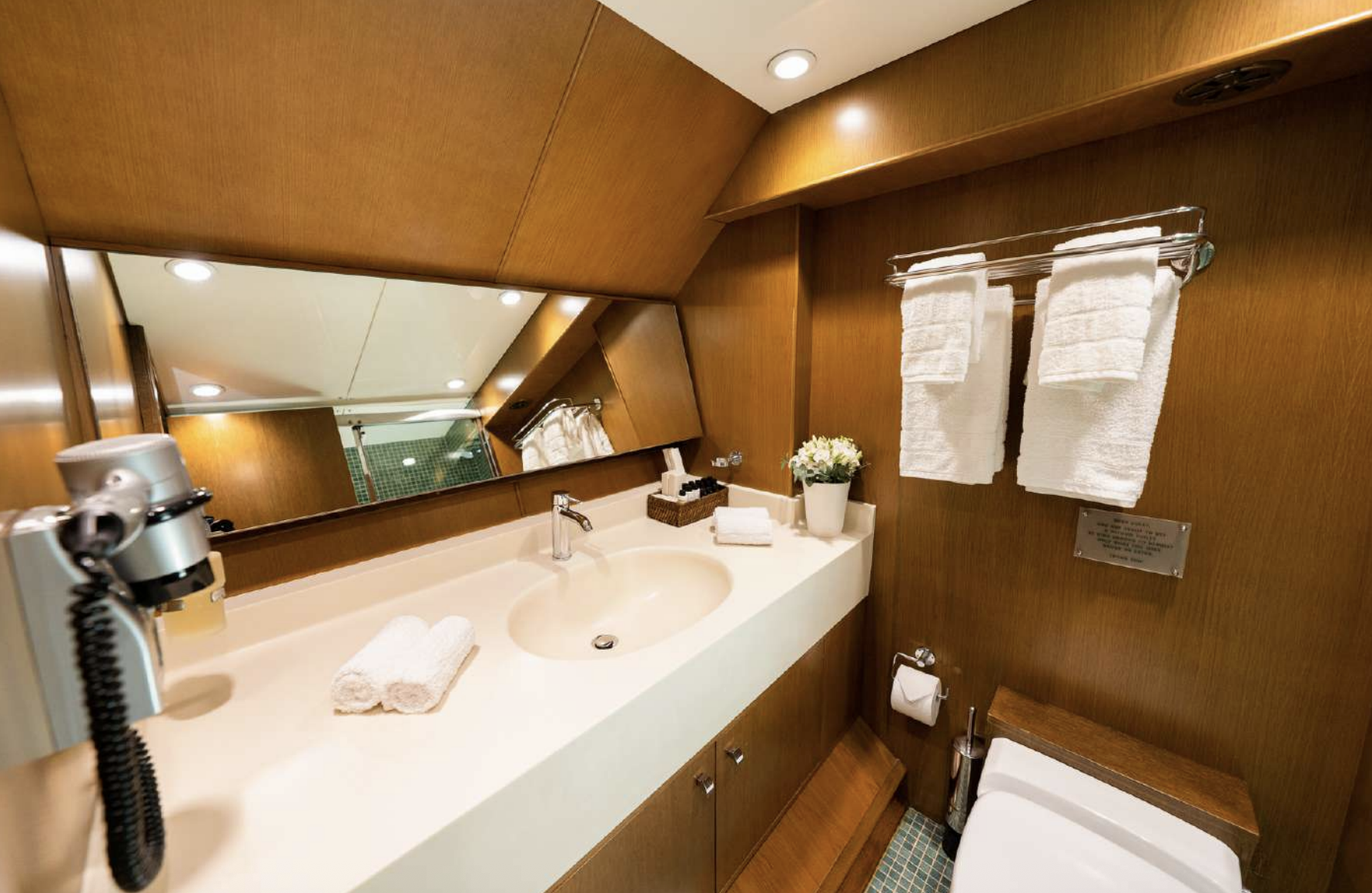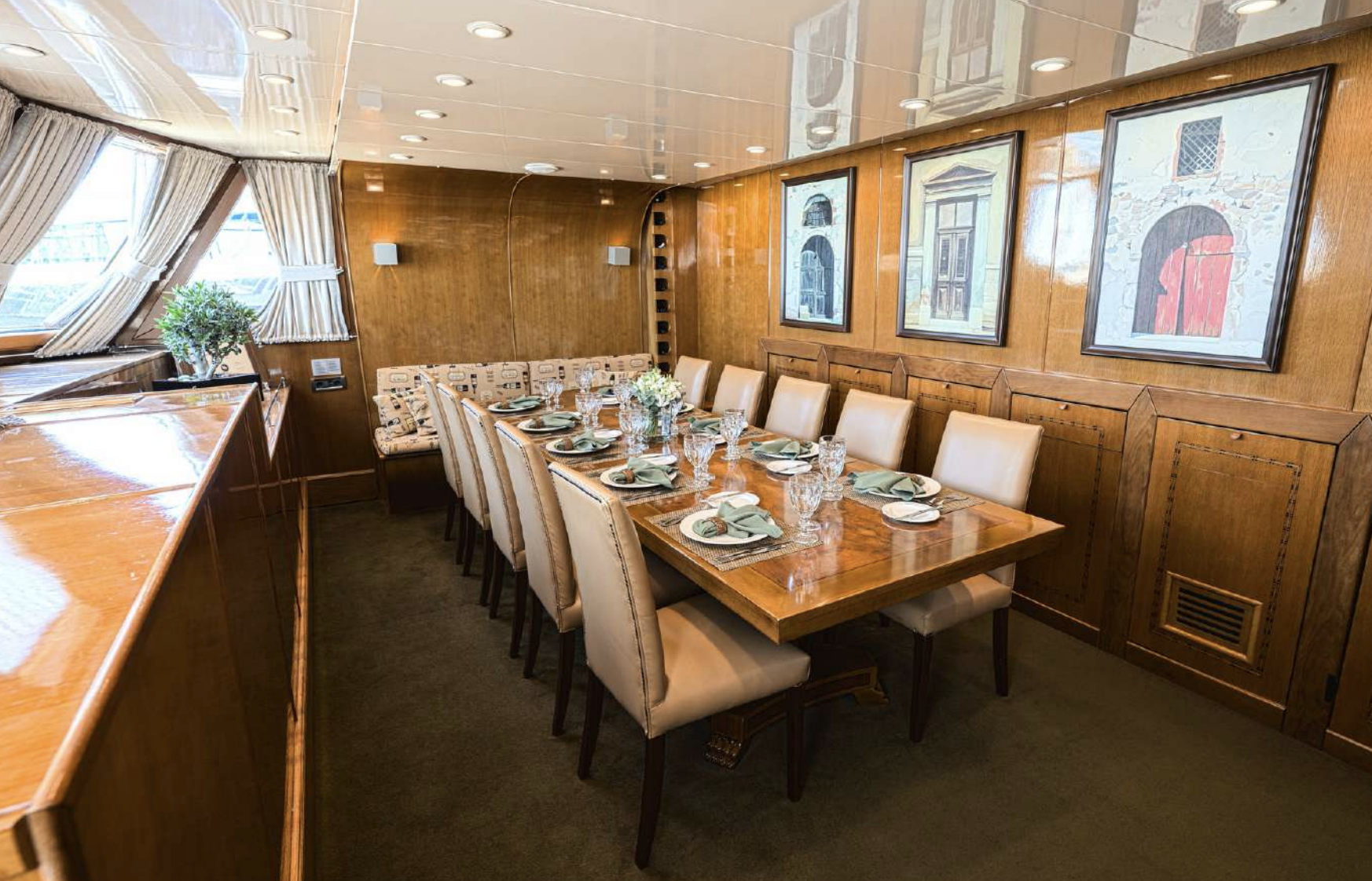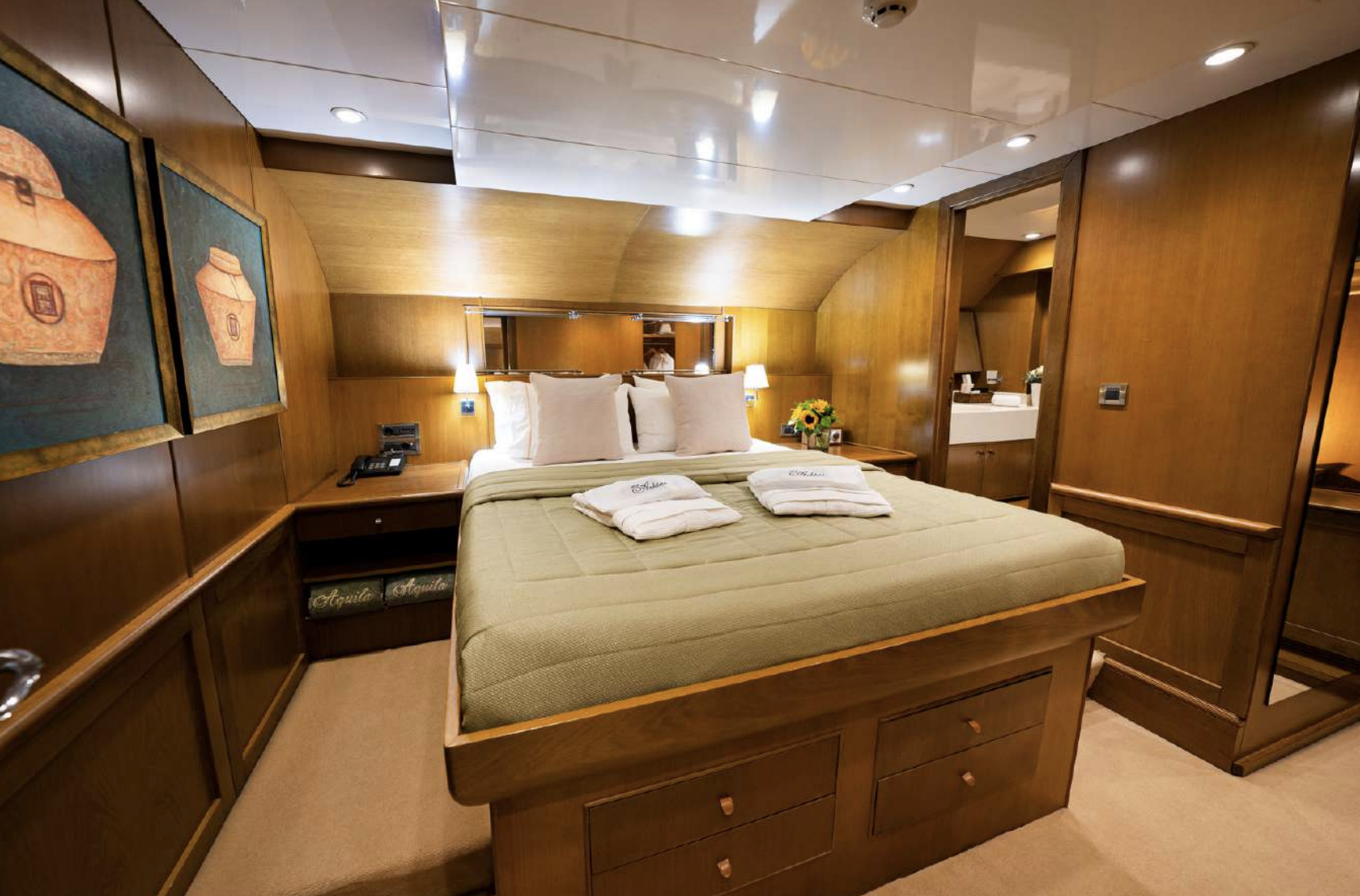 Accommodation is provided for between 10 and 11 guests in five ensuite cabins, all beautifully furnished and very spacious. The layout comprises one master suite, two double cabins and two twin cabins, one with an additional pullman bed and one which can be converted into a double berth if required. The full-width master suite has all the makings of a honeymoon suite with the addition of a walk-in closet and a writing desk. All cabins are fitted with LCD/DVD, while four are fitted with mini-fridges.