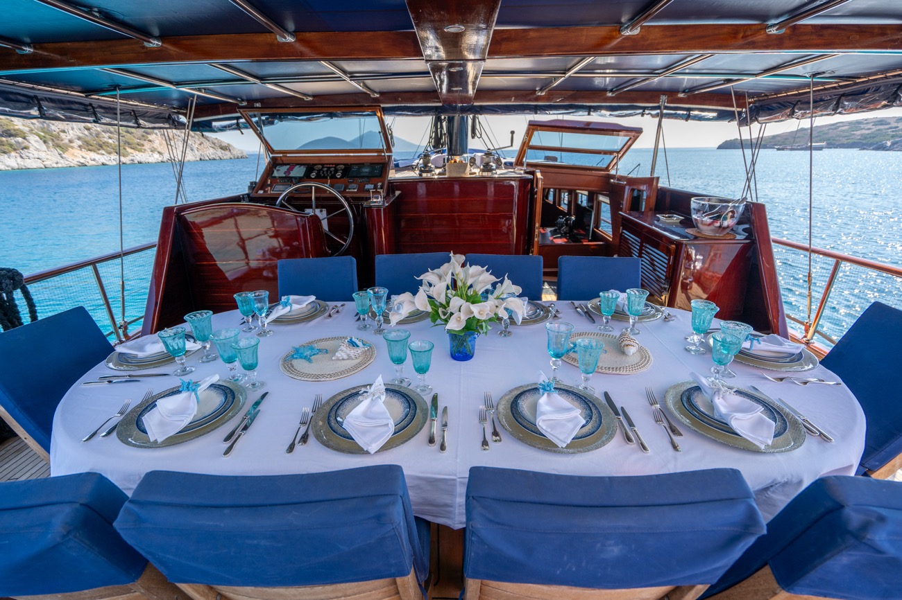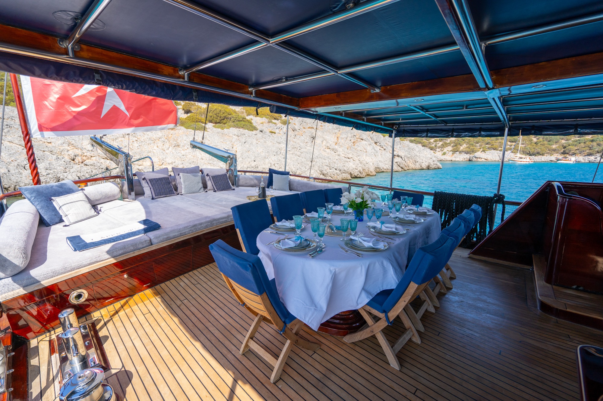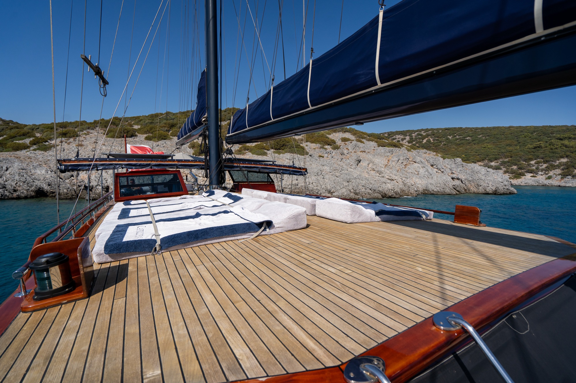 Al fresco meals are served on the aft deck around a large dining table and guests are welcome to savor the relaxing mood on comfortable oversized cushions set around the aft. On the forward deck, there is a spacious sunning area where guests are invited to spread out and enjoy the warm rays of the Aegean sun.