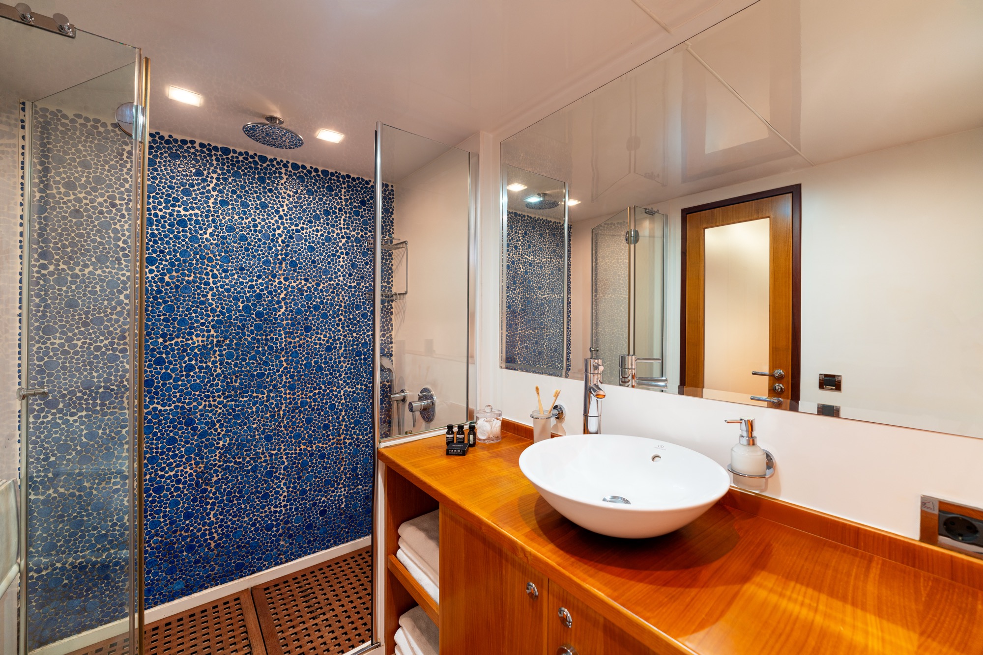 1 forward master cabin with king size bed, 1 port VIP cabin with queen size bed, 2 starboard equal sized twin cabins adjustable to king size beds.
