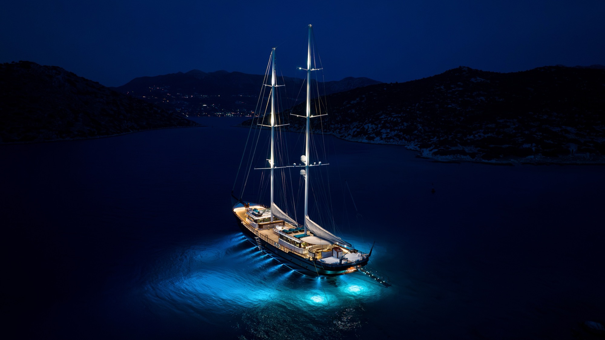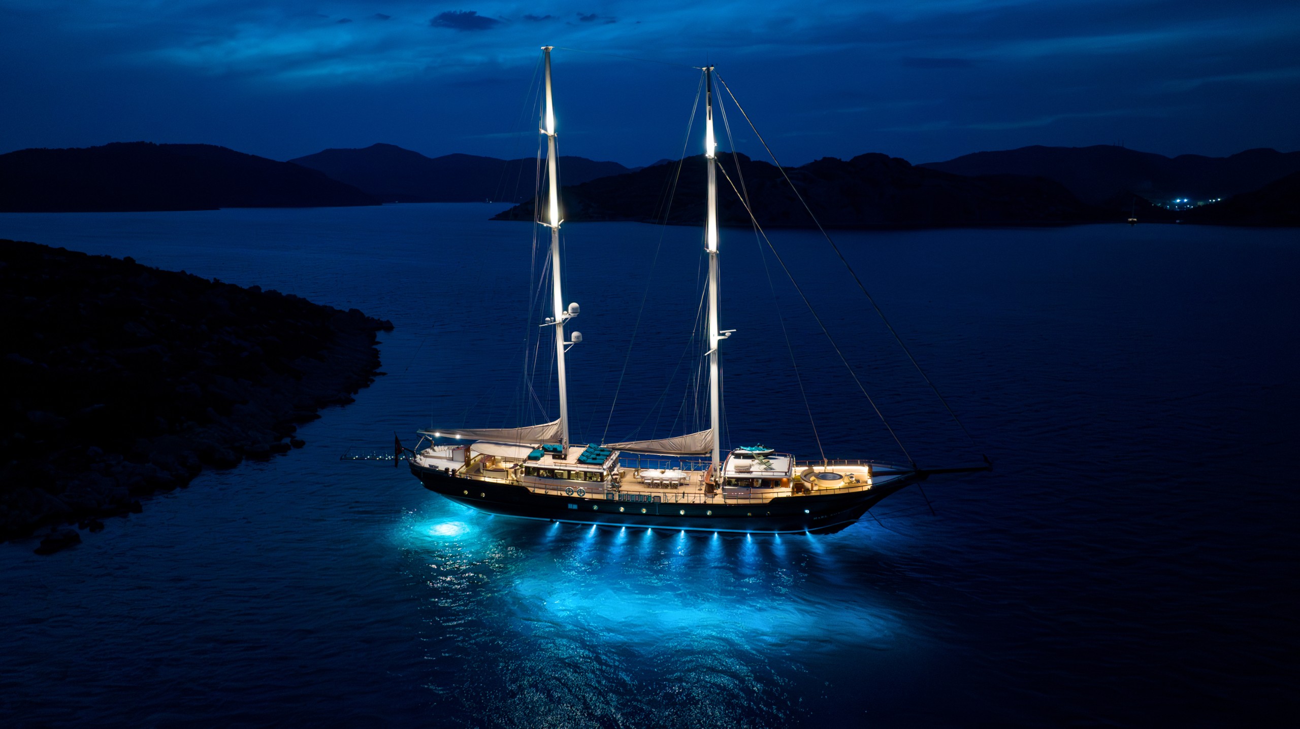 MARE NOSTRUM was designed and built in Turkey specifically for private yacht charter with a strong schooner rig, which means that she will sail well when the winds are favourable. Every one of her guests enjoys the utter tranqulity of being aboard as she drifts quietly under sail, and they watch the passing scenery, soak up the sun and keep an eye out for pods of playful dolphins.