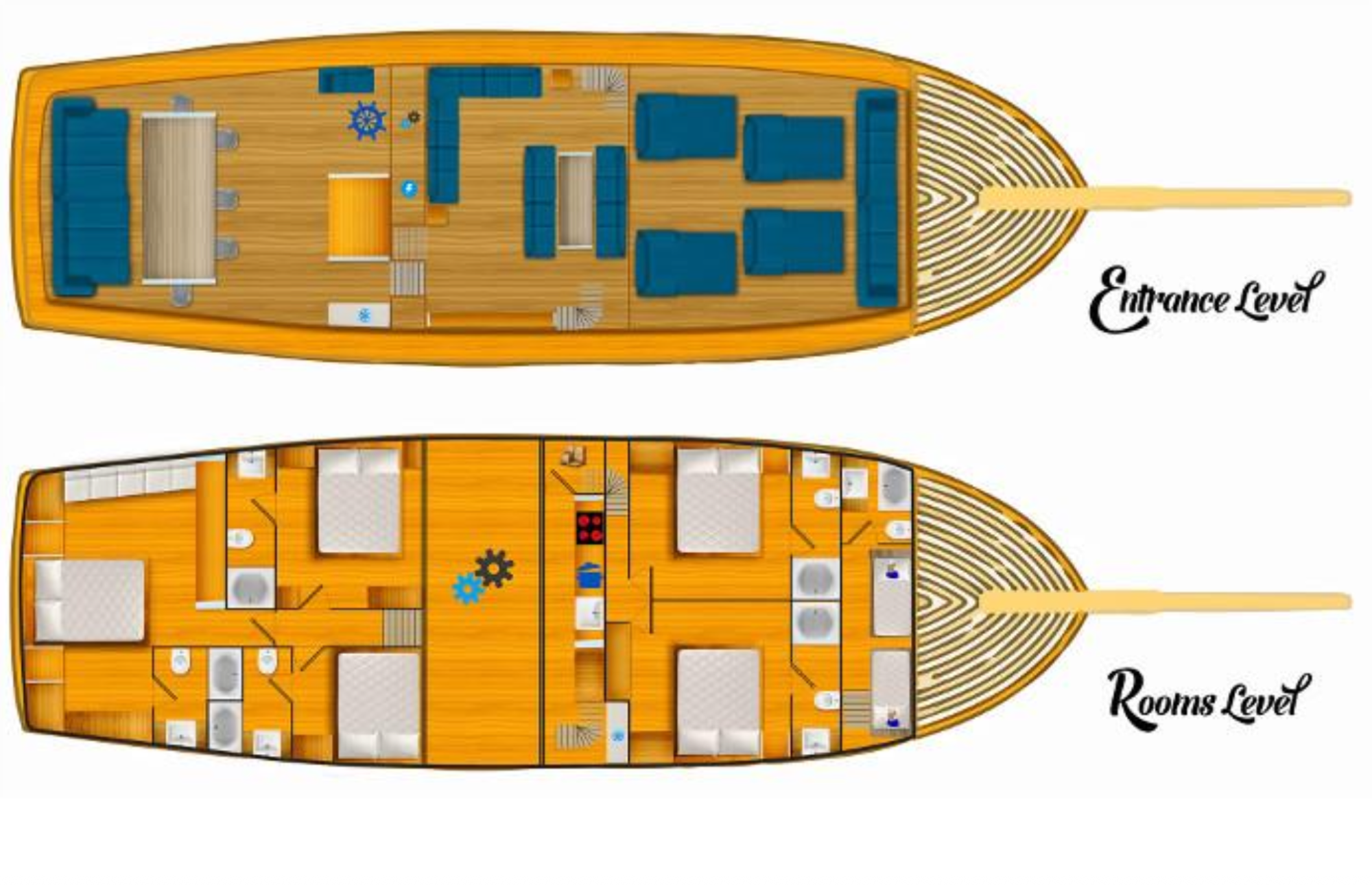 1 Master, 4 Double staterooms. Each cabin has its private ensuite.