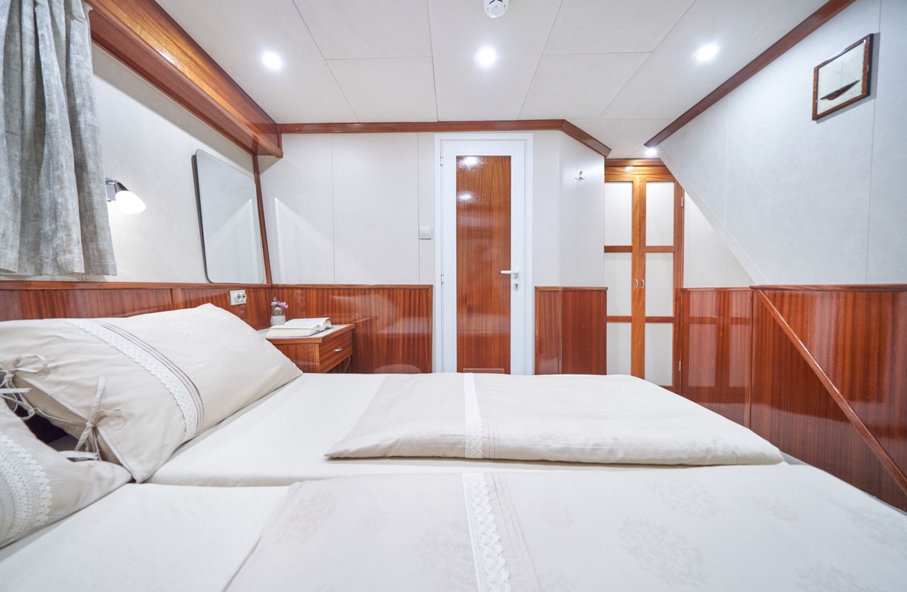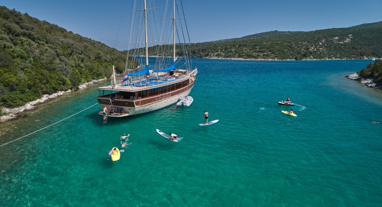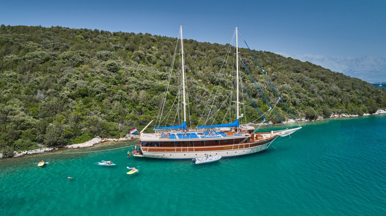 Charter rate includes, accommodation for a maximum of 18 guests in 9 cabins, the crew of 6 and their expenses, insurance of the vessel and the crew, fuel for 4 h of engine work daily, generator work 24/7, fuel for tender transfers to/from the vessel, use of recreational equipment (SUP, kayak, snorkeling gear), tourist taxes, Wi-Fi, VAT of 13%.