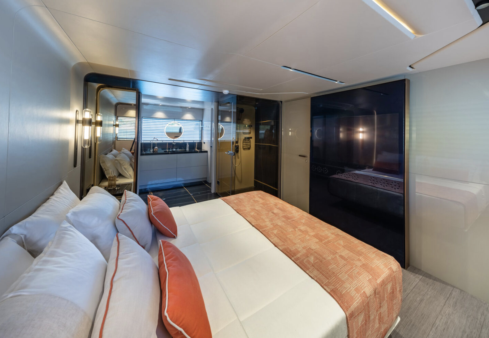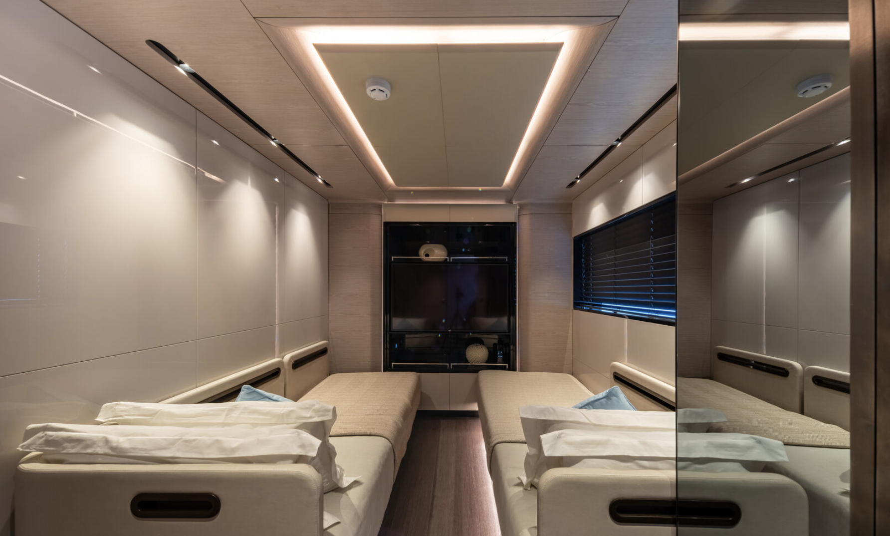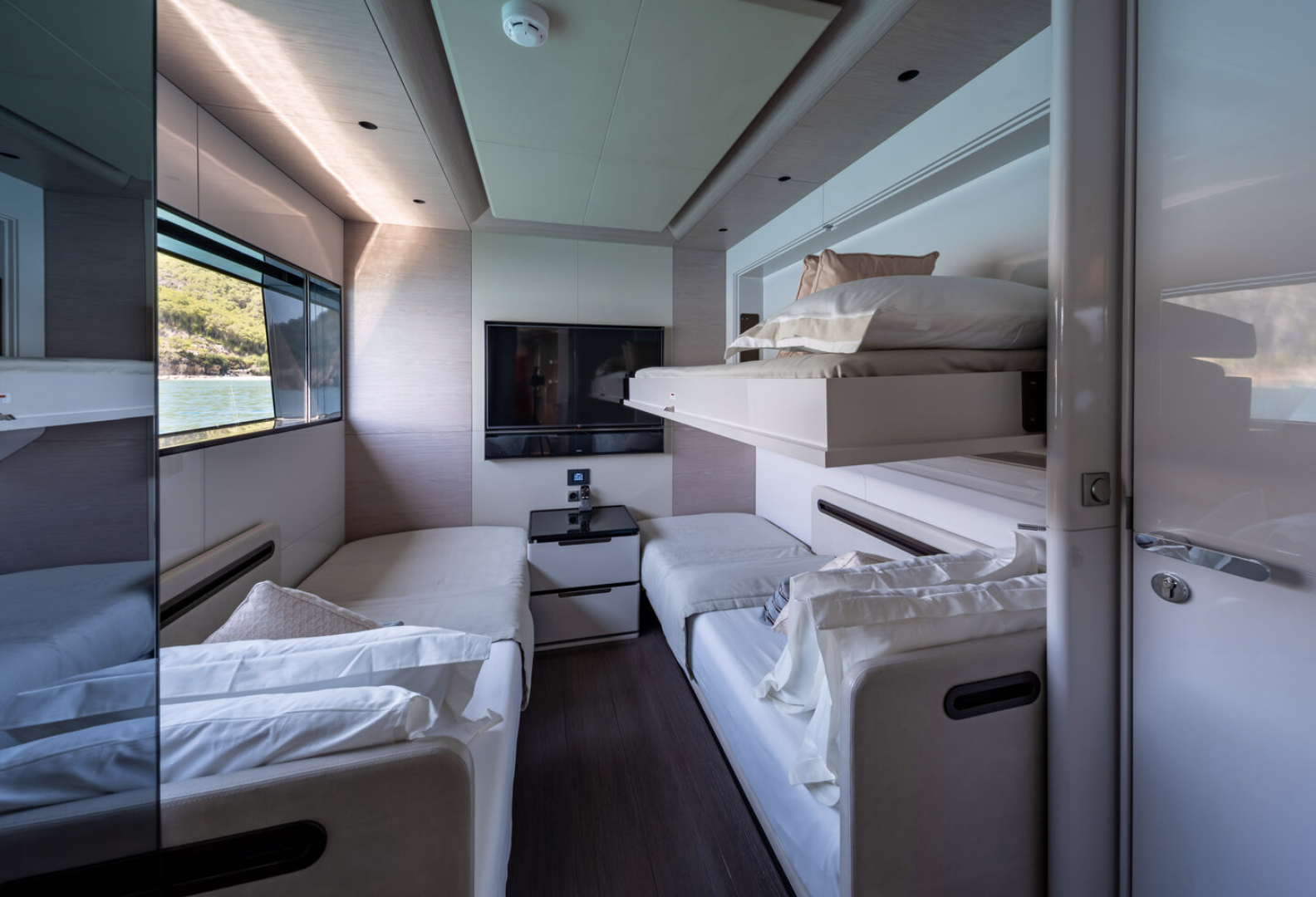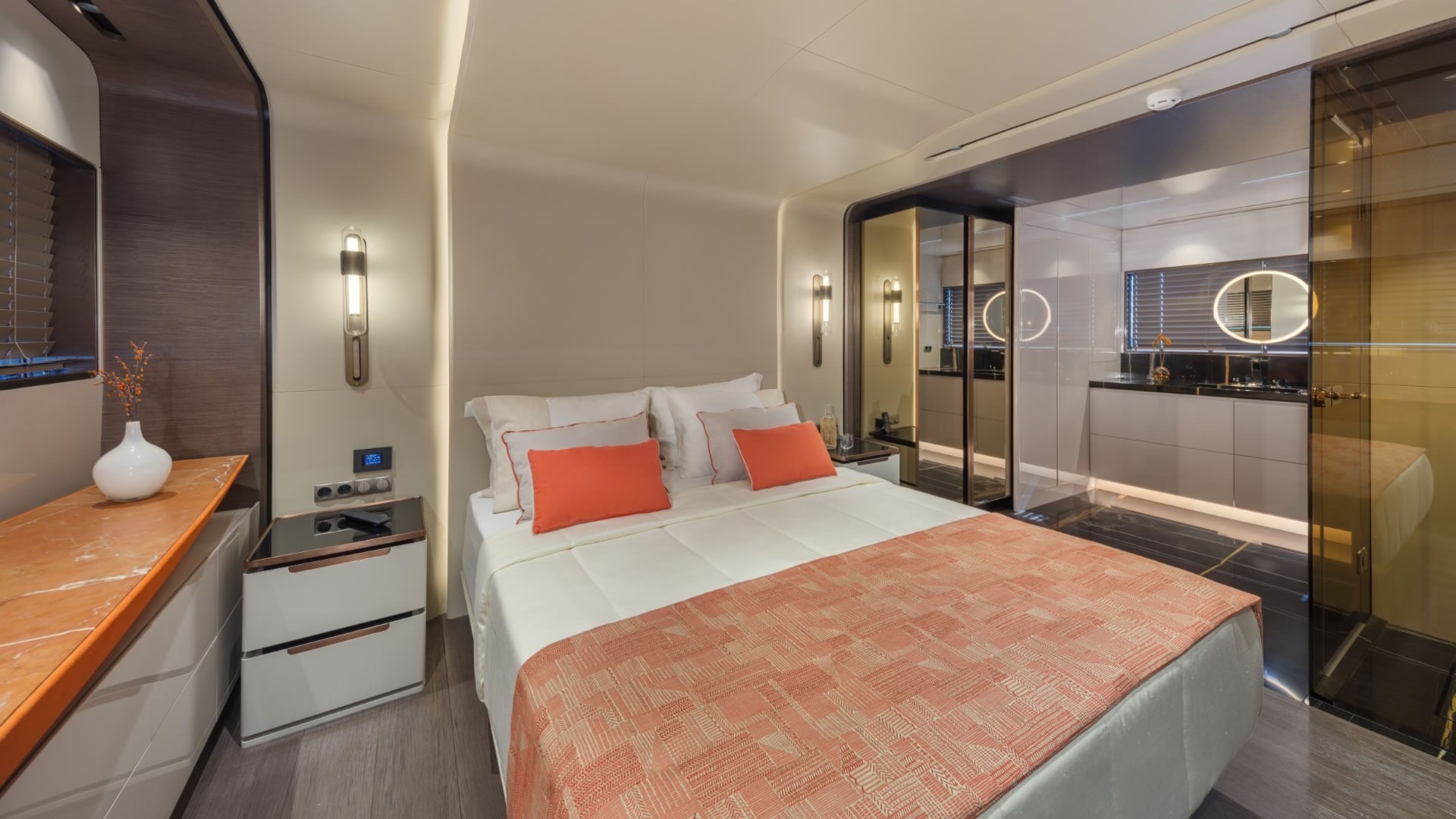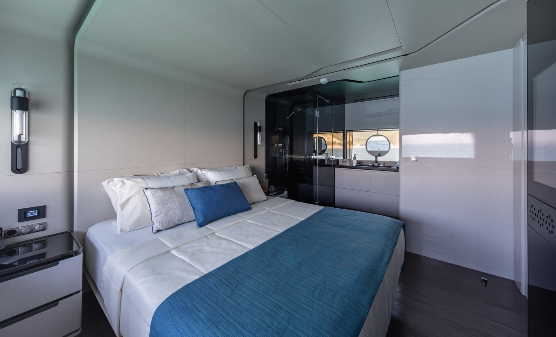 Full-beam Master Cabin with bathroom, his & her vanities and shower, full-beam VIP Cabin with bathroom, two twin cabins each with bathroom.