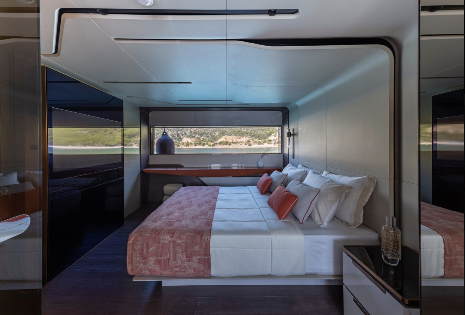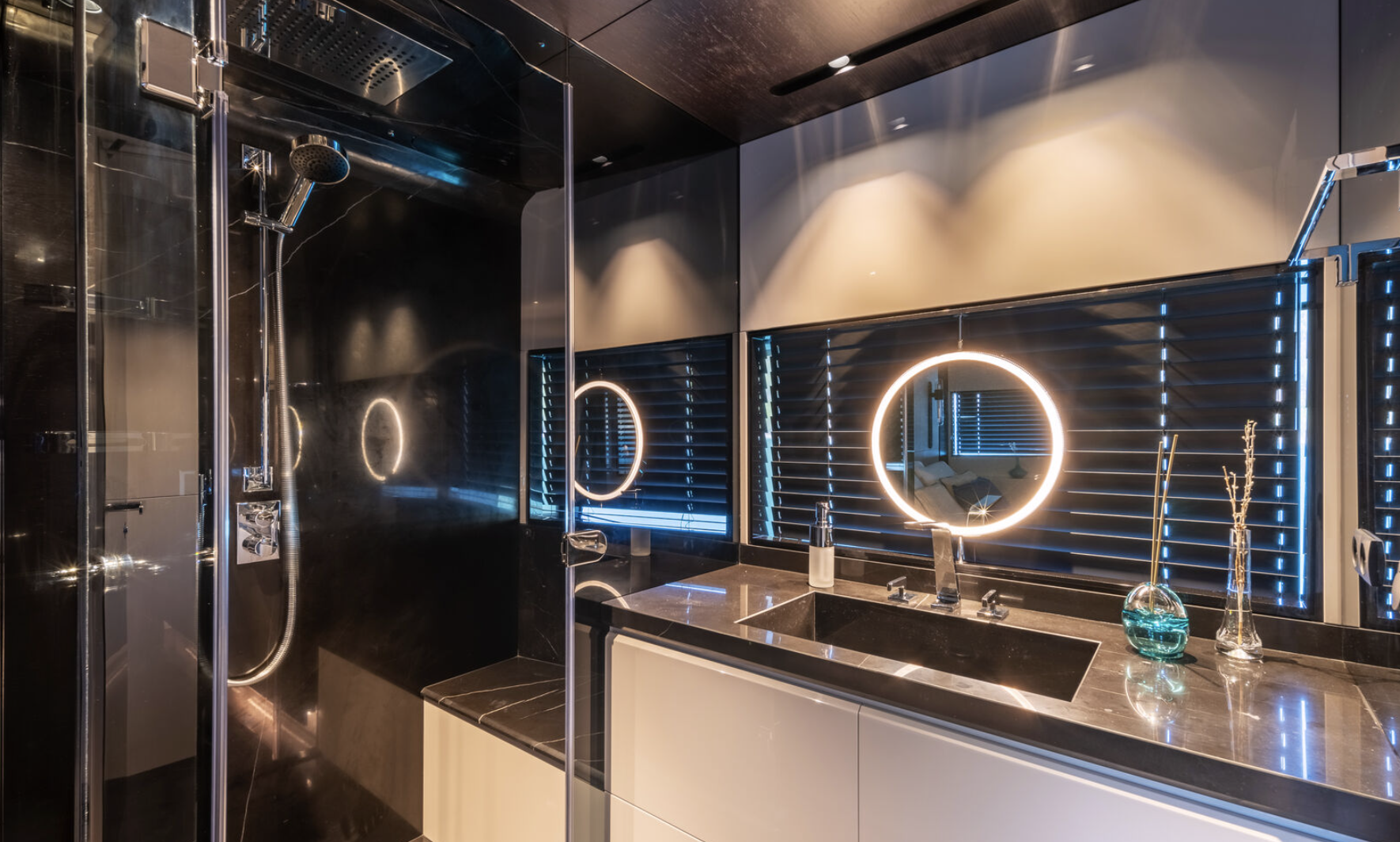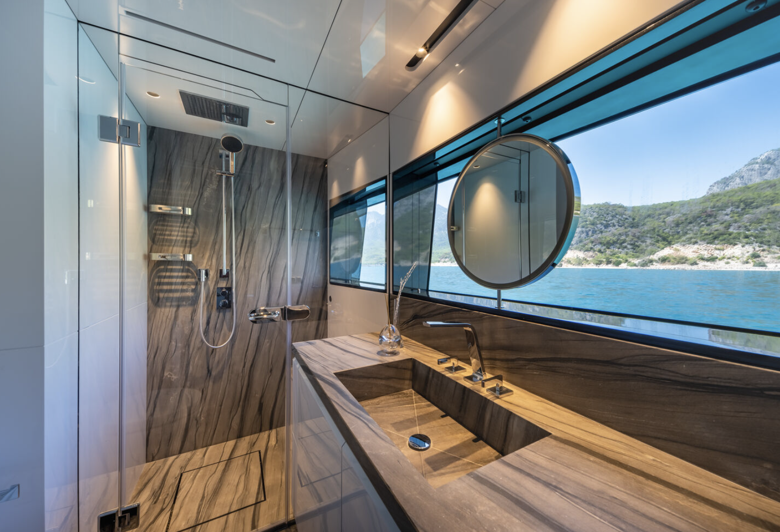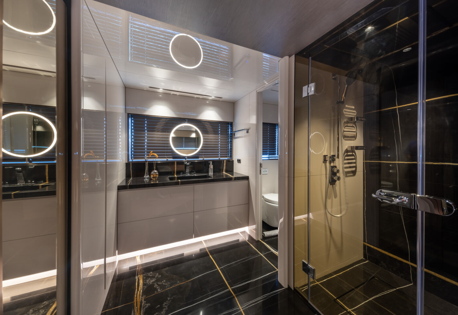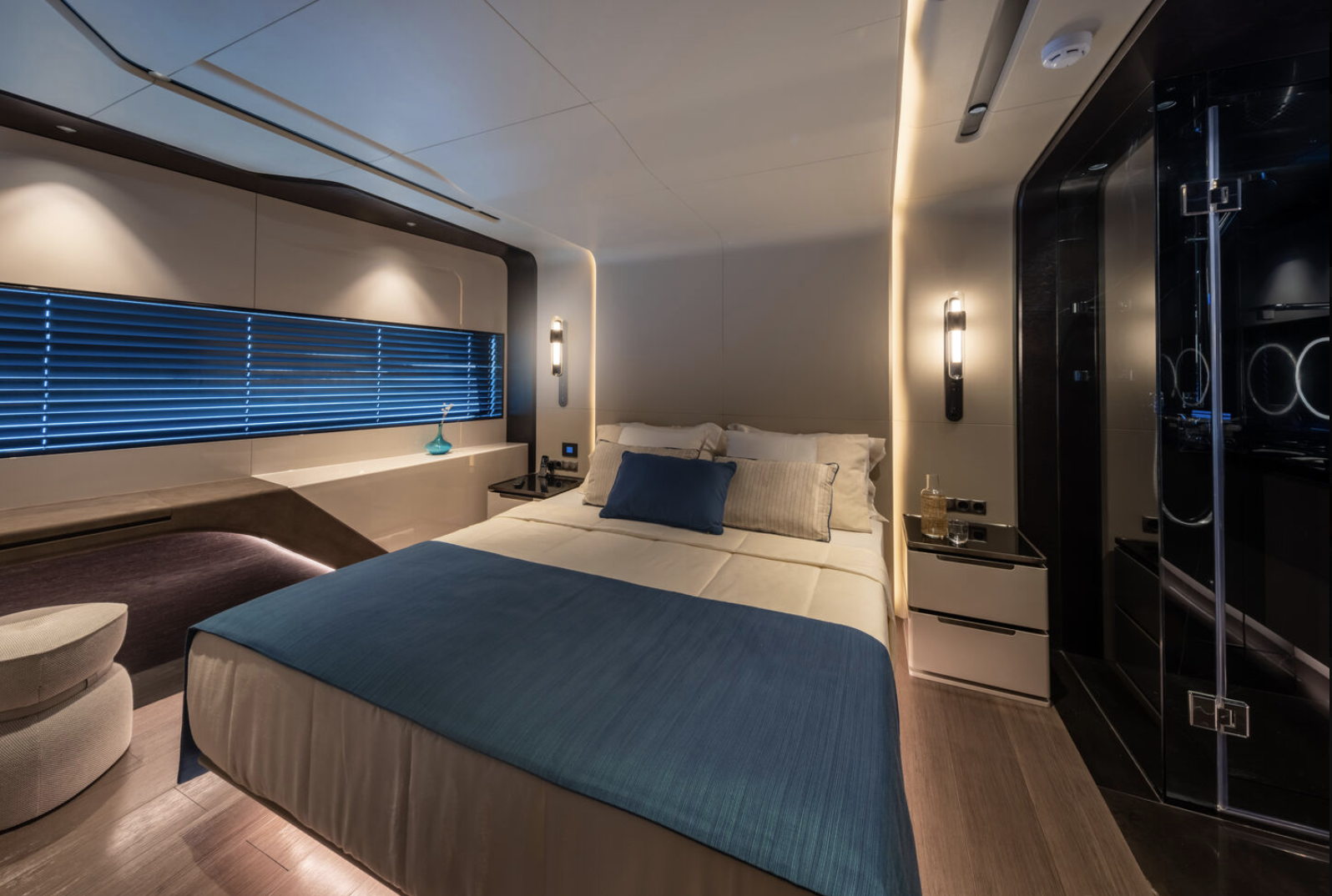 Full-beam Master Cabin with bathroom, his & her vanities and shower, full-beam VIP Cabin with bathroom, two twin cabins each with bathroom.