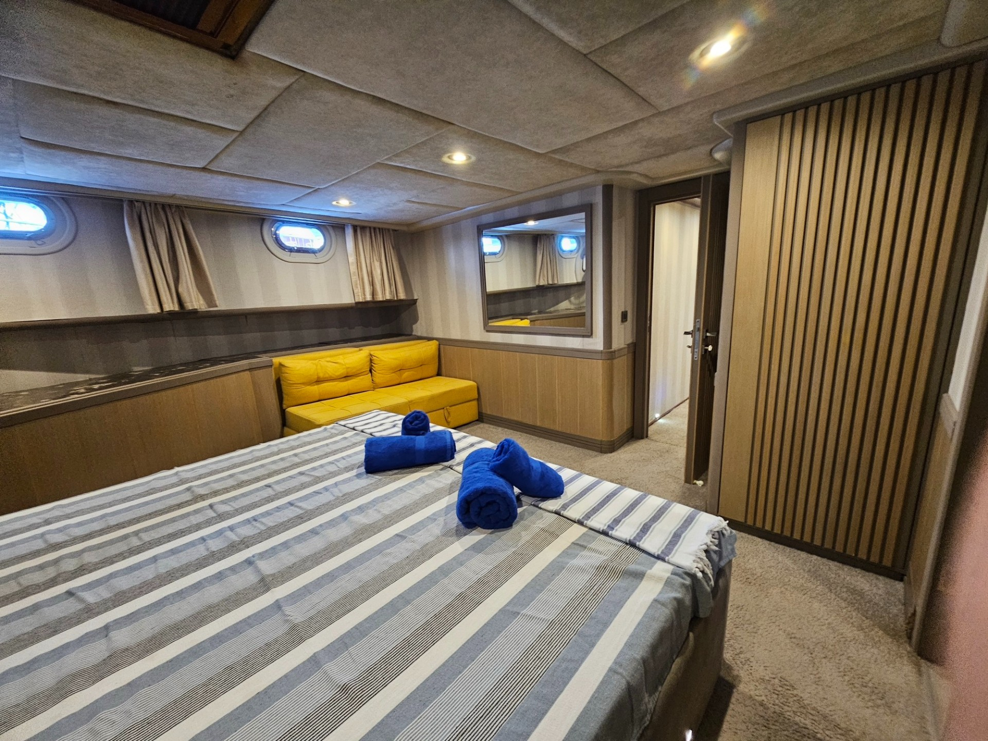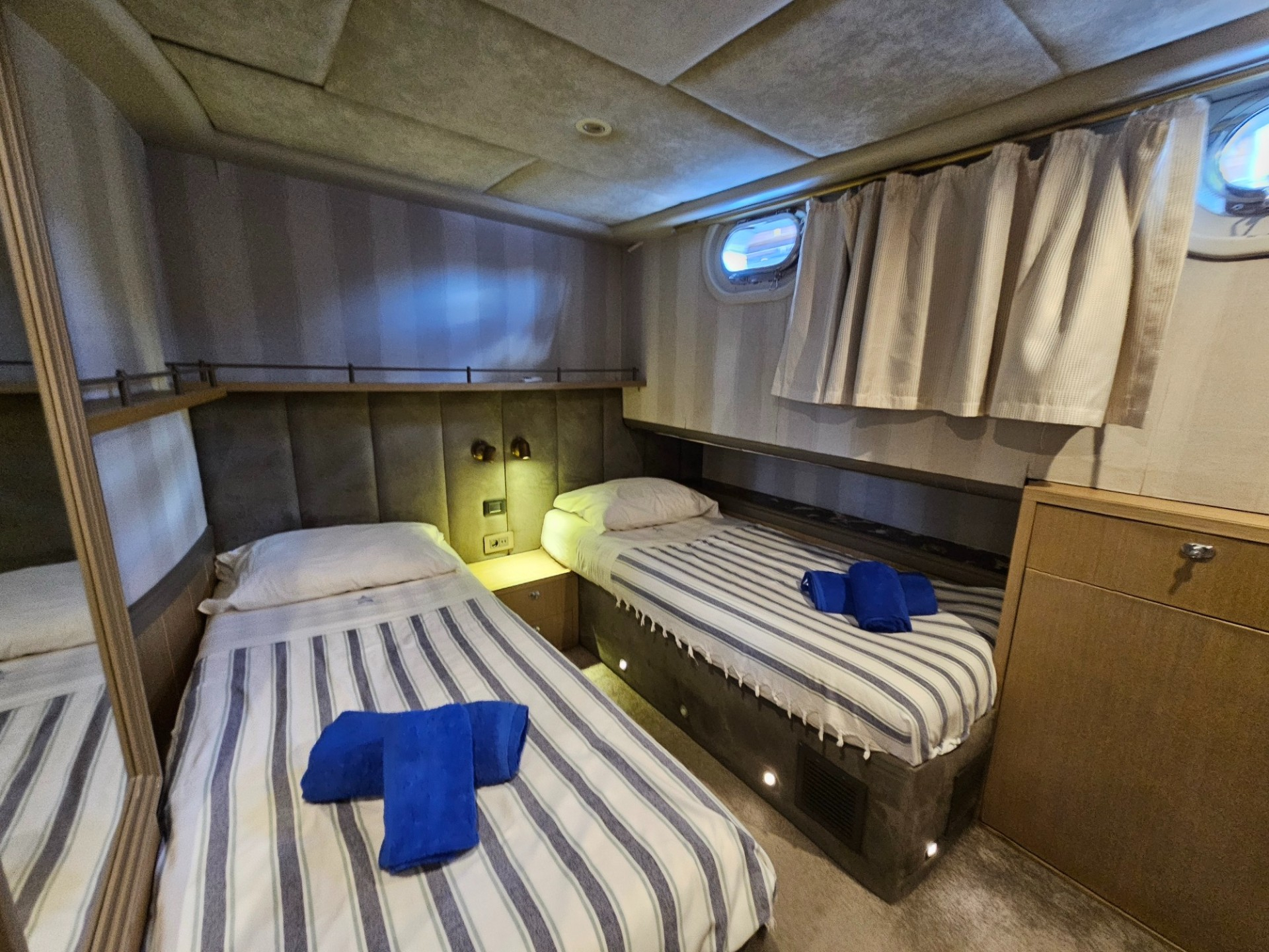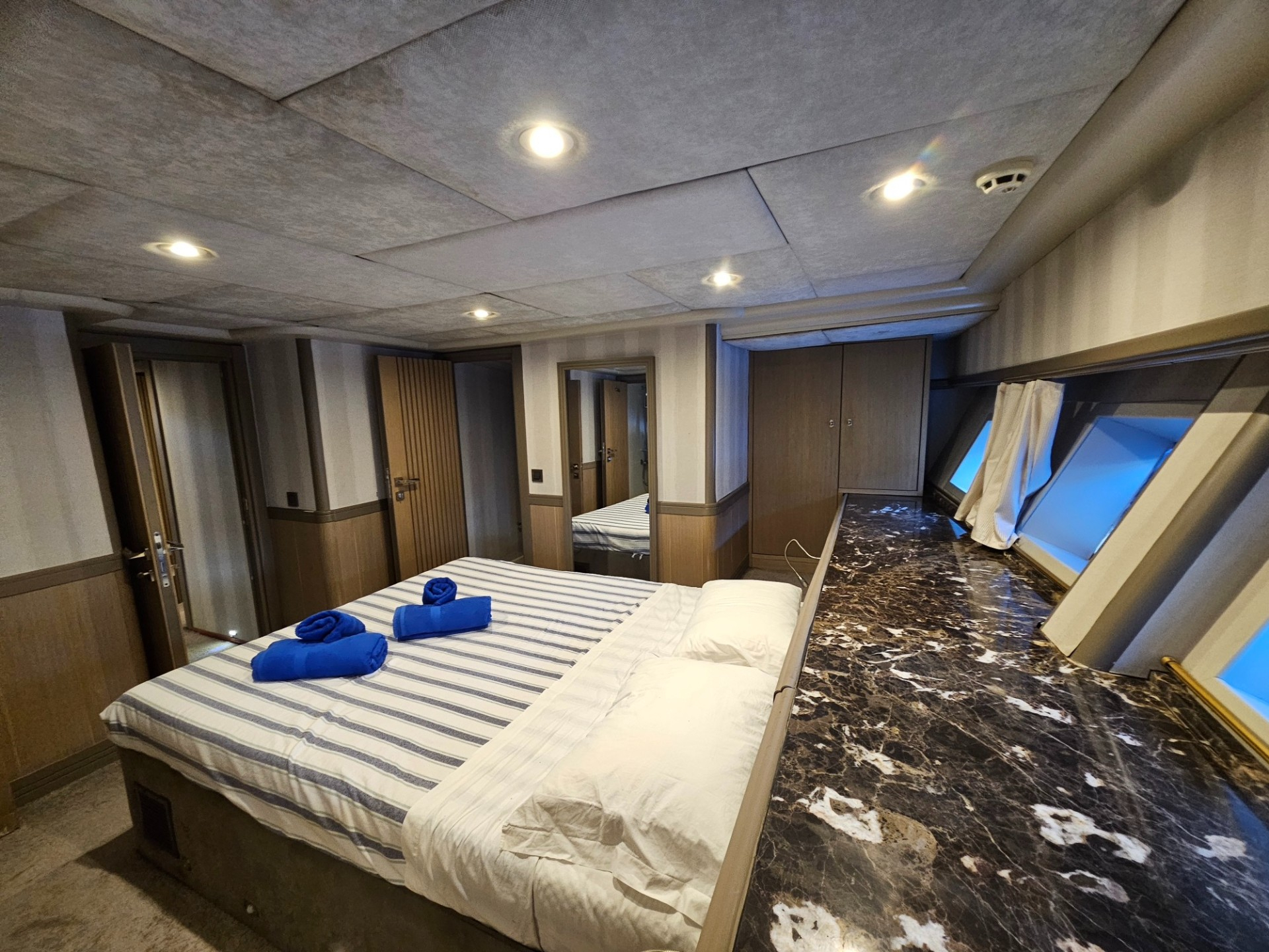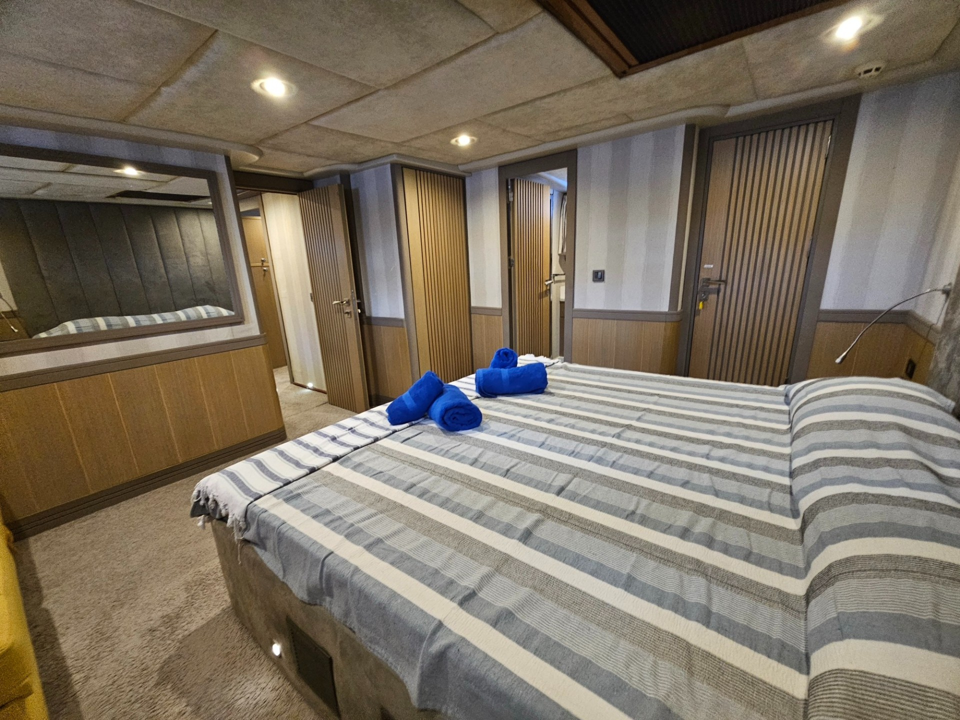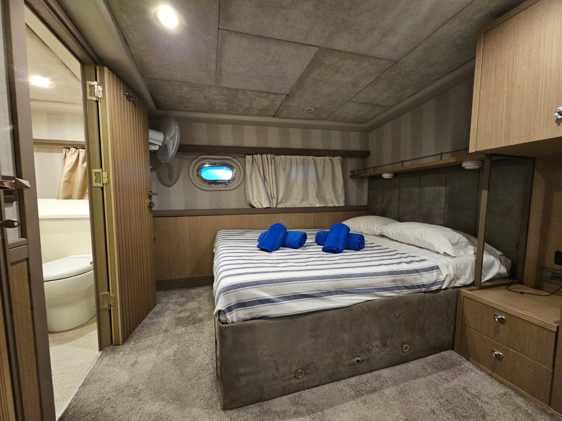 2 masters, 2 doubles and 1 twin, all ensuite. The bow master cabin can be offered, eventually, with a temporary extra bed.