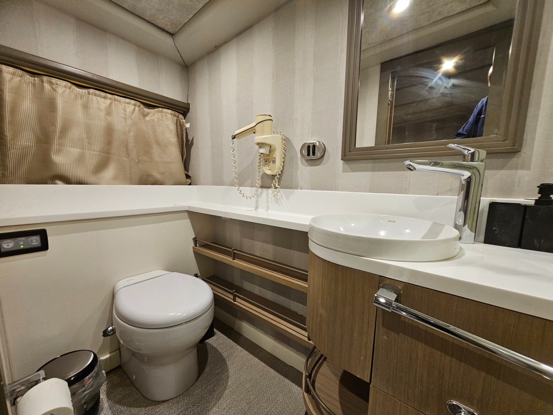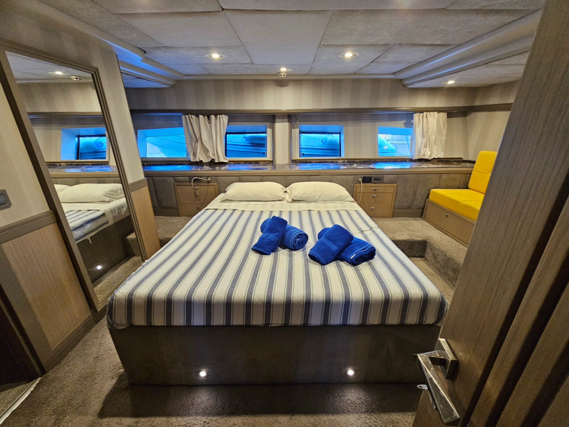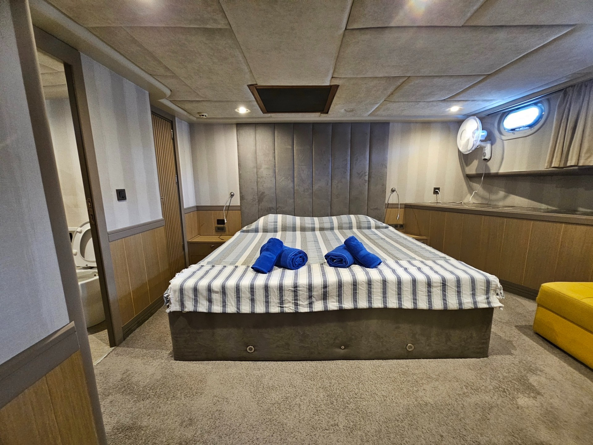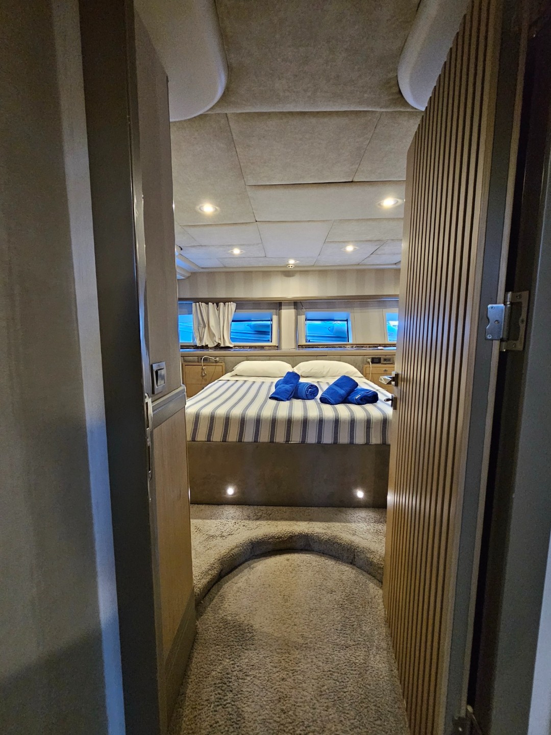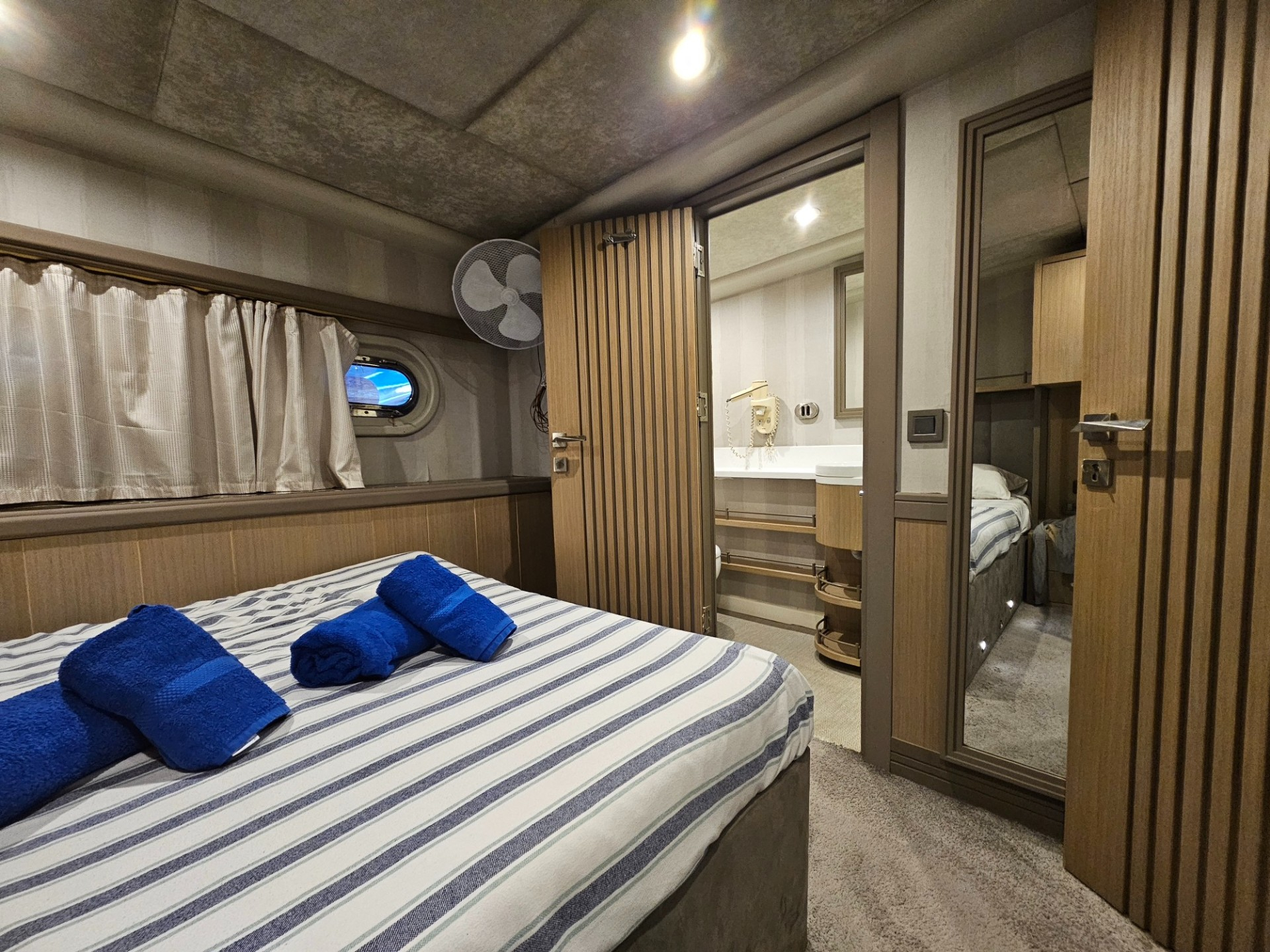 2 masters, 2 doubles and 1 twin, all ensuite. The bow master cabin can be offered, eventually, with a temporary extra bed.