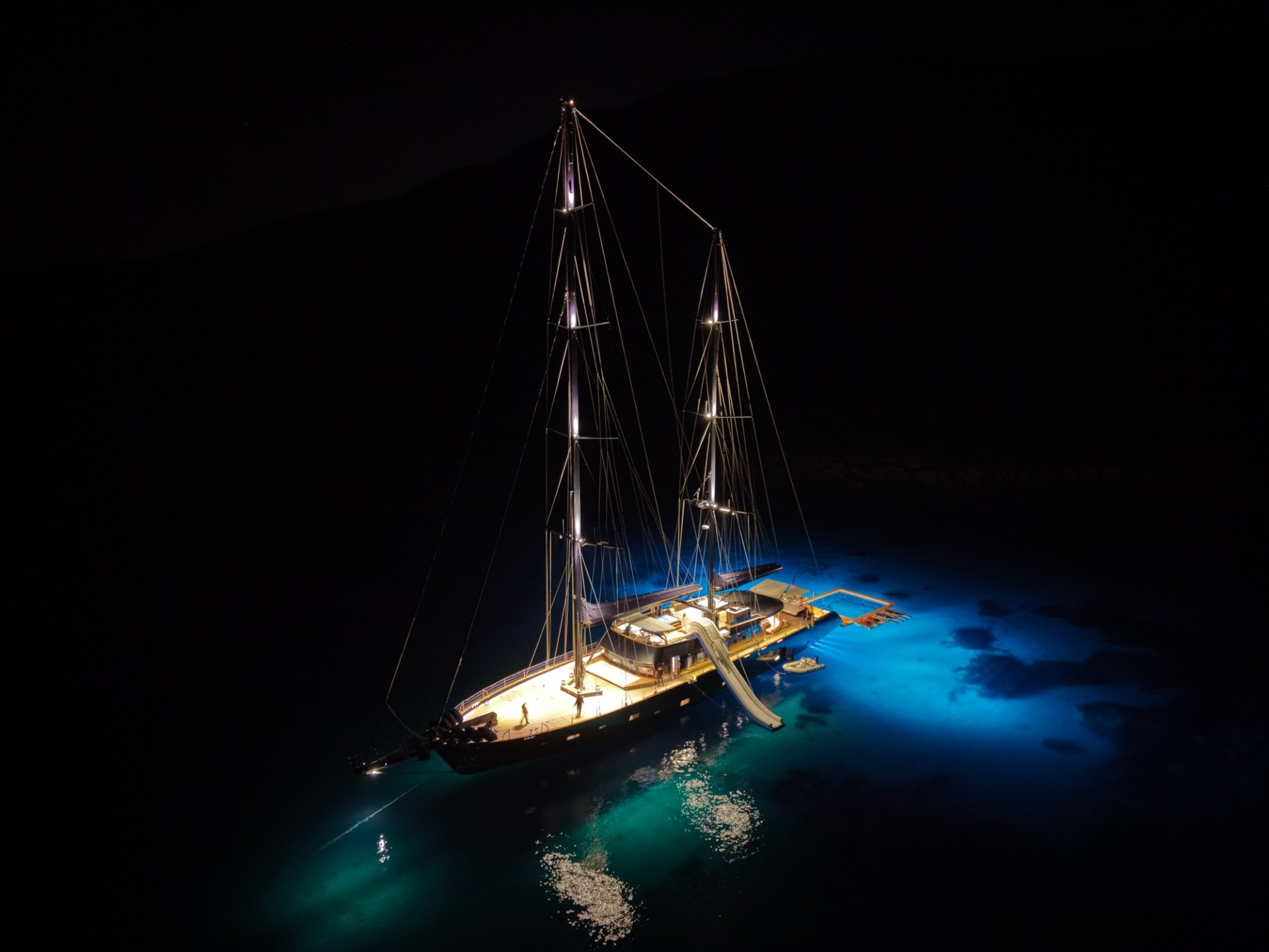 If you love the water, Oguz Khan yacht has one of the best "toy boxes" available on any charter yacht. The highlight is a huge inflatable water slide and a 10-meter sea pool that attaches to the back of the boat. For speed, there are two 310hp Kawasaki Jet Skis, electric foils (Liftfoil), and two Seabobs for diving under the water. The yacht also carries paddleboards, canoes, wakeboards, and full snorkeling gear. Two fast tenders (including a 7m model) are ready to take you to the beach or a local port in style.