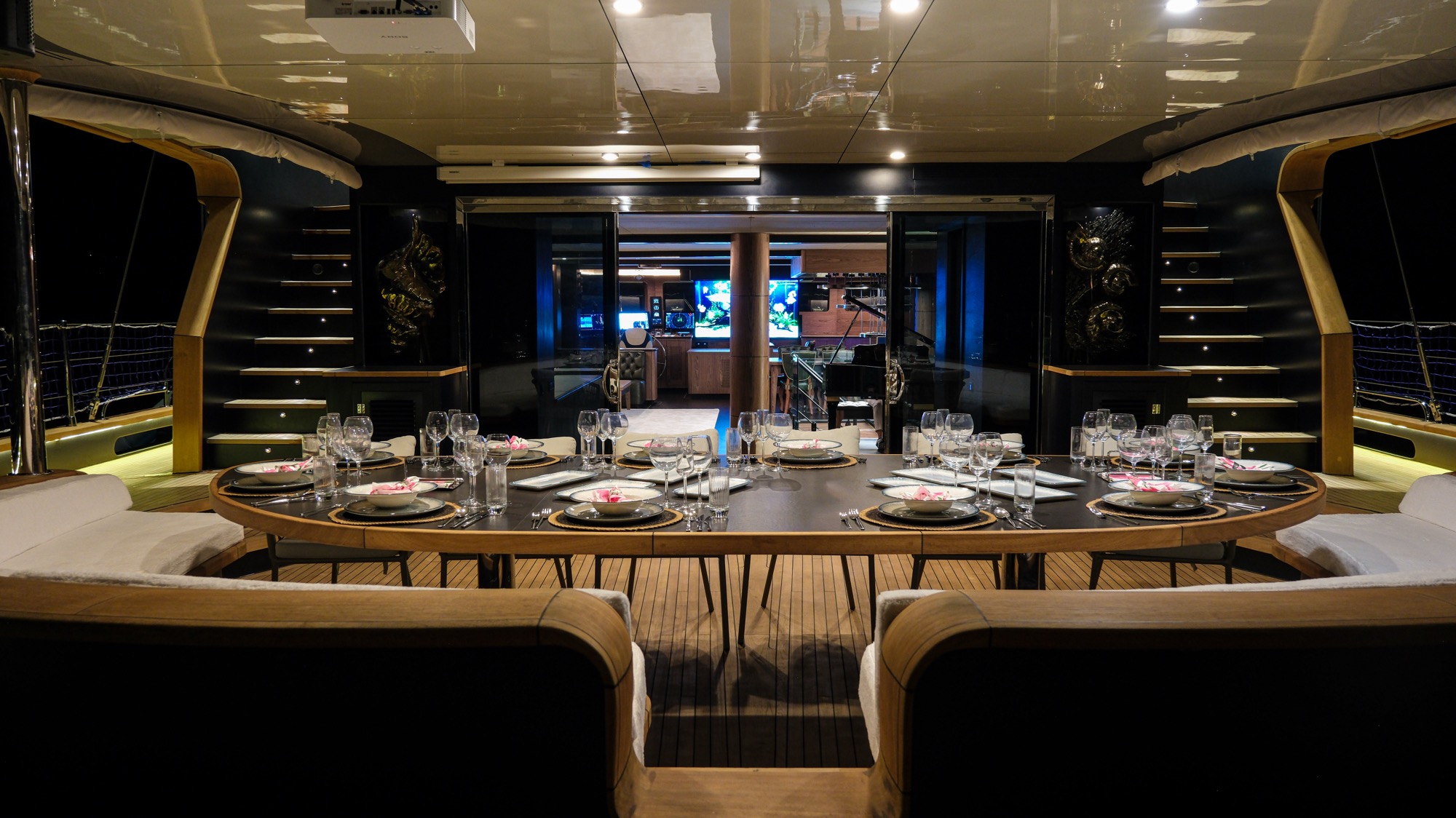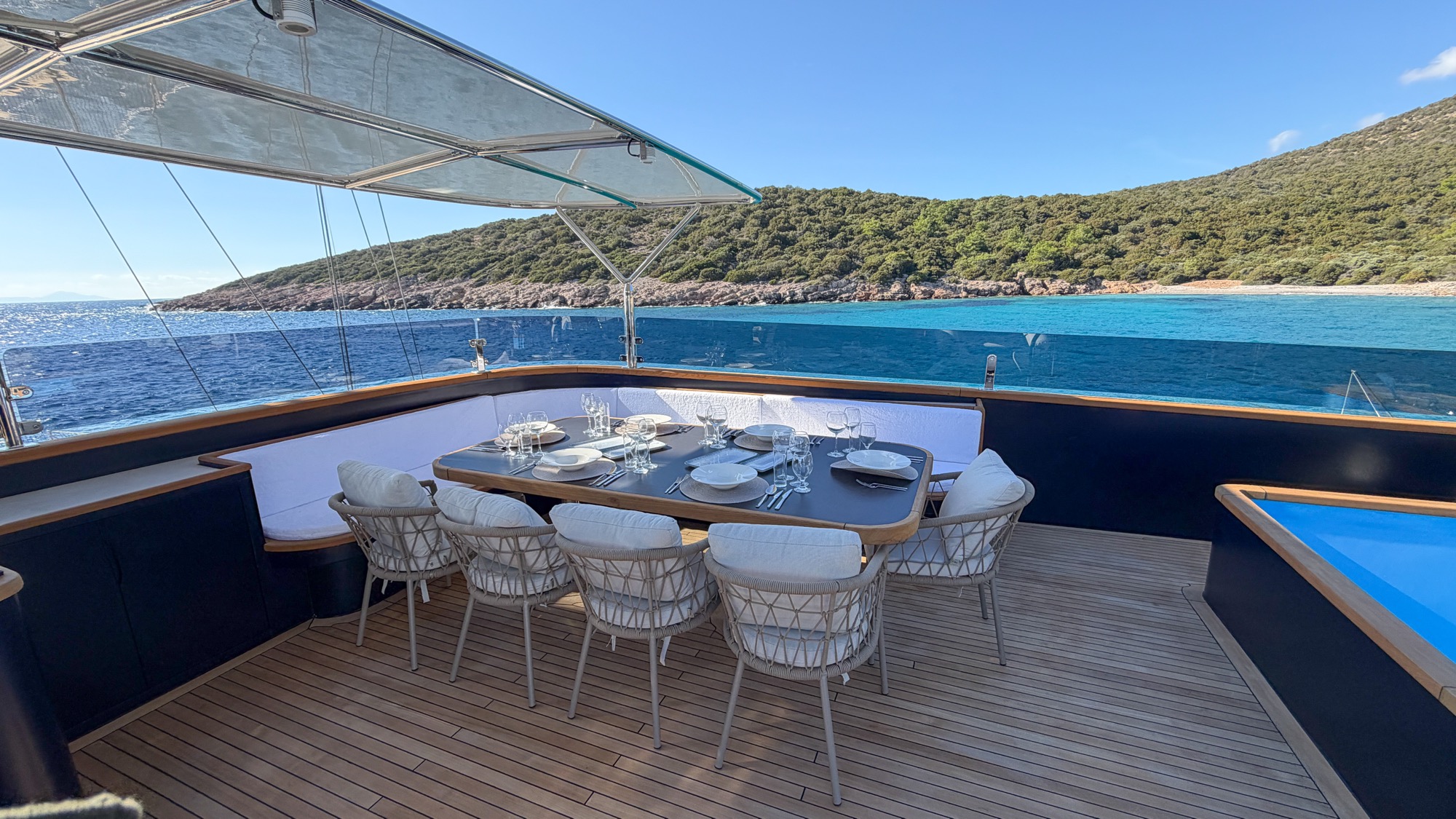 Outside, Oguz Khan is designed for relaxing in the sun. The top deck has a large Jacuzzi with massage jets, surrounded by sunbathing pads. There are multiple areas for "alfresco" (outdoor) dining, so you can enjoy breakfast or dinner with a view of the sea. A professional crew of 10 lives on board to handle everything from five-star service to navigating the yacht, ensuring a totally relaxed experience for you and your guests.
