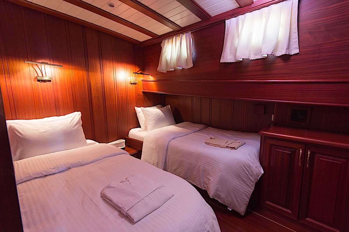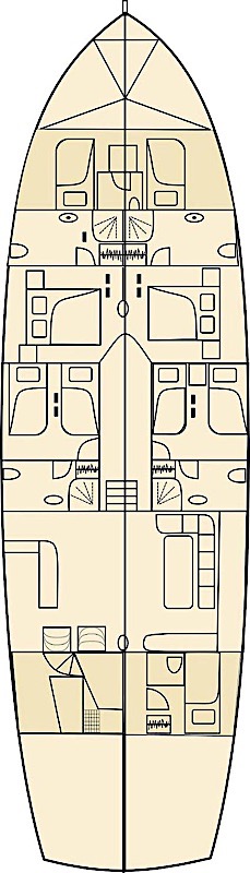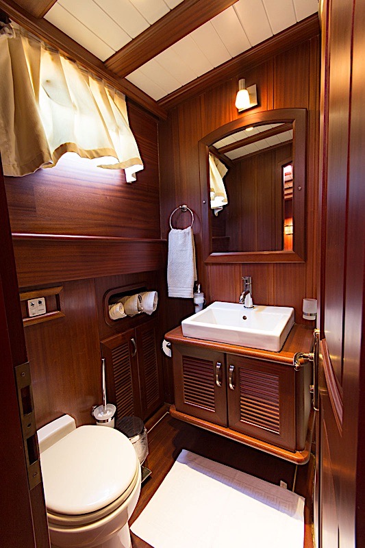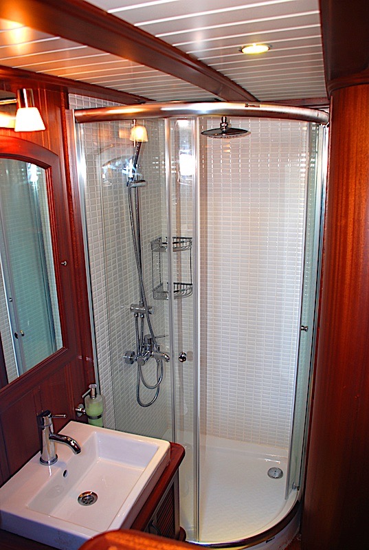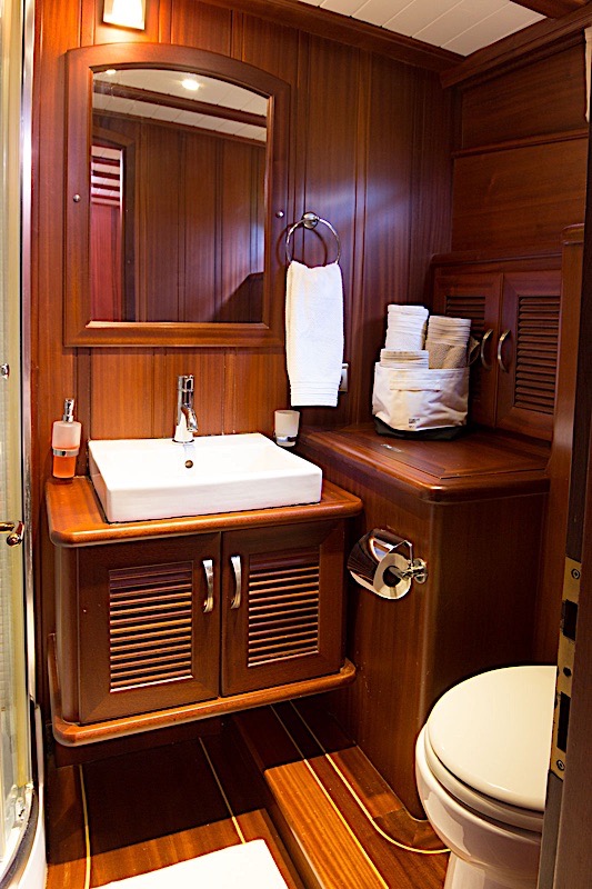 ATALANTE accommodates her guests in four beautiful cabins each with private ensuite, comfortable beds, good quality bed-linen and home-like decoration. Two double and two twin staterooms are located forward of the saloon. Berths in the twin cabins are convertible, thus two single beds can become a one double. As for the entertainment, each cabin features a TV, DVD, and a Satellite system. So whenever guests wish, they may watch a movie or simply navigate through various channels before heading to sleep, or check the news in the morning. And all this is available without the need to leave the bed.