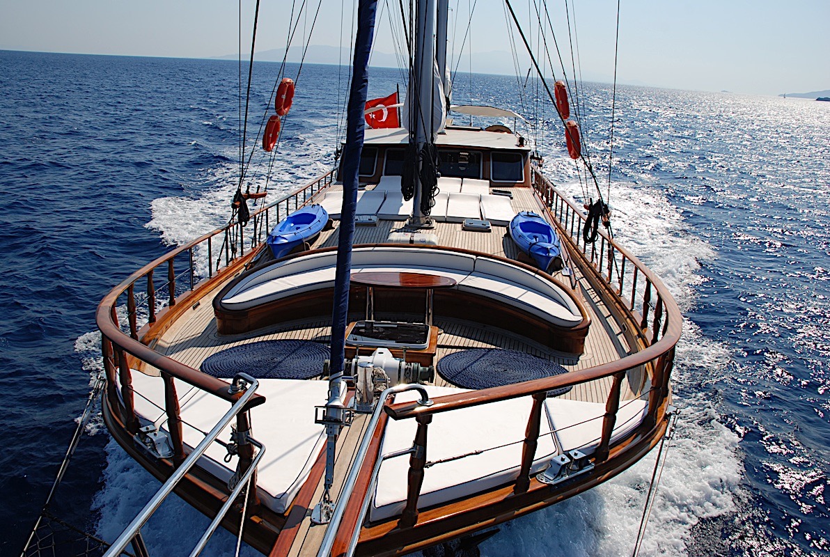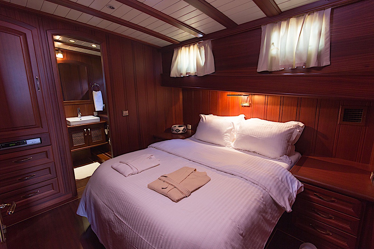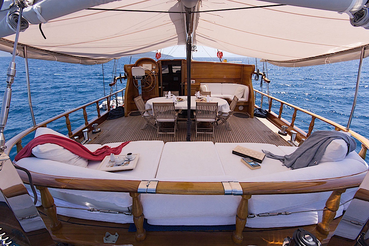 At the front part of the charter yacht guests will find a small coffee table and a couch perfect for the five o’clock tea time with home-made, in this case yacht made, snacks, variety of dried fruits and nuts, which are absolutely delicious in Turkey. Here you can also have an aperitif before dinner. However, this is also the place where you’d love to stay alone and feel deeply the rendezvous with the wind and sea salt reaching your skin from waves’ splashes, when the yacht is underway.