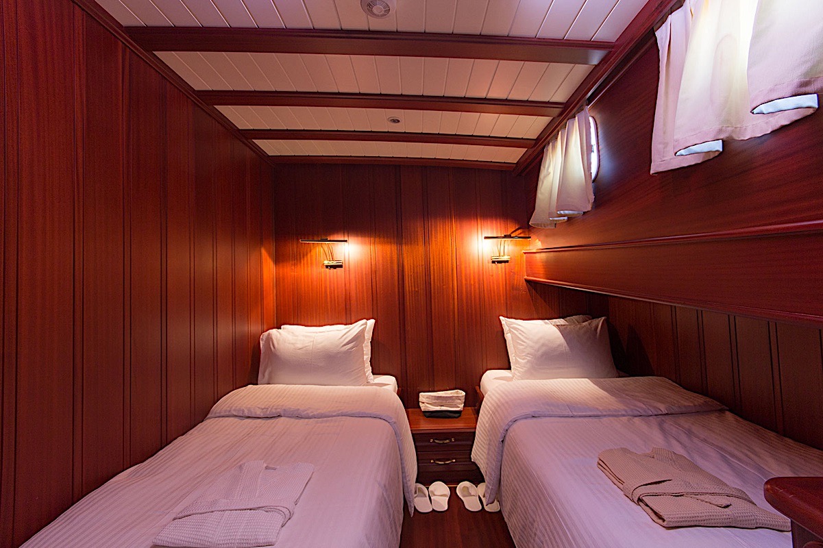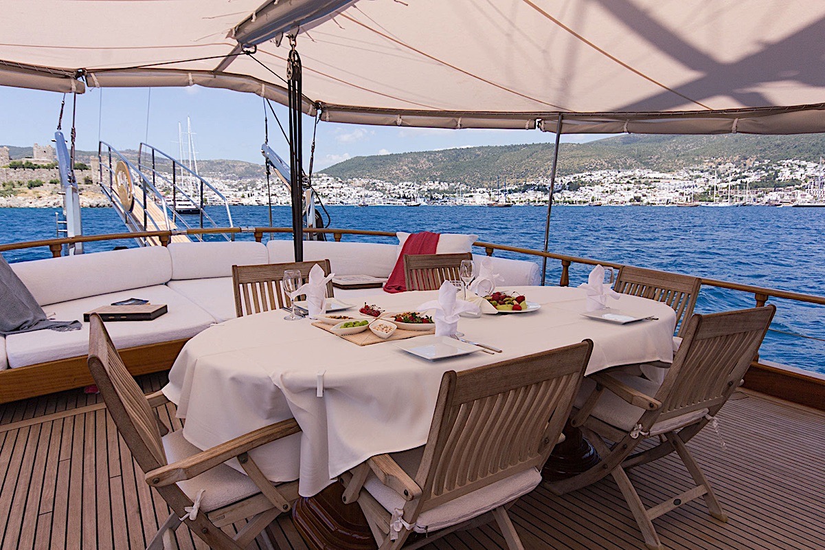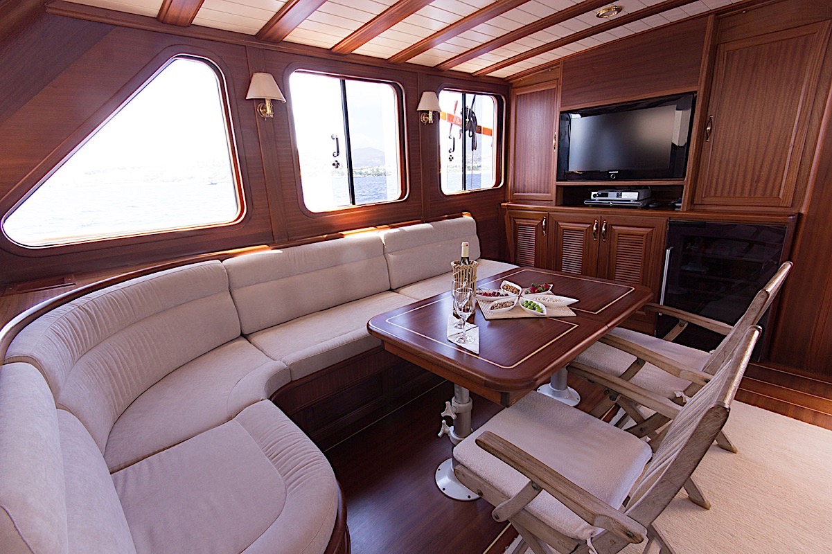 The yacht’s saloon is a pleasant place where it’s possible to repose from vitamin D, watch a movie or some entertaining program, play board games, or have a tea time with snacks prepared by the chef. If the weather is not in the mood, then dining can be easily moved from the aft deck to the salon. However, southwestern coast of Turkey is one of the sunniest places at least from May until October. The weather grizzles very rarely here during the season.