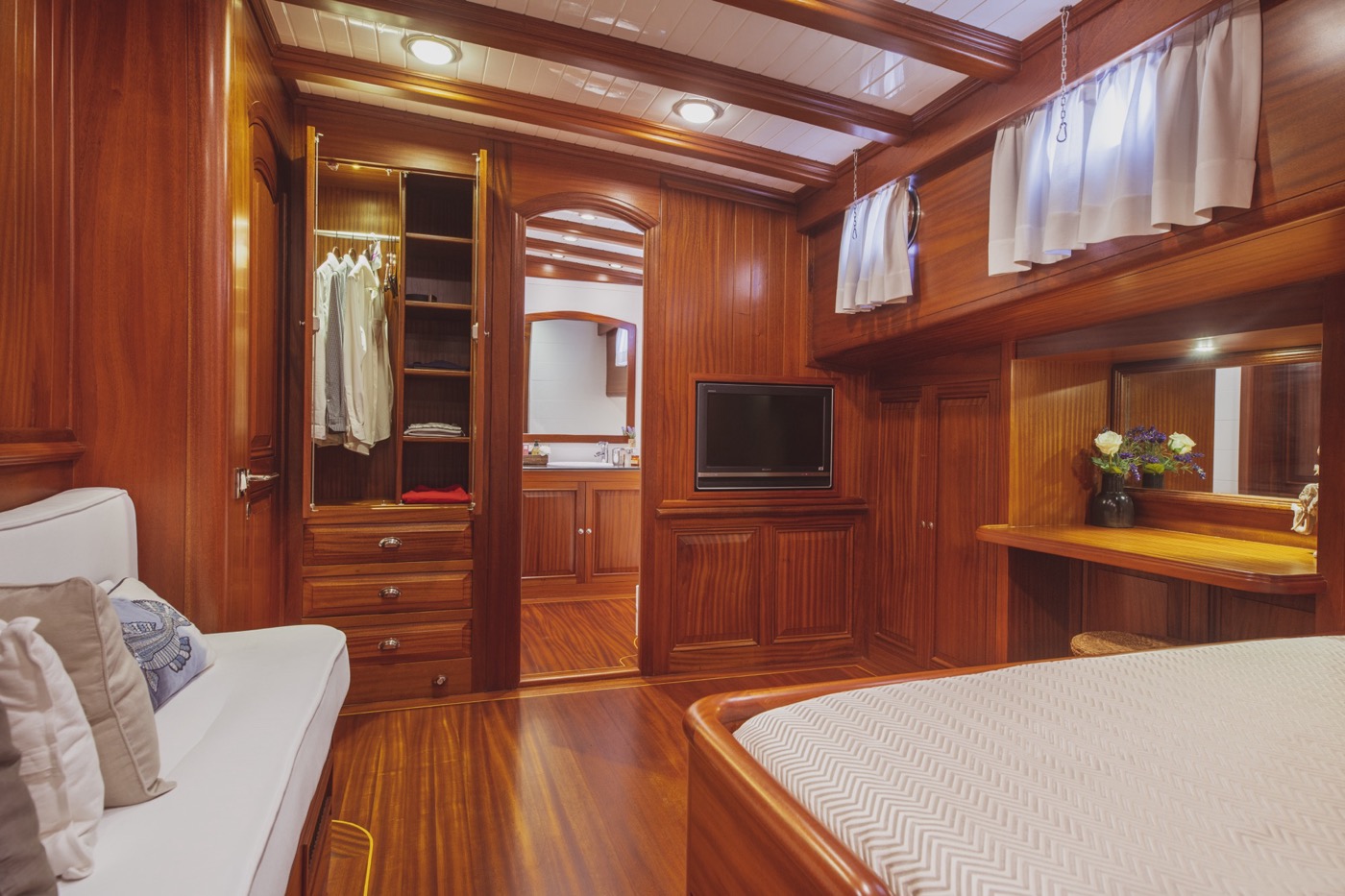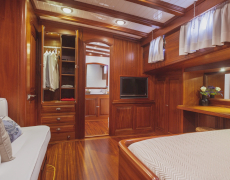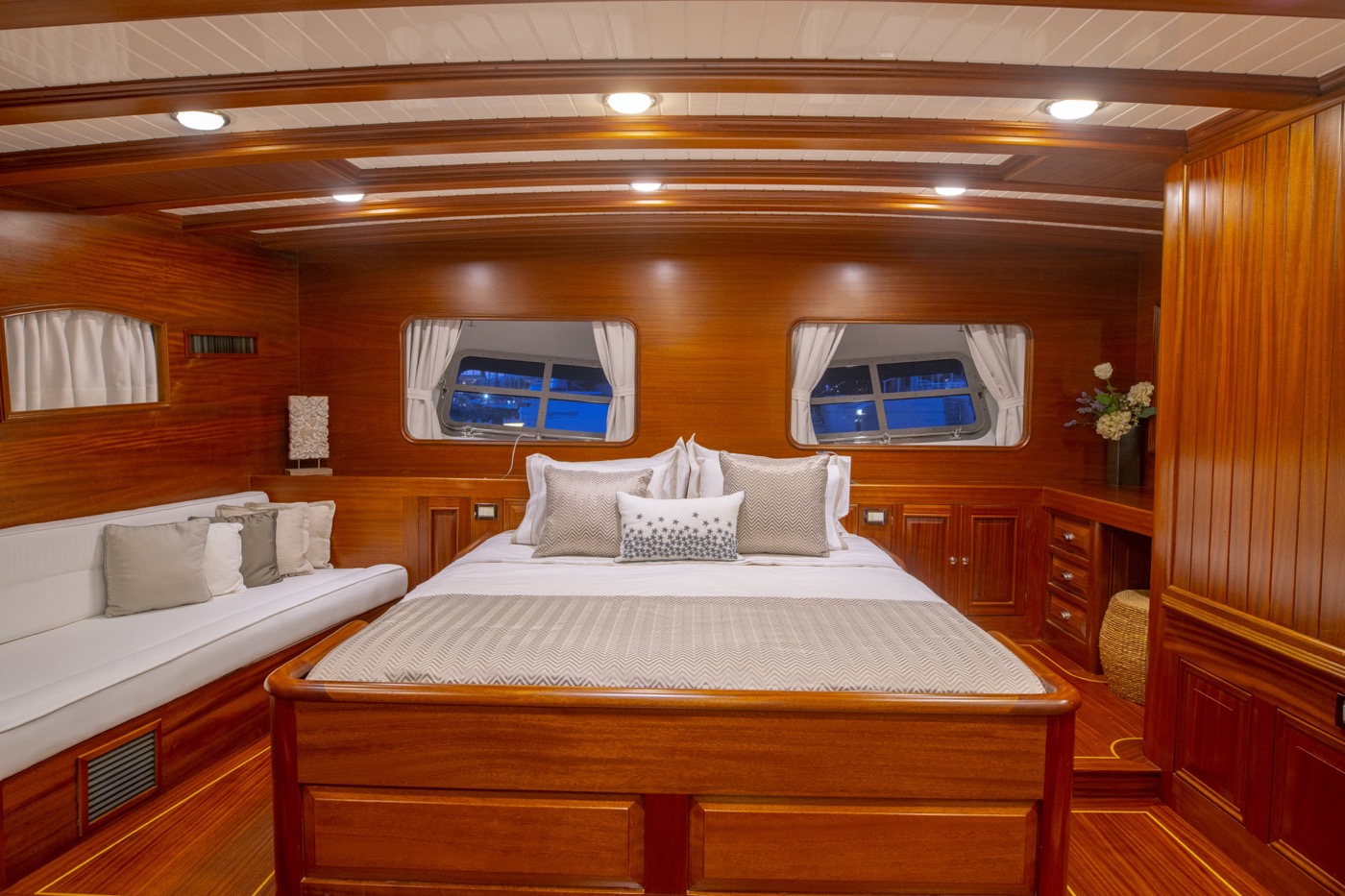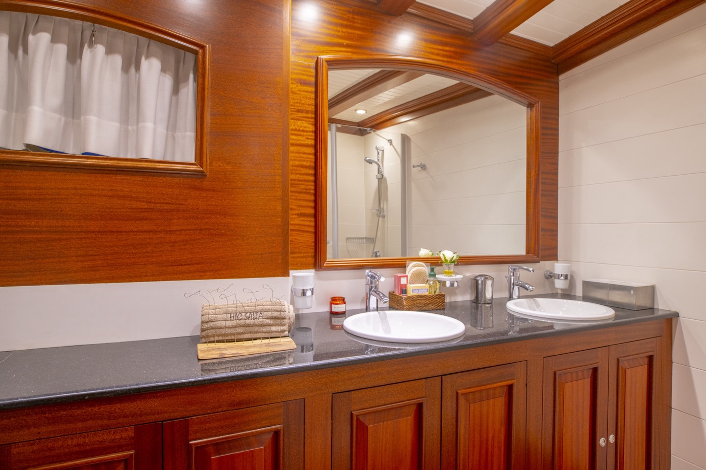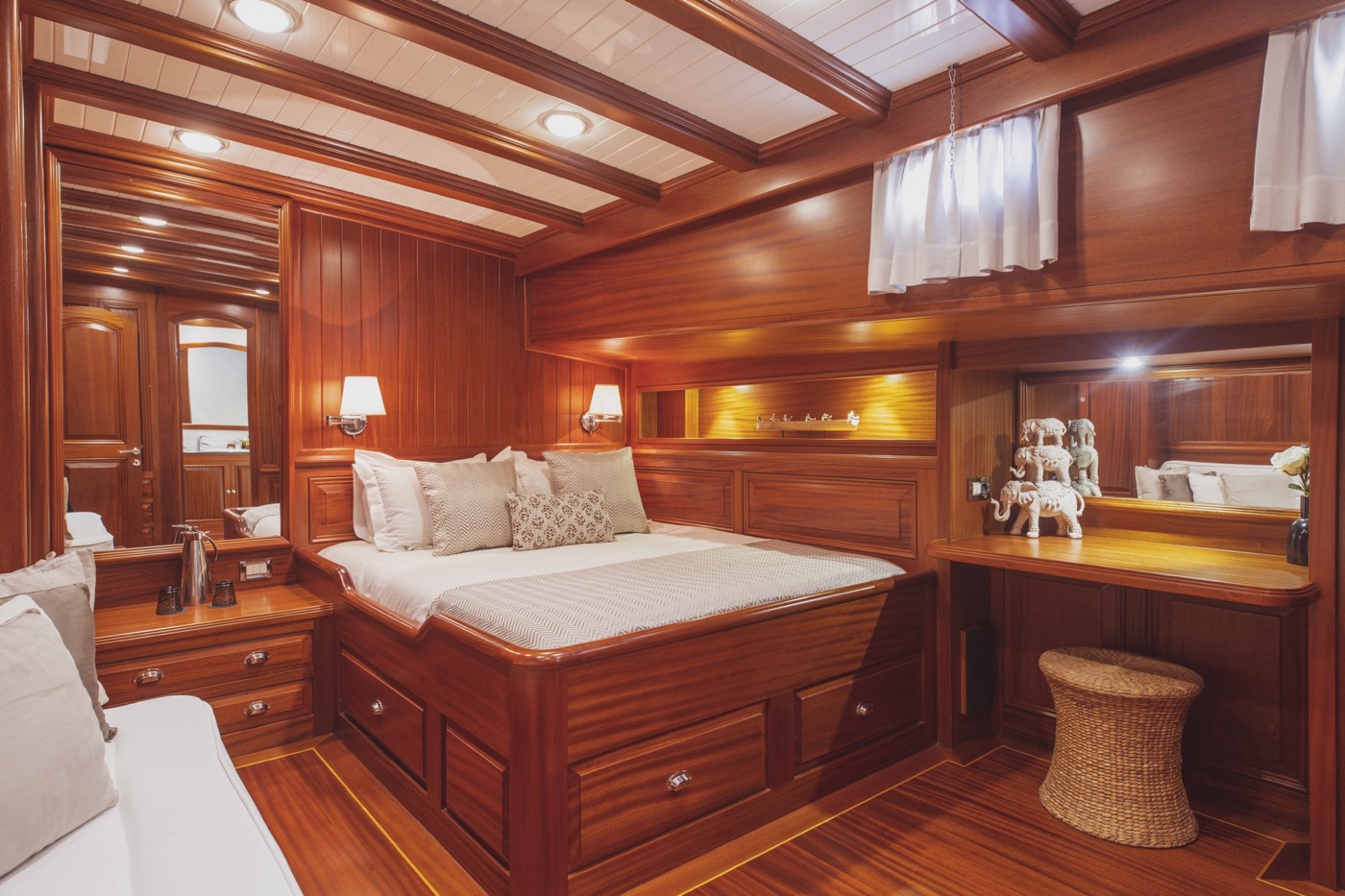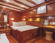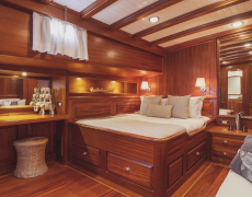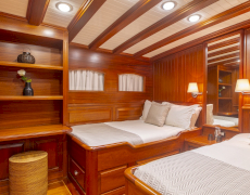 HIC SALTA offers stylish accommodation for up to 10 guests in 3 double and 2 twin ensuite cabins. All cabins are beautifully appointed with paneled mahogany joinery and doors. Each cabin is served by individually controlled air conditioning and heating. The gulet is also capable of carrying up to 7 crew to ensure a relaxed, and very luxurious charter experience.