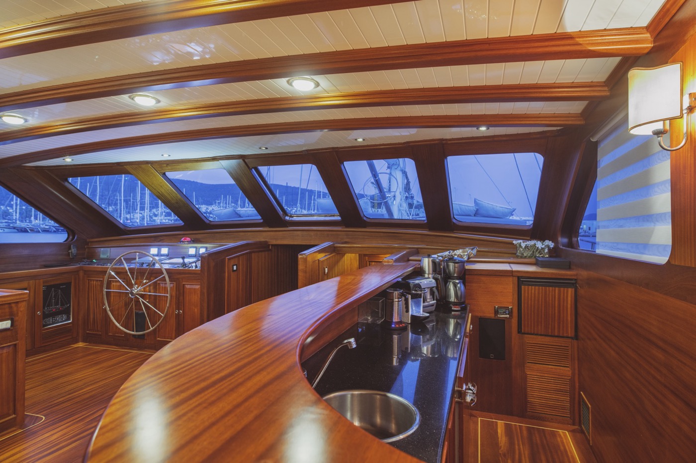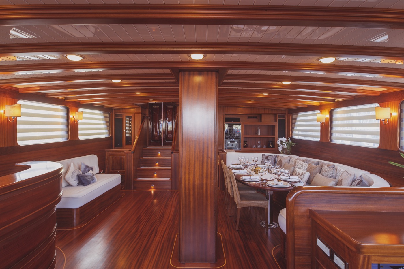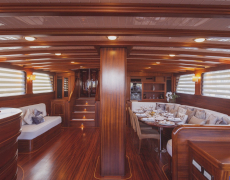 HIC SALTA's deck lounge features a bar, library, TV, home theatre system, and an audio corner. There is space here for dining indoors, although most of the activities take place on the deck and especially around the shaded aft deck, fitted with comfortable lounging area behind a partially-enclosed dining area which was designed in order to offers guests additional privacy while dining in port.