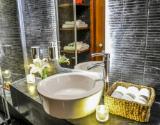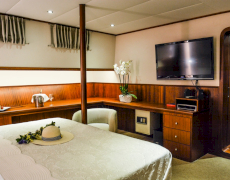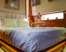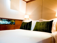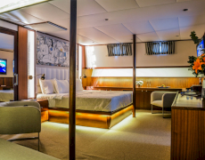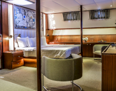1 Master Suite (with large sofa) & 4 double guest cabins (Master cabin with king sized bed, 4 equal double guest cabins with queen sized bed each)
