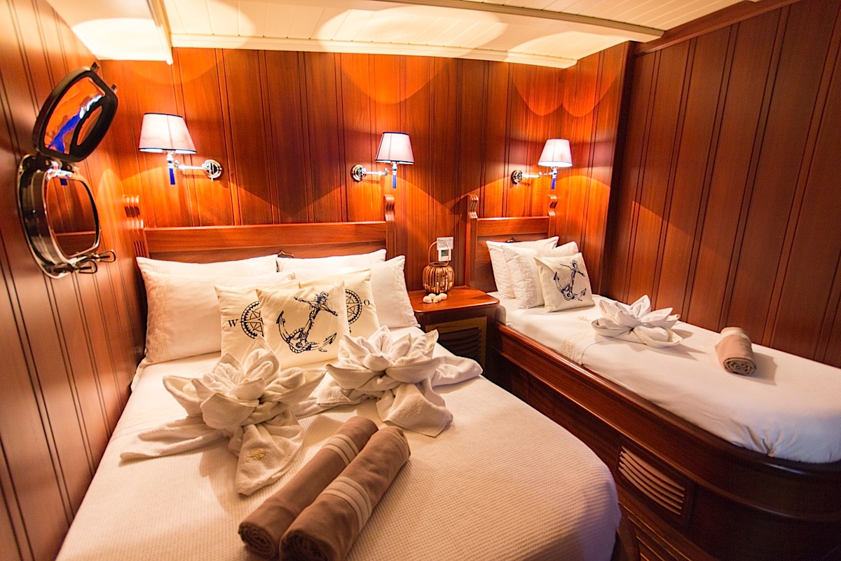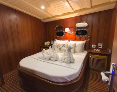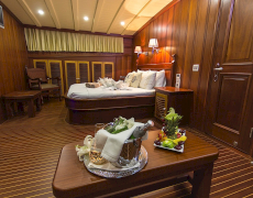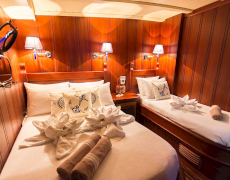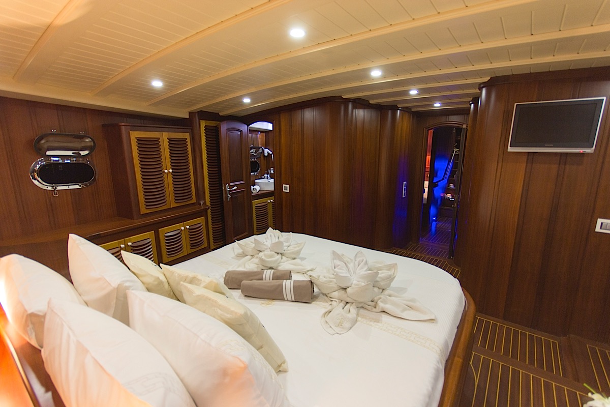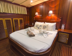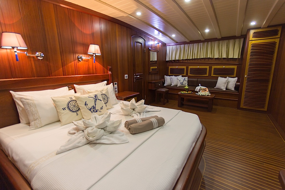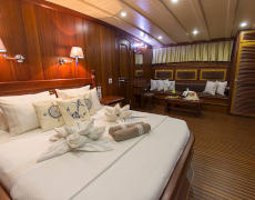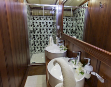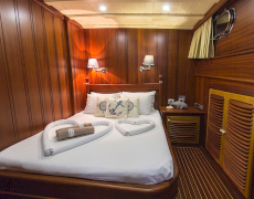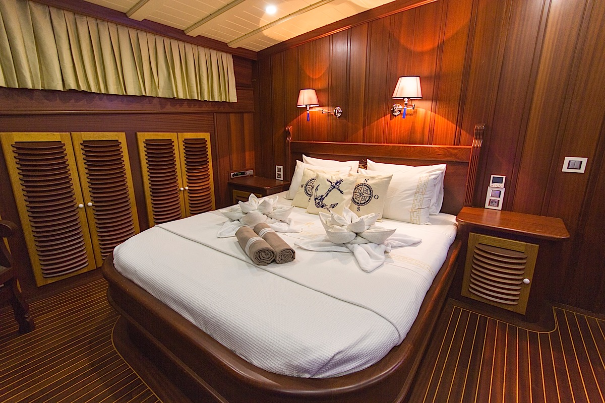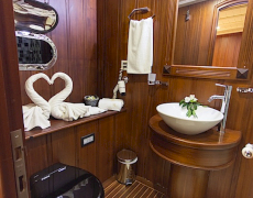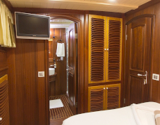PRINCESS KARIA II's air-conditioned accommodation is in six cabins. Two of these cabins are extra roomy master cabins, each with their own entertainment systems and large en suites – one of which is fitted with a Jacuzzi tub. There are two double cabins and two twin cabins – all of which are of a good size, have a roomy en suite bathroom, opening portholes, an entertainment systems and storage space aplenty.