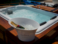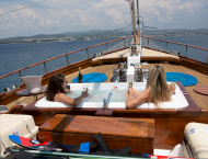 Stepping outside, the forward deck features a roomy Jacuzzi tub which can be enjoyed while the yacht is underway. Here, guests may choose to relax and unwind under a warm Adriatic sun. Once DOLCE VITA's guests have enjoyed all there is to do ashore as well as spent time attending to their leisure pursuits and watersports activities, the aft deck becomes the centre of on board activity. Here there is a large alfresco dining area with beautifully varnished mahogany table, teak chairs and adjacent lounging area.
