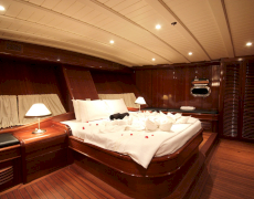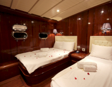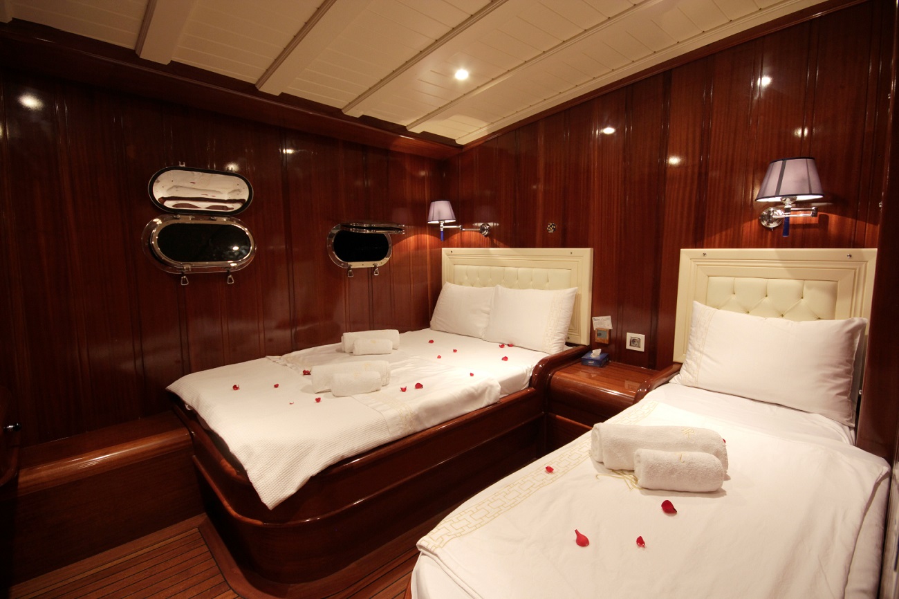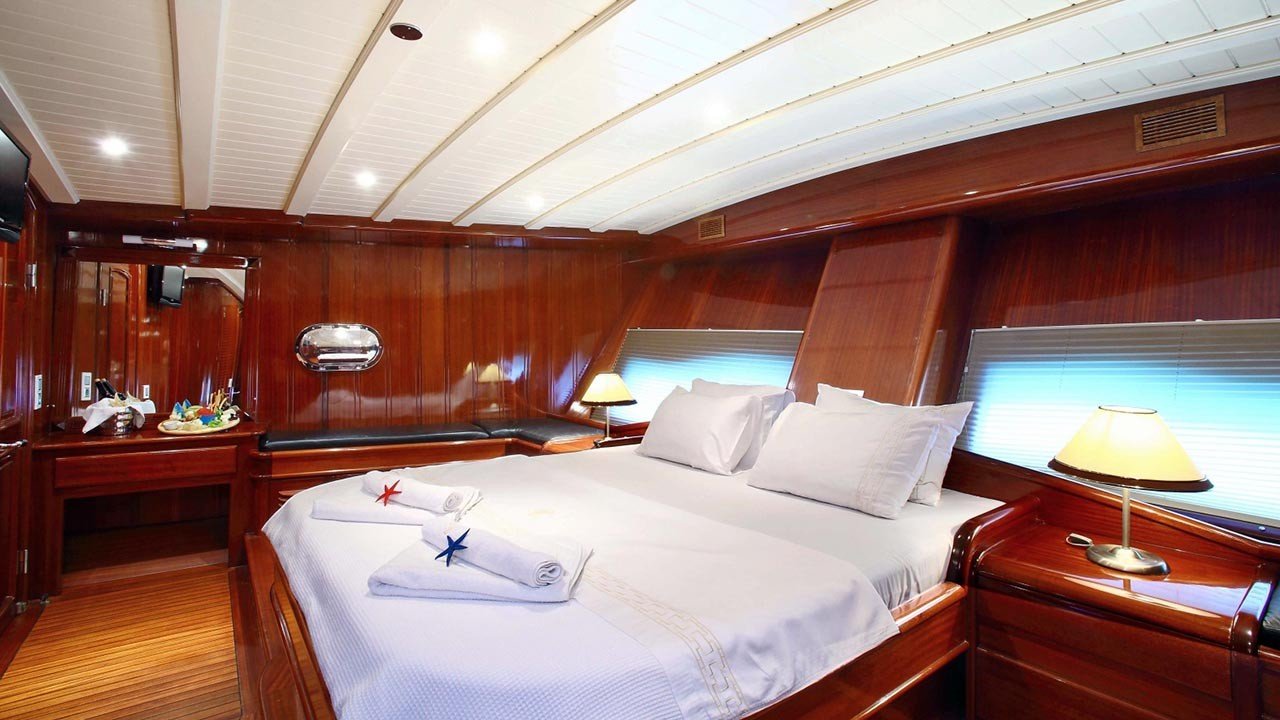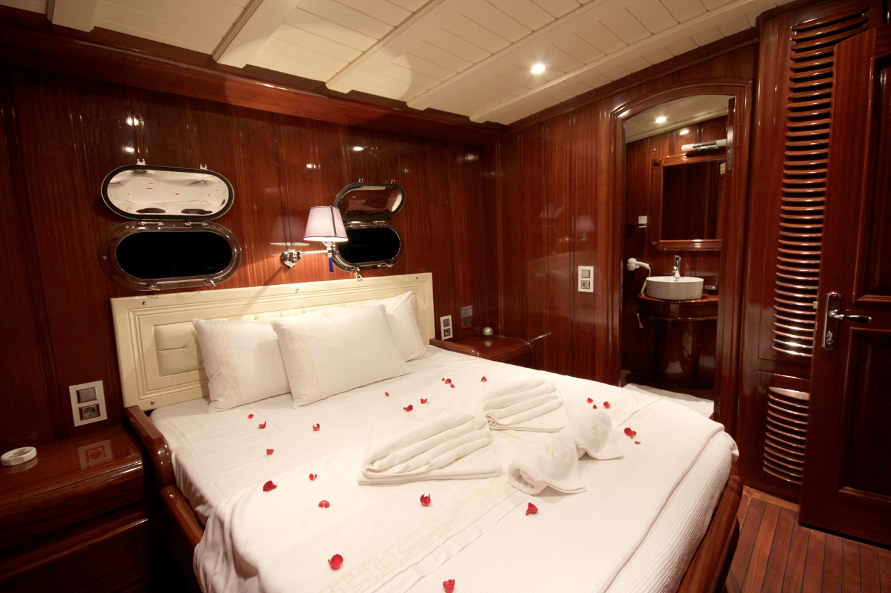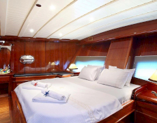 Мастер-каюта на борту яхты KAYA GUNERI PLUS занимает всю ширину кормовой части судна, а это значит, что она очень вместительная. Однако, в арсенале KAYA GUNERI PLUS не одна, а две мастер-каюты. Вторая - также очень просторная и расположена во всю ширину судна. Также имеется две двуспальные каюты и две одинаковые каюты-твин. В каждой есть отдельная ванная комната и достаточно пространства, чтобы вместить все личные вещи гостей.