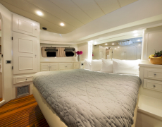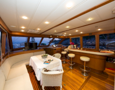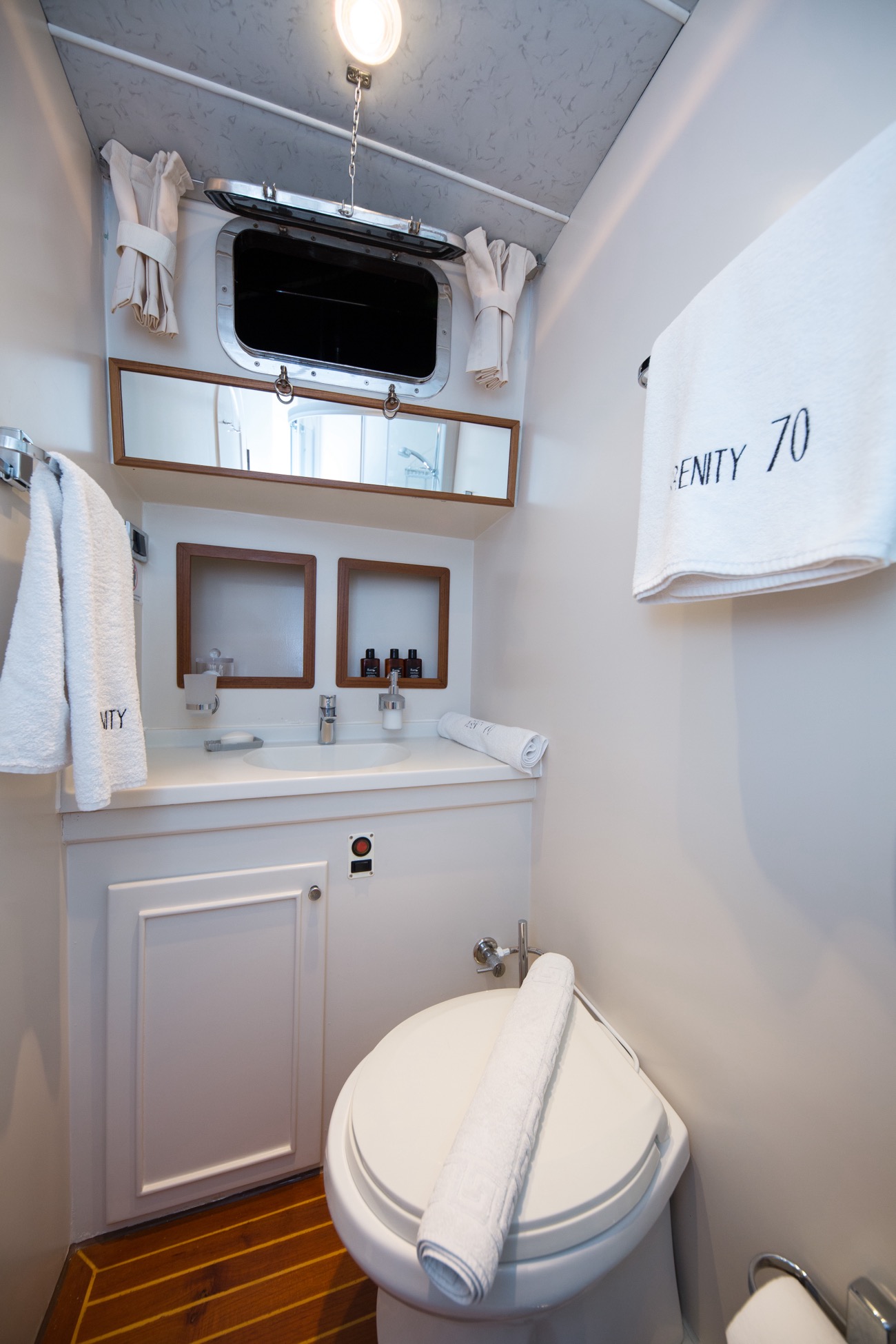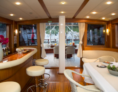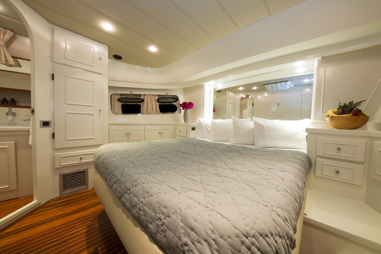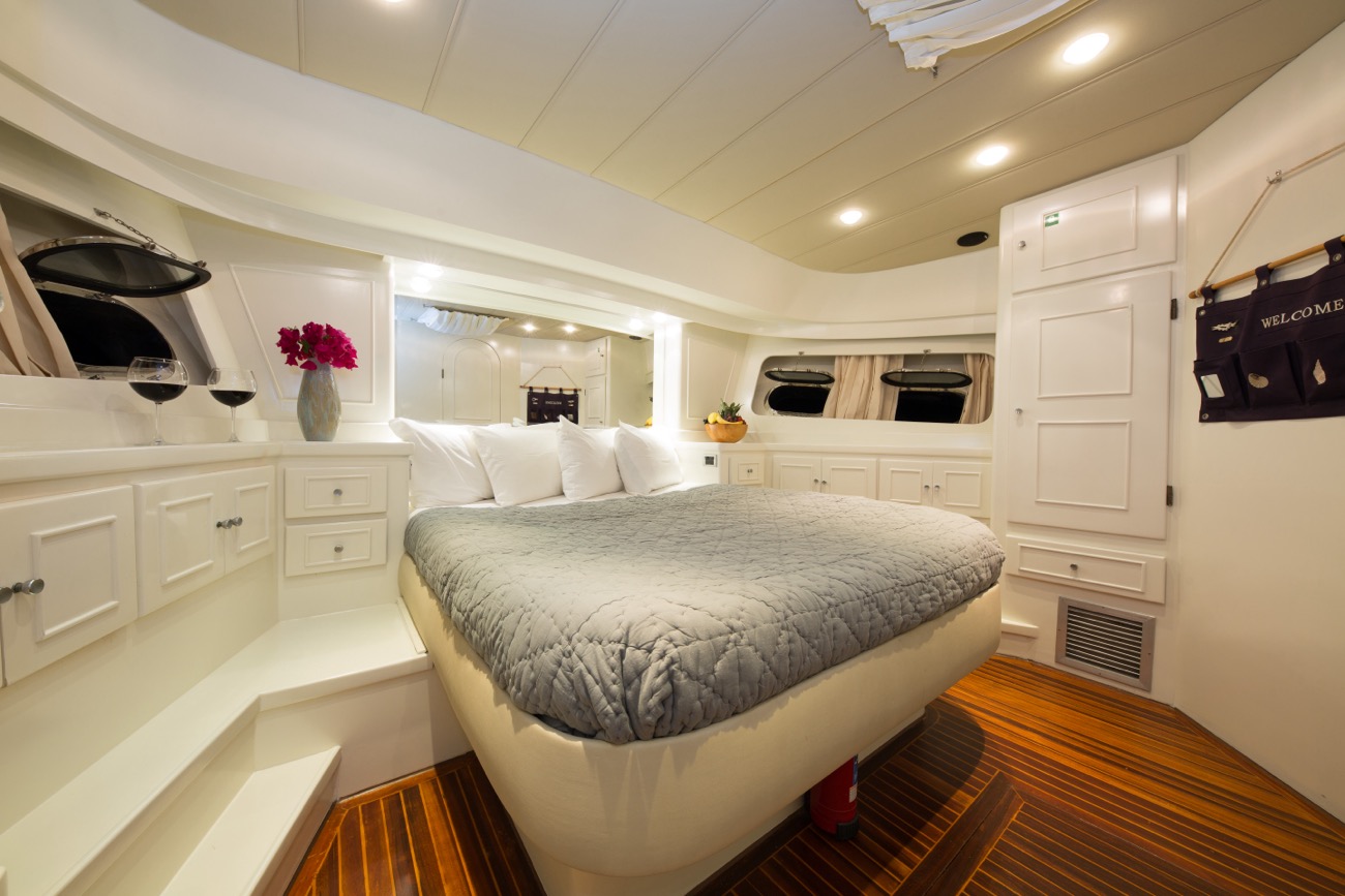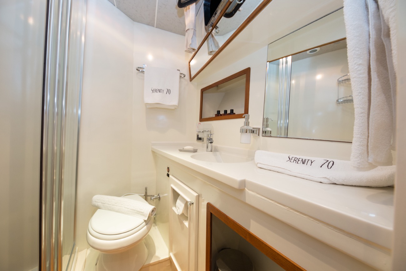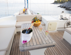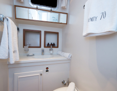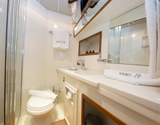 Длина яхты SERENITY 70 - 21 метр. При этом на её борту размещается 6 гостей в трех каютах. Это мастер-каюта, VIP кабина и одна двуспальная каюта.