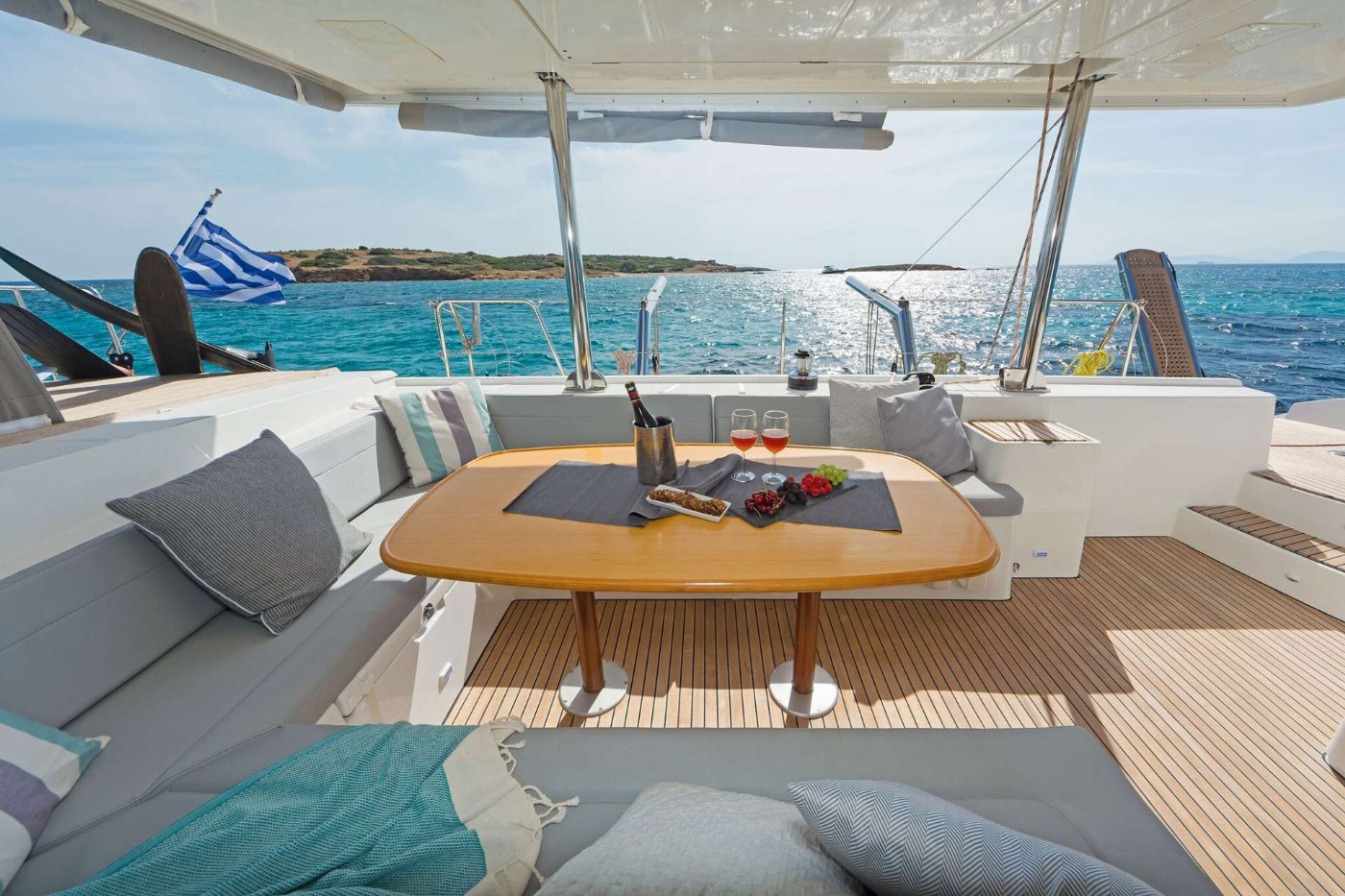 Teak afterdeck with 10 person dinner table