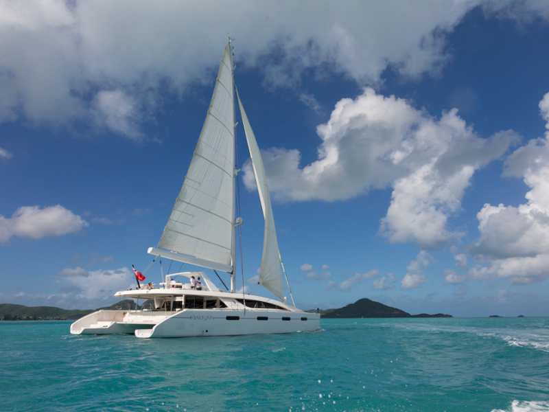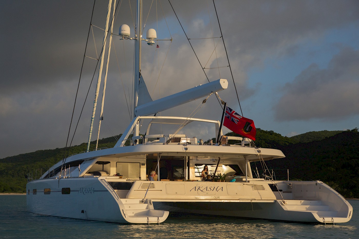 The level of comfort offered by a catamaran is undoubtedly the best on offer in terms of sailing yachts. Among the most spacious and luxurious is the futuristic catamaran, AKASHA. It is possible to say that luxury cruising in the Caribbean has been taken to a whole new level with this beautiful, contemporary design that is 76 feet in length with an impressive 39 foot beam (width) — all of which enables her 10 guests to be perfectly comfortable and at ease at all times, finding a quiet place of their own on board if they so desire.