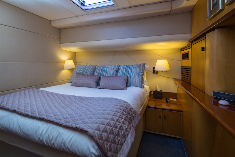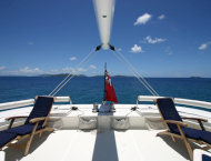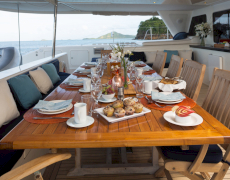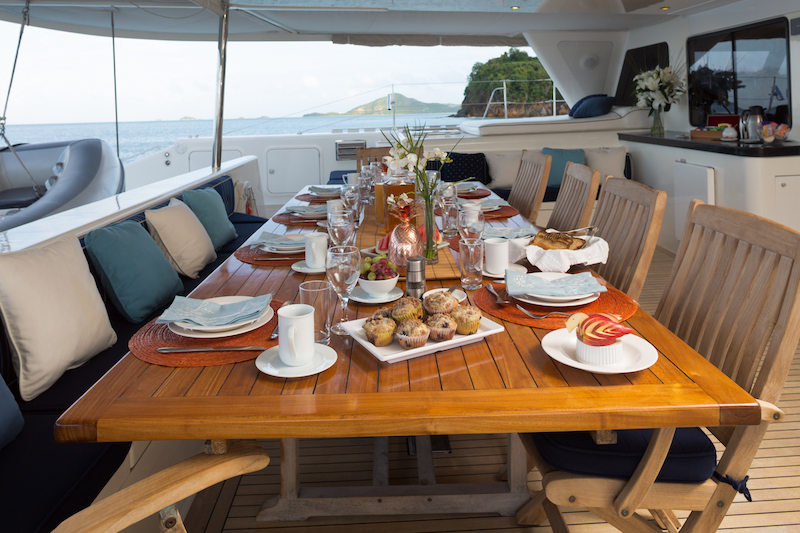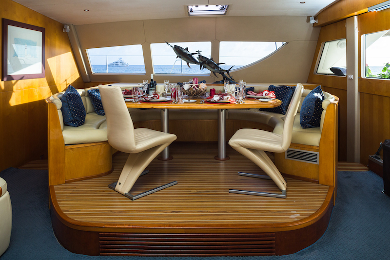 The yacht’s cockpit area is among the most popular spots to gather. Meals are served at a large teak dining table which seats 10 for al fresco dining. Within close range are a comfortable cushioned seating area as well as two large double mattresses — all in all, it’s a place that shady and close to the galley for the service of delicious, healthful meals and afterwards, guests can stretch out and relax as the yacht rises and falls gently and rhythmically, and those in need of relaxation find that there’s no place they would rather be.