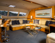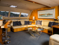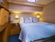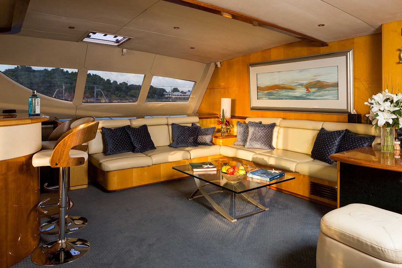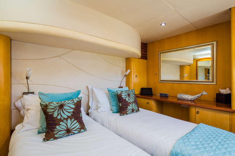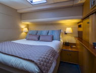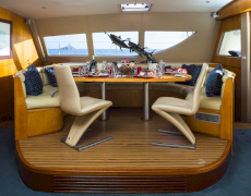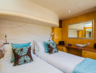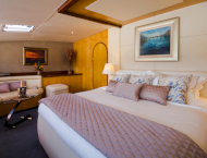 Guests are accommodated in one master cabin, which offers panoramic views from windows which span the width of the yacht, and four double ensuite cabins with queen-size berths. Of these four cabins, one can be converted into a twin. Cabins are well-equipped, so much so, that you will feel that you are staying aboard a luxury hotel, complete with some incredible works of art… sprinkled throughout the yacht in such a tasteful way!