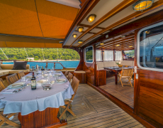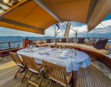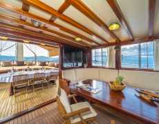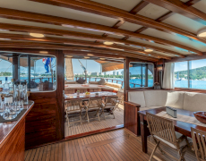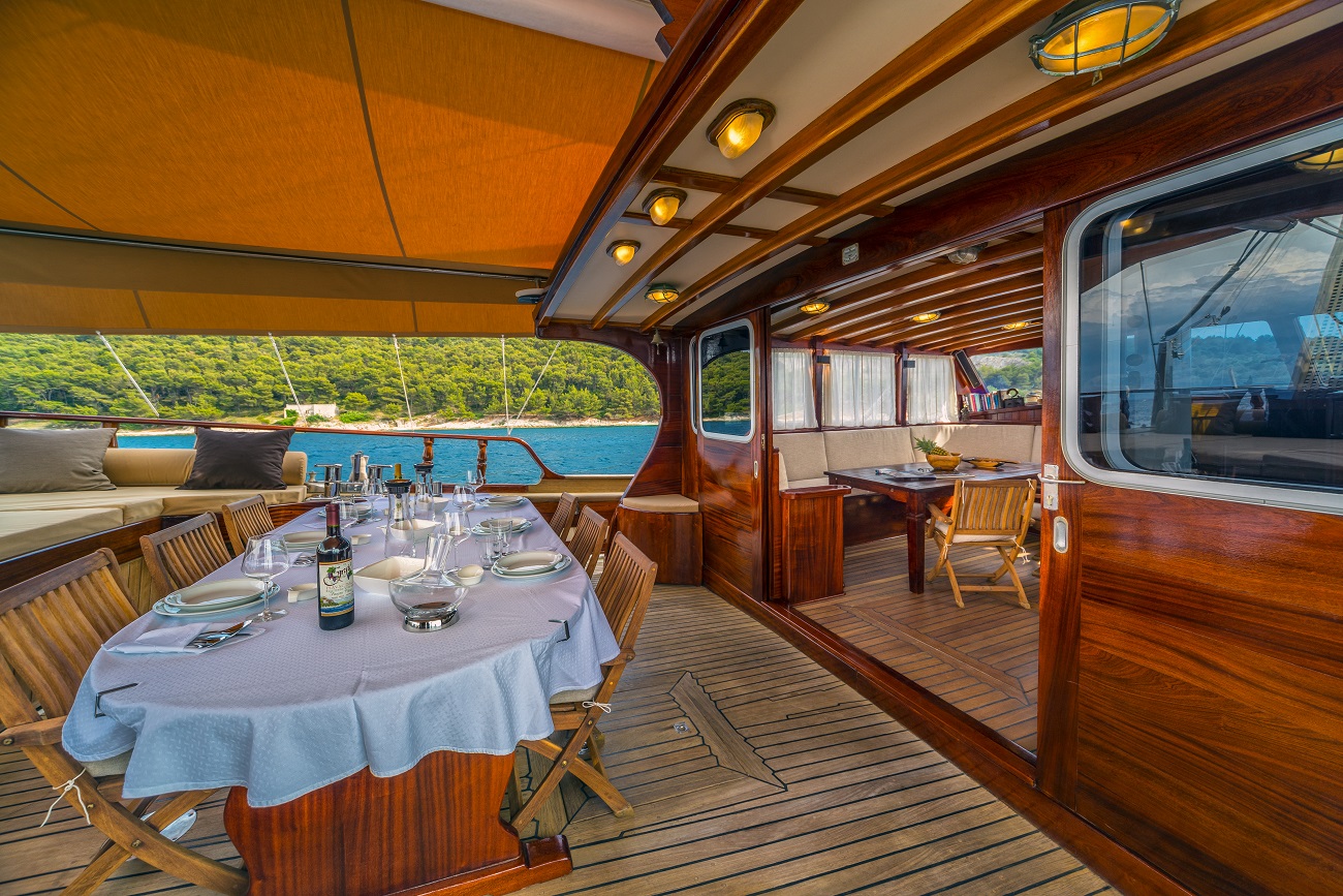 You will enjoy the yacht’s salon. It is a cosy living space that features music and TV systems, a settee and a bar. If the weather is capricious, dining takes place inside the salon. Otherwise there’s a beautiful option aft deck with a big table for 10 guests.
