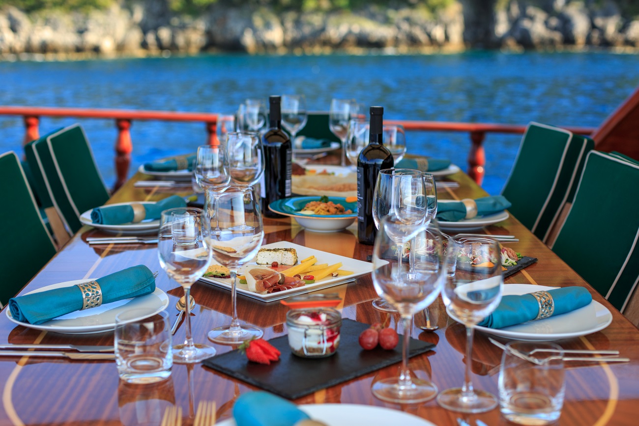 A rounded coffee table with surround seating at the bow of the yacht invites you to sit in the sun with friends for morning tea, a snack or 5 o'clock tea... and perhaps linger a while after your late afternoon swim to sip a cocktail at the end of the day. Alternatively, you could lay out on the sun deck and sunbathe while you read a book. Thre's something very attractive about the shaded aft's comfortable cushioned lounging area -- enjoy sitting with legs outstretched after a sumptuous breakfast around the aft deck dining table and enjoying your coffee overlooking the water. Sitting around and chatting after meals taken around the aft deck's dining table becomes one of the biggest highlights of the cruise.... just as dining on fresh and delicious cuisine, prepared to your liking by your talented chef, is the source of unmeasurable joy and satisfaction. The chef, a local lad from the Aegean, prides himself on creating hearty and wholesome meals from age-old Mediterranean recipes.