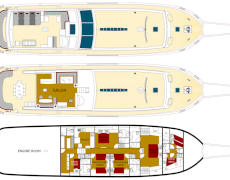 1 forward master cabin with king size bed, 1 port VIP cabin with queen size bed, 2 starboard equal sized twin cabins adjustable to king size beds.