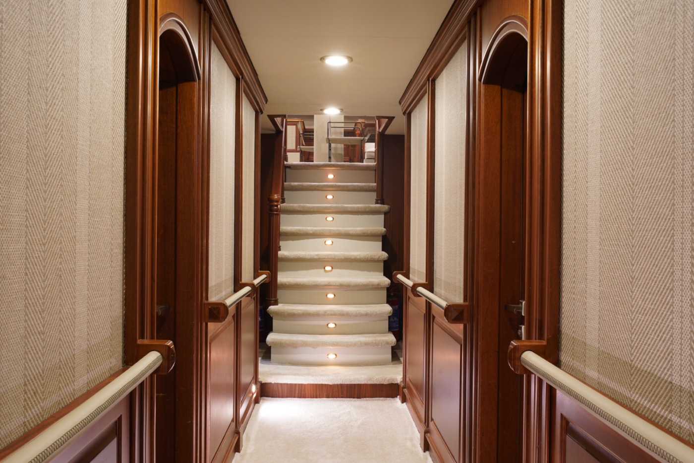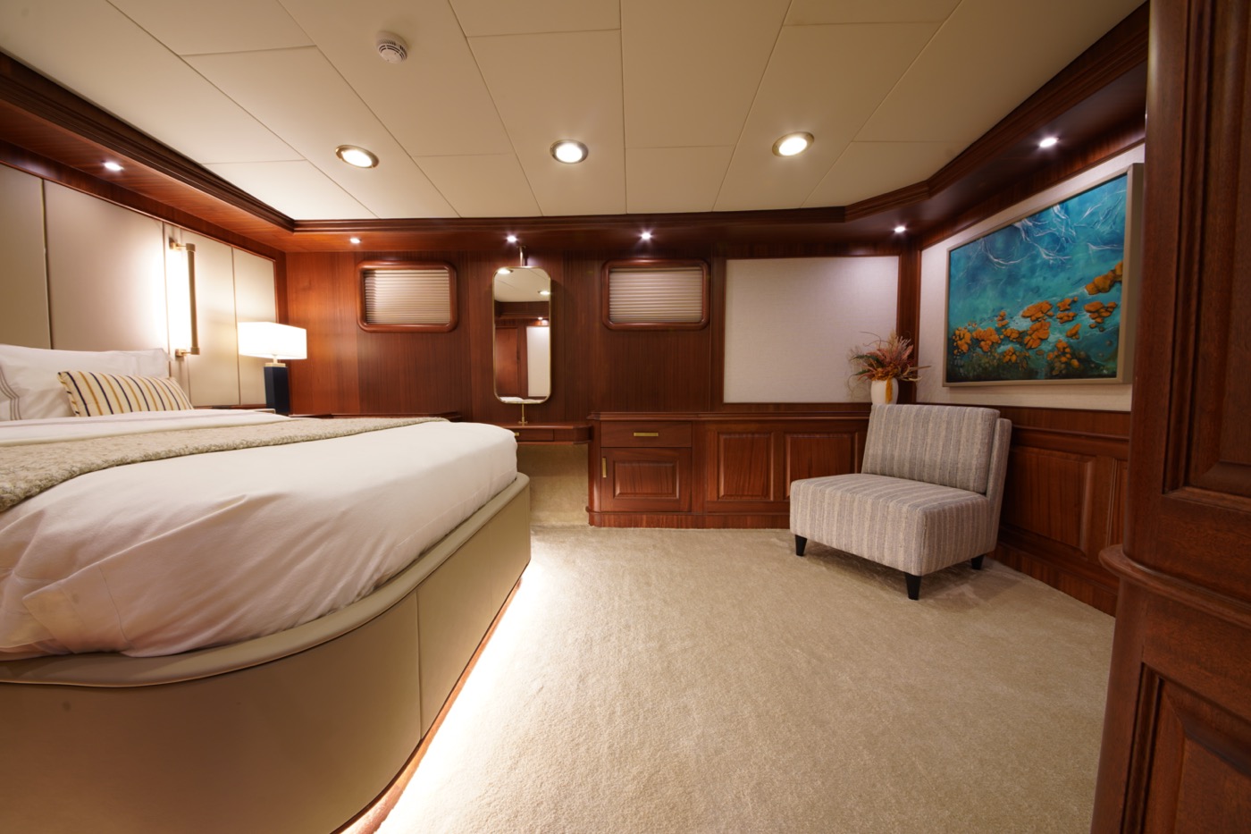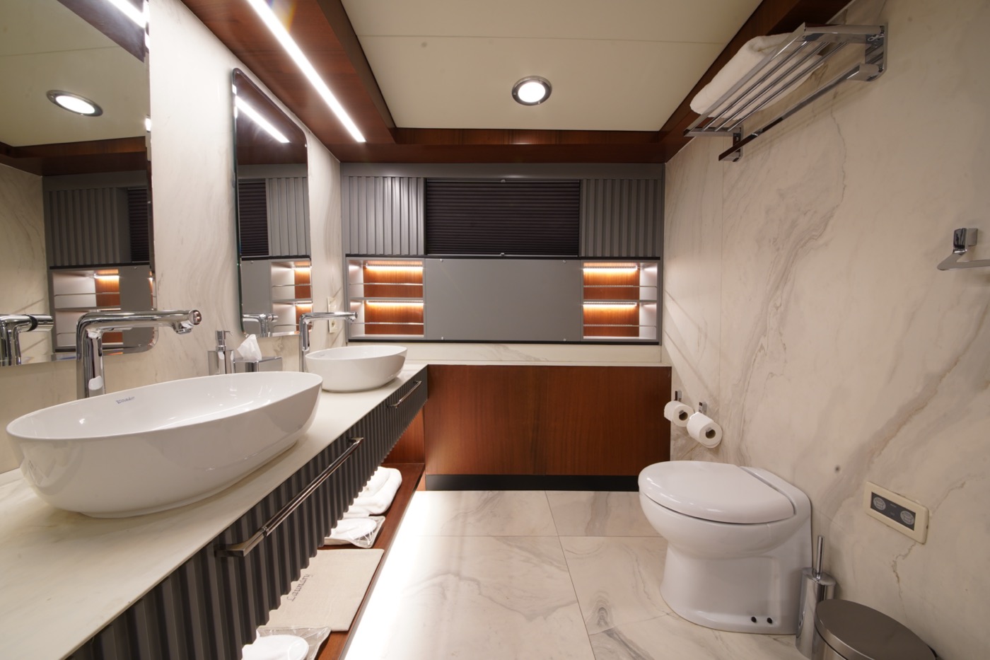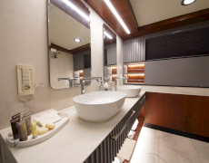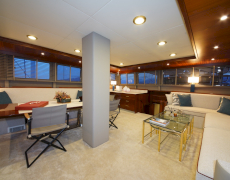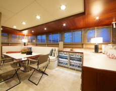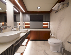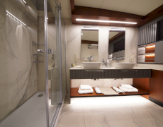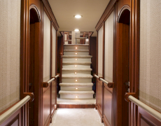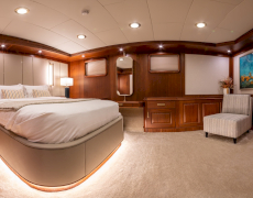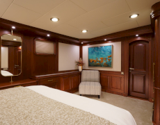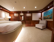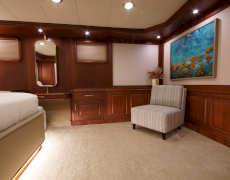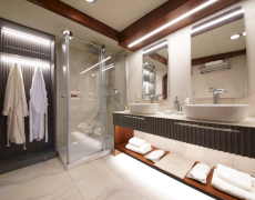During private boat charter MARE NOSTRUM accommodates a party of 12, although as many as 16 guests can dine around a beautiful inlaid al fresco dining table, situated amidships alongside the yachts main bar. This design makes for a pleasant "social hub” right in the centre of the yacht, where guests can gather for meals before going their separate ways to sunbathe, swim or read on the aft deck. Twelve guests are accommodated in 6 cabins, five with a double berth and one with twin singles. This layout has its advantages in that each of the five double cabins is of a comparable size.