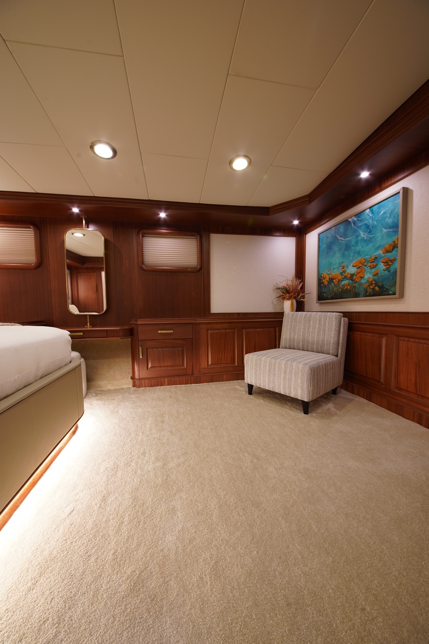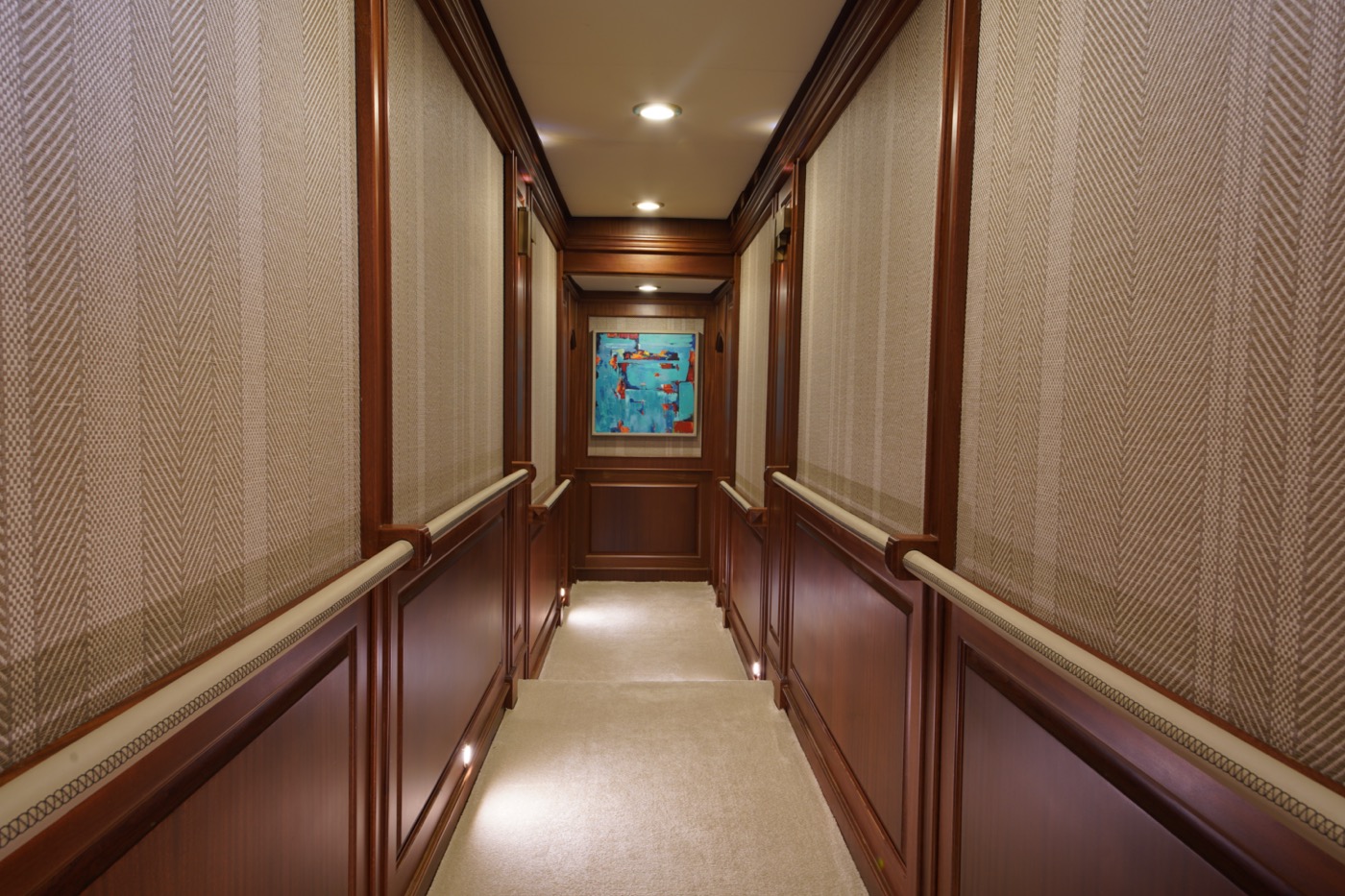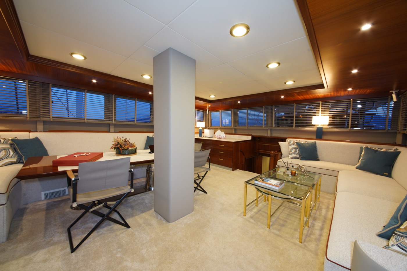 During private boat charter MARE NOSTRUM accommodates a party of 12, although as many as 16 guests can dine around a beautiful inlaid al fresco dining table, situated amidships alongside the yachts main bar. This design makes for a pleasant "social hub” right in the centre of the yacht, where guests can gather for meals before going their separate ways to sunbathe, swim or read on the aft deck. Twelve guests are accommodated in 6 cabins, five with a double berth and one with twin singles. This layout has its advantages in that each of the five double cabins is of a comparable size.