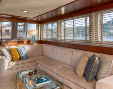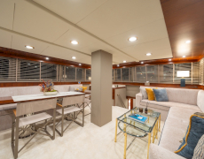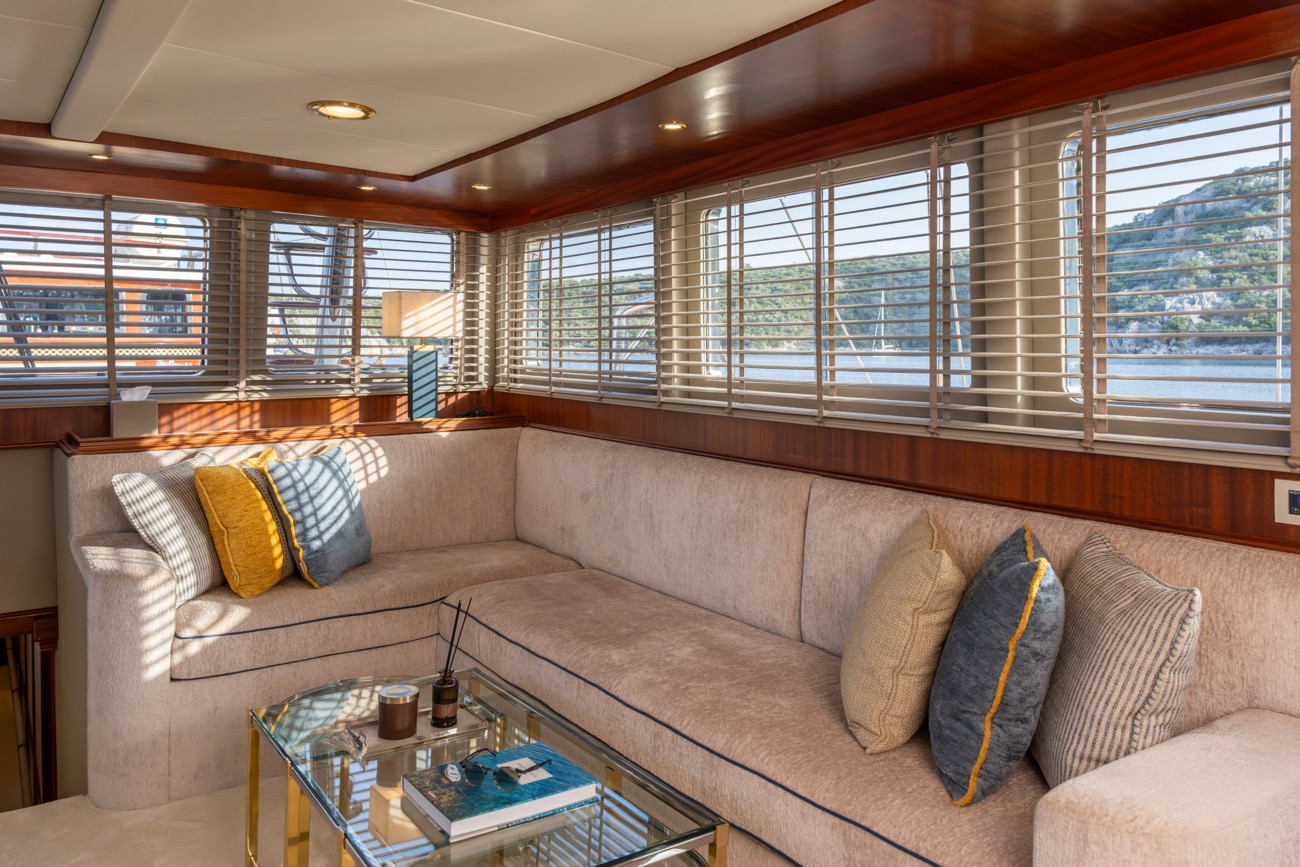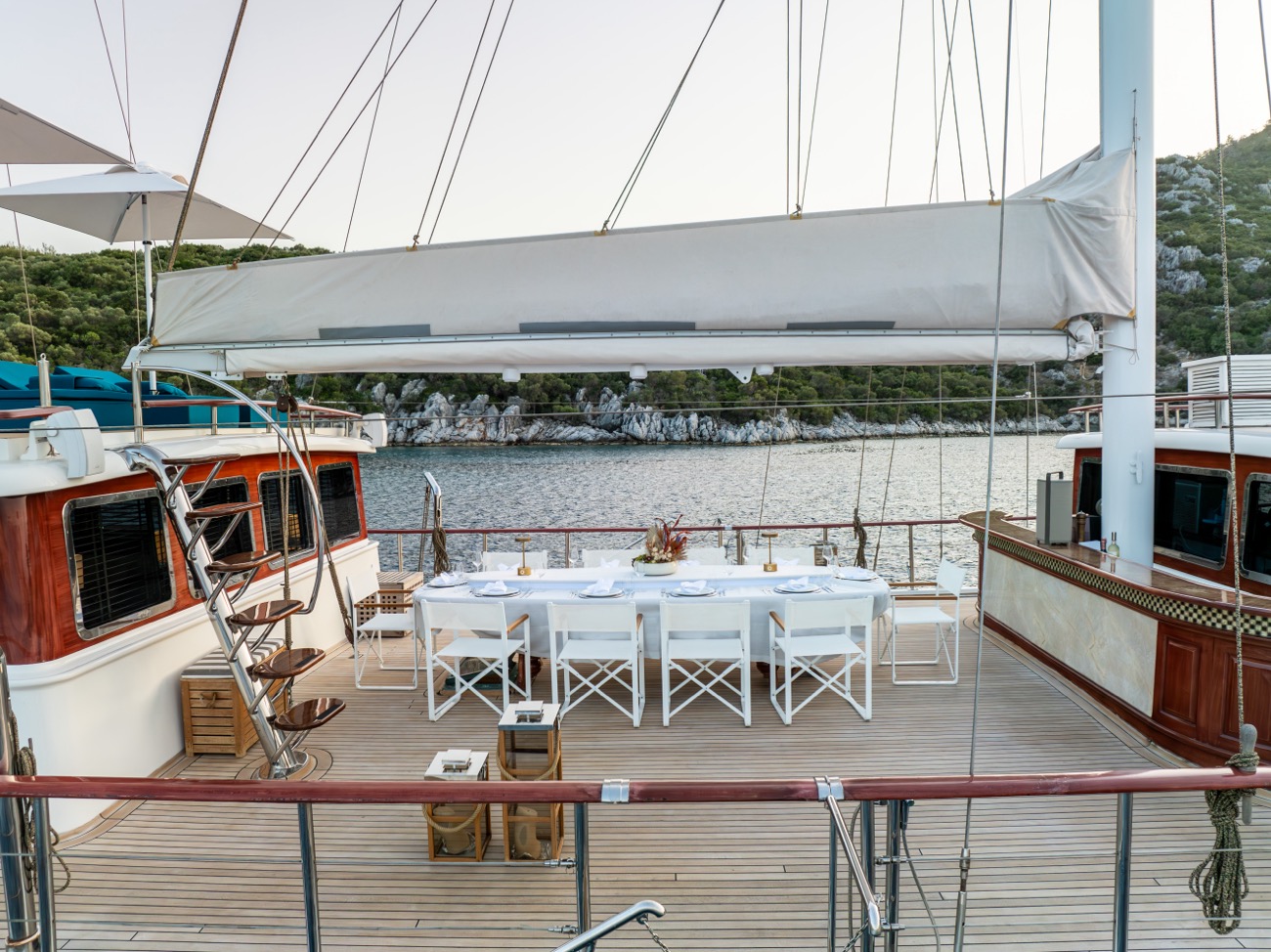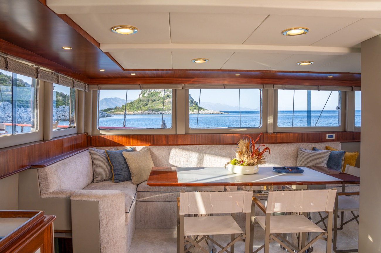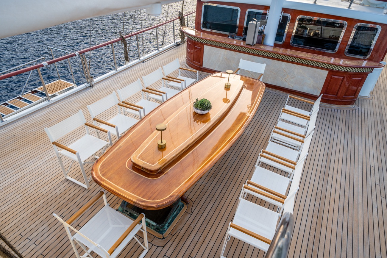 There is a wonderful feature on deck: the dining area amidships, which can be shaded by an awning by day and open to the skies above at night.