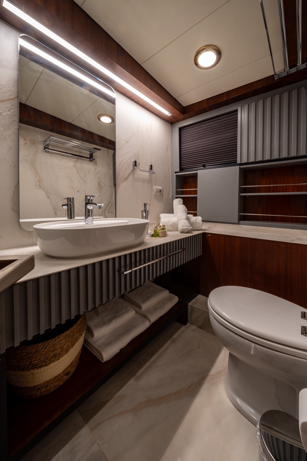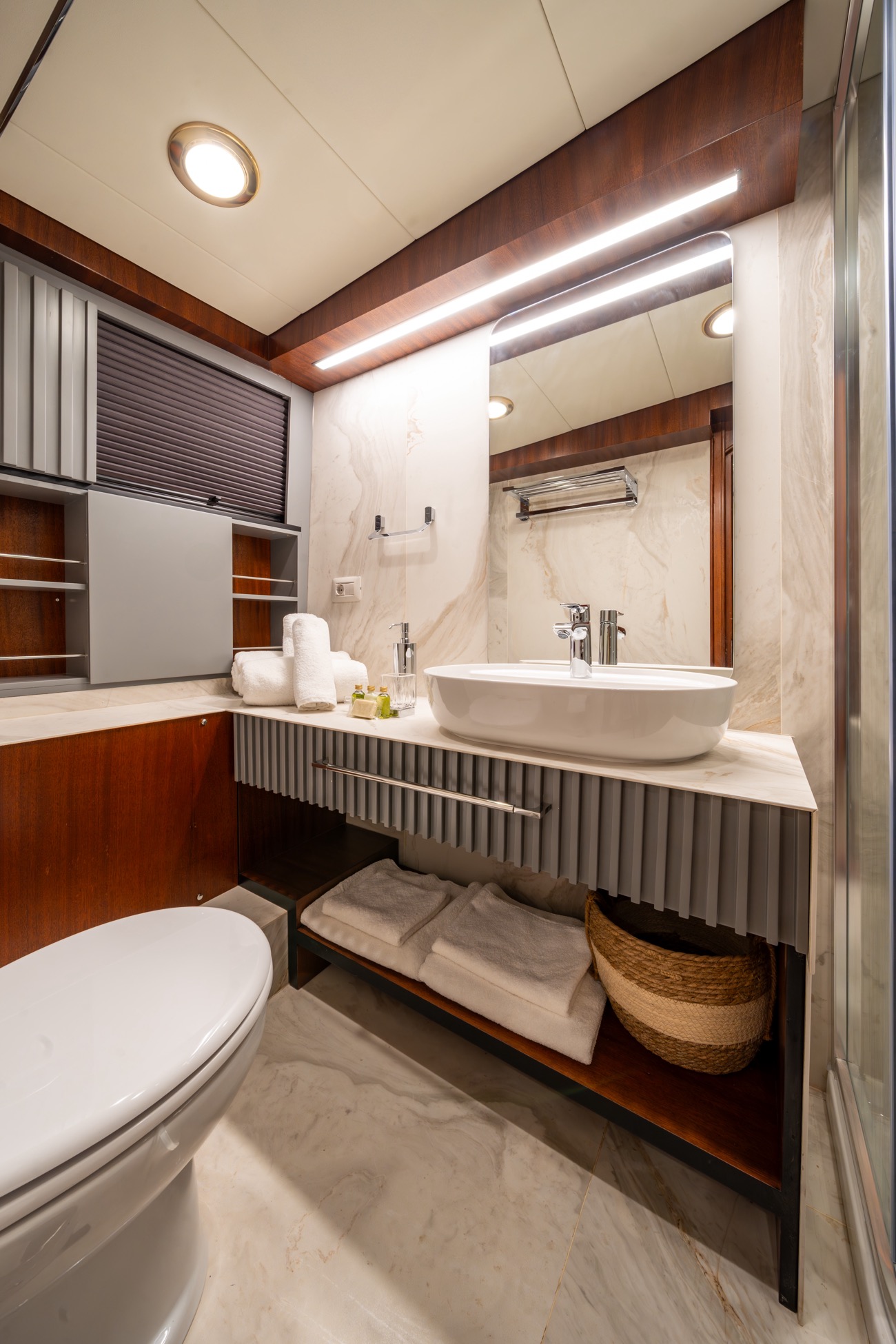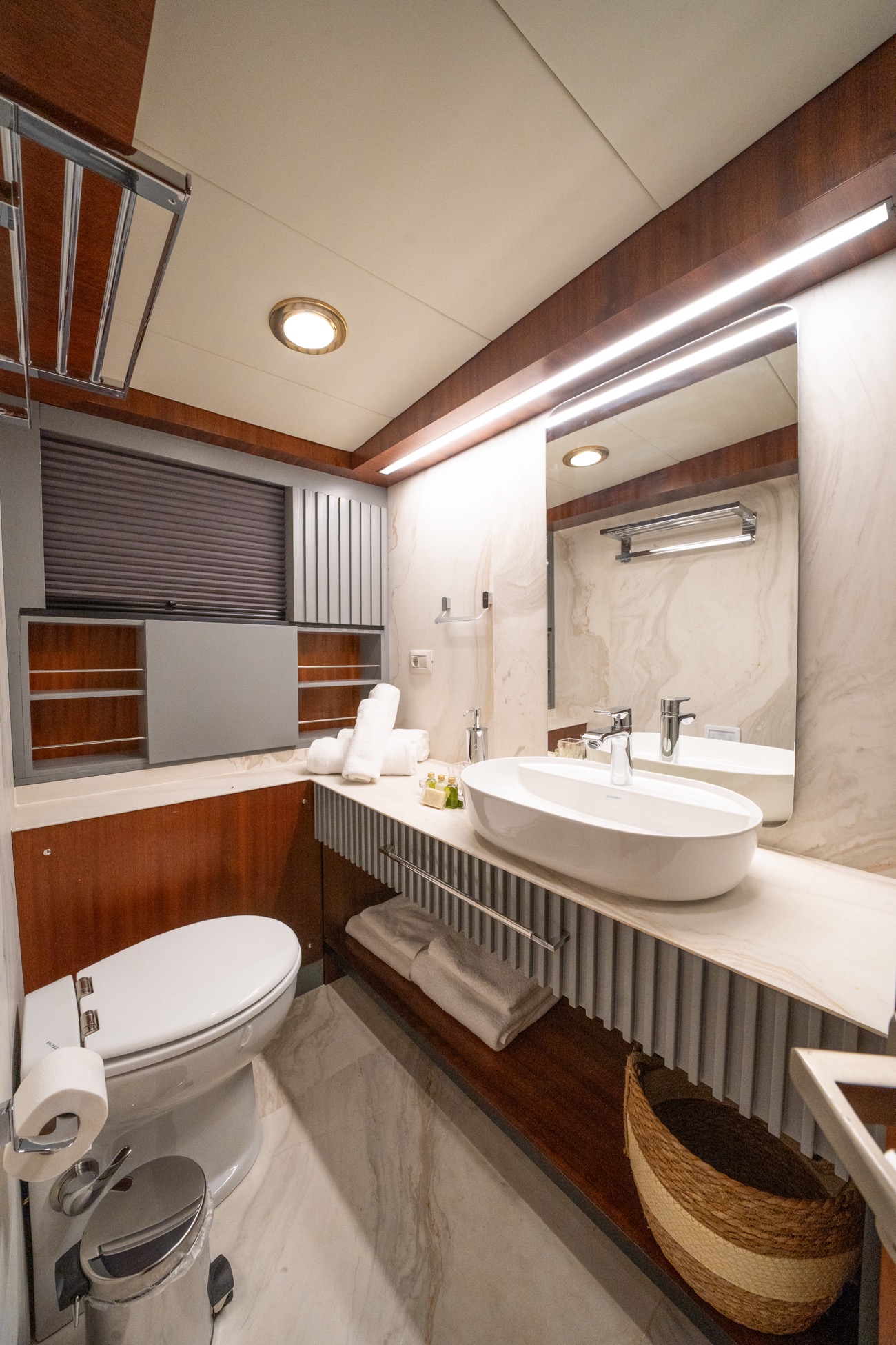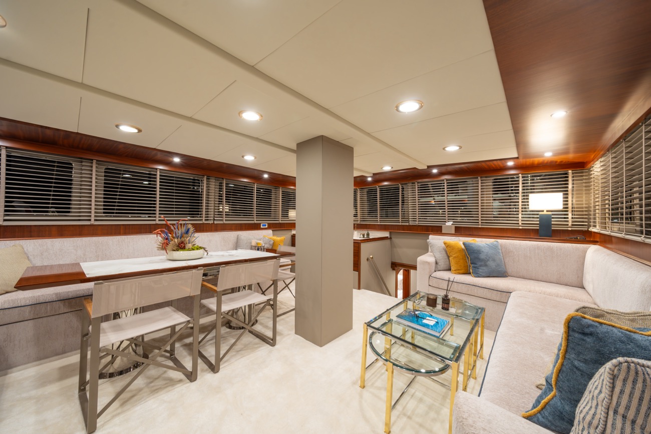 There is a wonderful feature on deck: the dining area amidships, which can be shaded by an awning by day and open to the skies above at night.