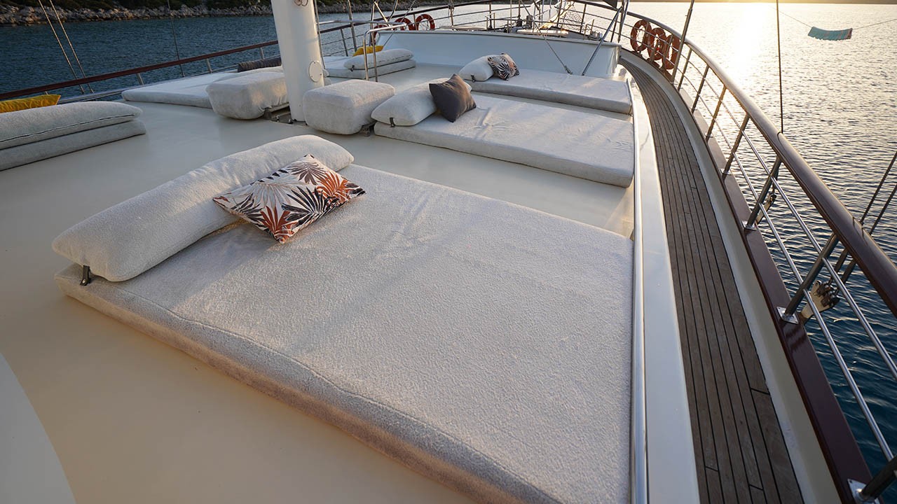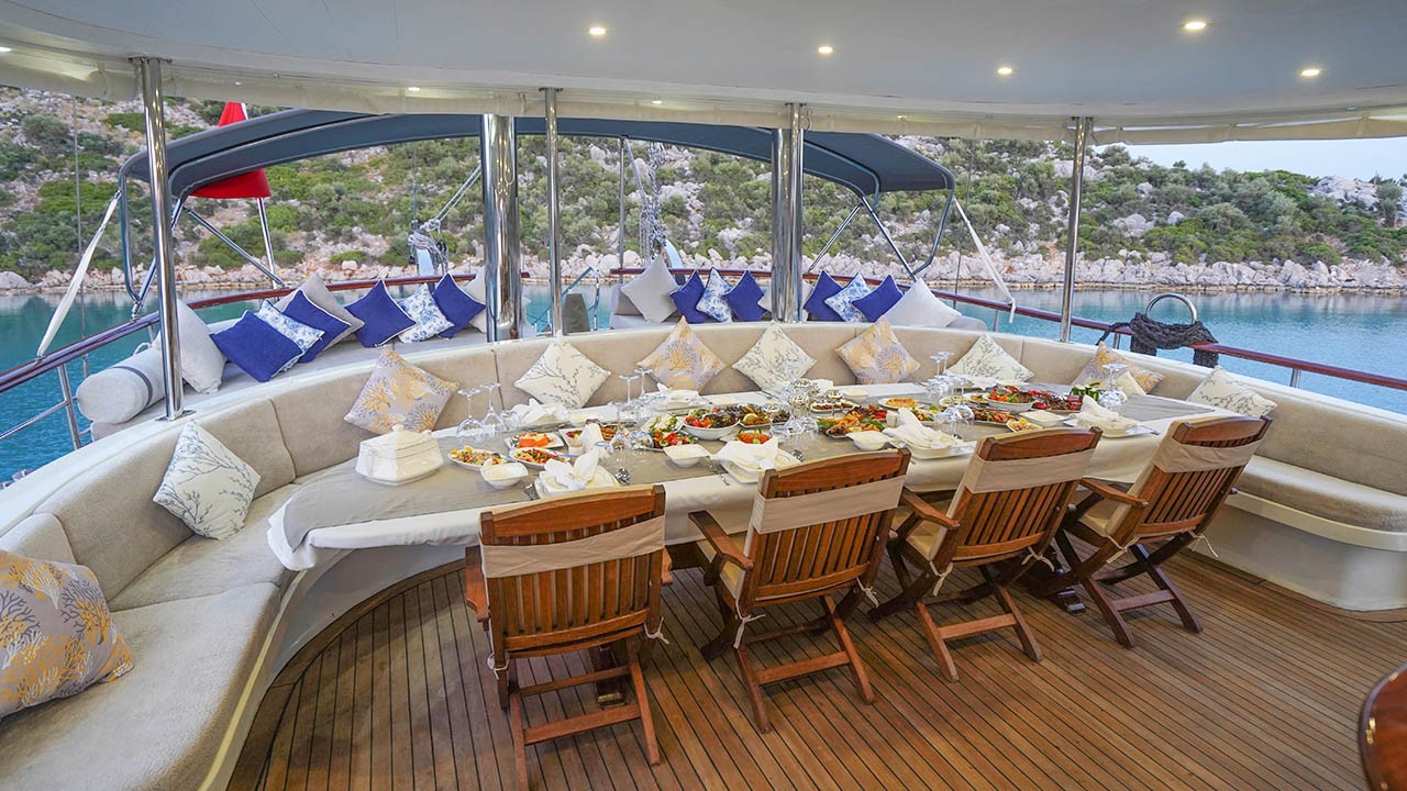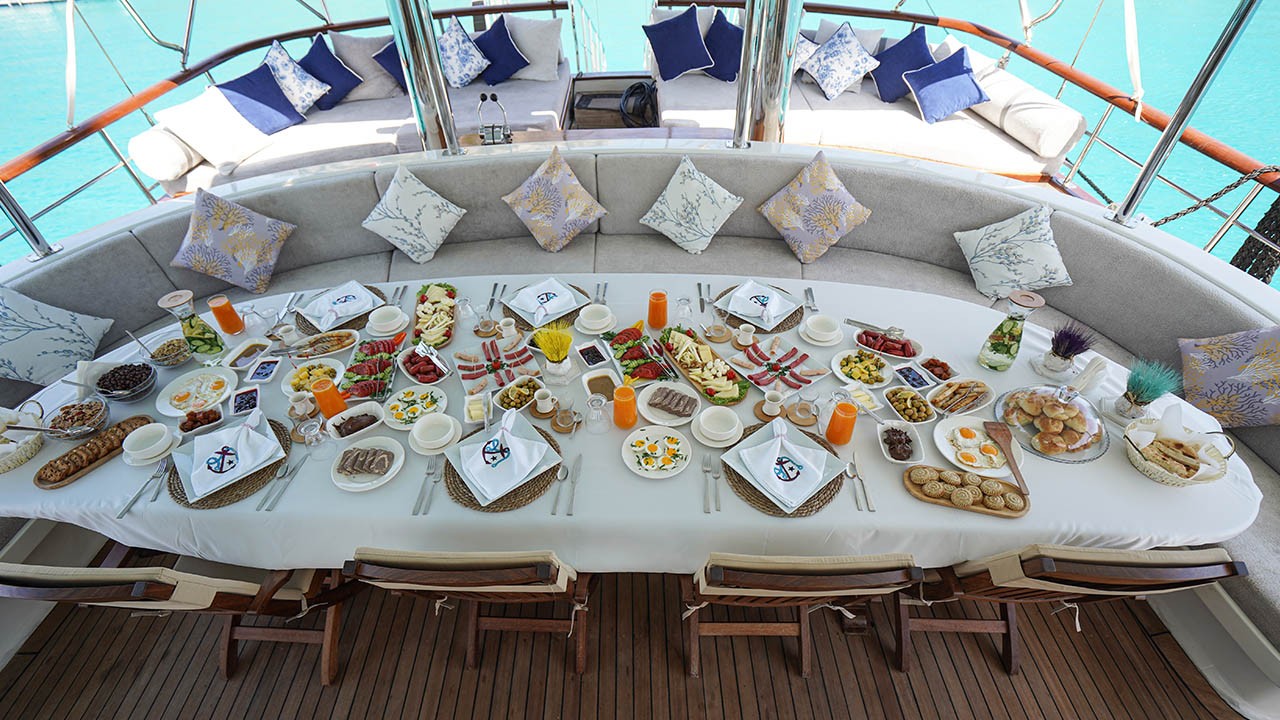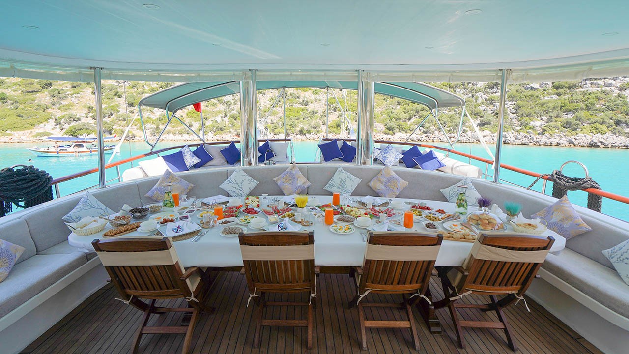 Charter rate includes, yacht insurance, fuel for average cruising time a day, daily cabin and bathroom cleaning, crew services, mooring fees in Türkiye, rent of the yacht, service boat, canoes, paddle boards, etc., ship's laundry (if available)