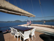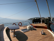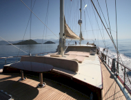 On deck, gulet MEIN SCHATZ offers a wide choice of seating and sunning areas, including a private area on the forward deck for cocktail parties. The yacht has a cushioned sunbathing deck with plenty of sun mattresses. A large, comfortable lounging and dining area is situated on the aft deck, where appetizing meals, prepared to your liking, are served al fresco accompanied by your favourite dinnertime music. The aft deck is the centre of on board activity and can be shaded from the sun by an awning.