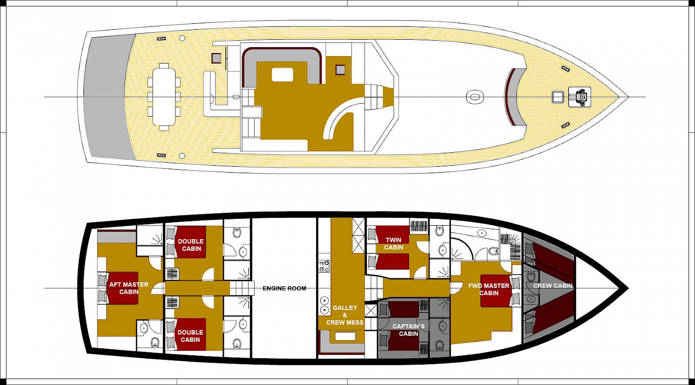 1 aft master cabin with queen size bed, bathroom, 1 forward master cabin with queen size bed, 2 port and starboard identical double cabins with double size beds, 1 port twin cabin, bathroom