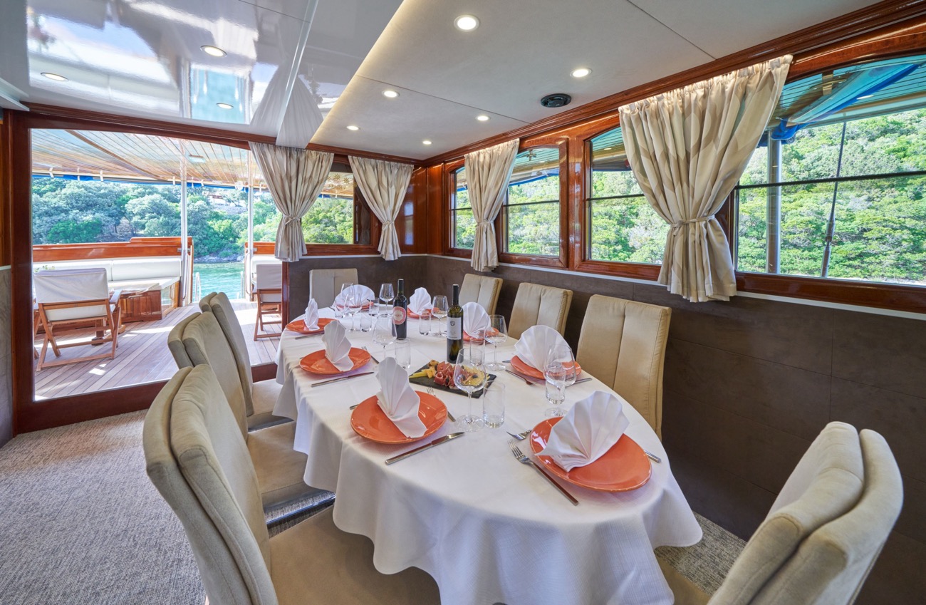 Charter rate includes, accommodation for a maximum of 18 guests in 9 cabins, the crew of 6 and their expenses, insurance of the vessel and the crew, fuel for 4 h of engine work daily, generator work 24/7, fuel for tender transfers to/from the vessel, use of recreational equipment (SUP, kayak, snorkeling gear), tourist taxes, Wi-Fi, VAT of 13%.
