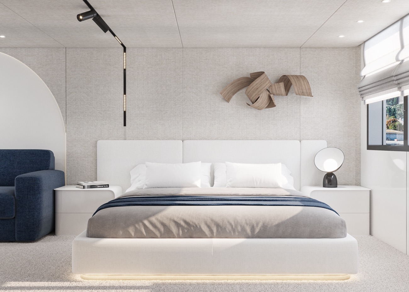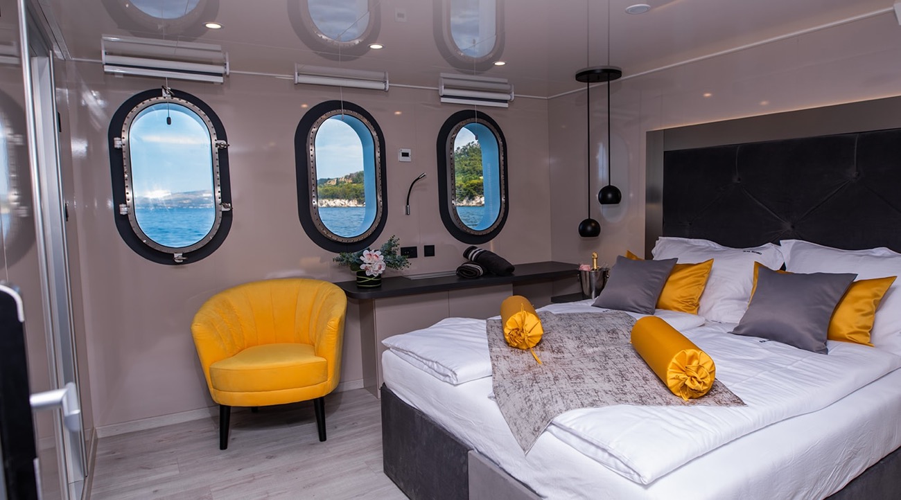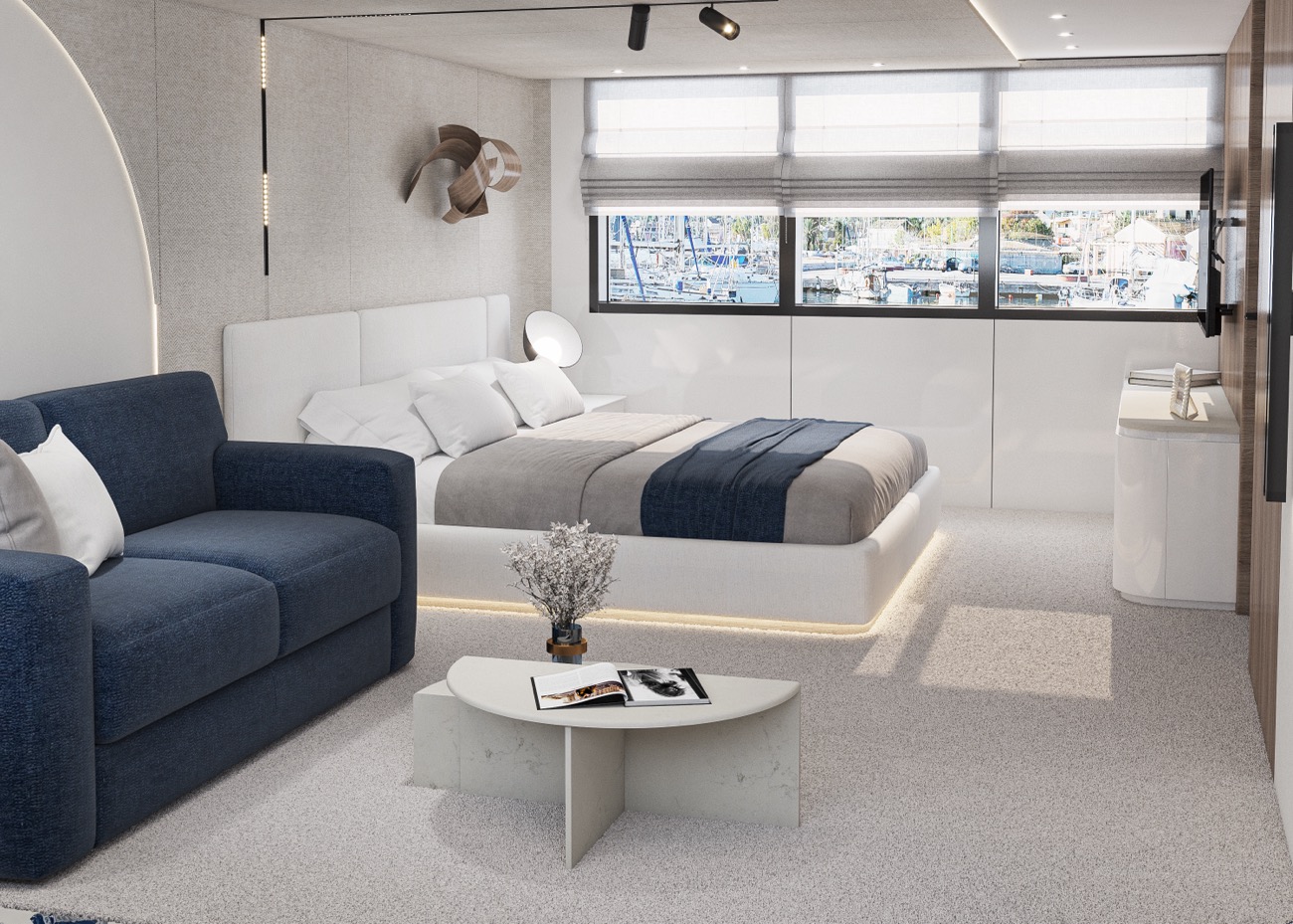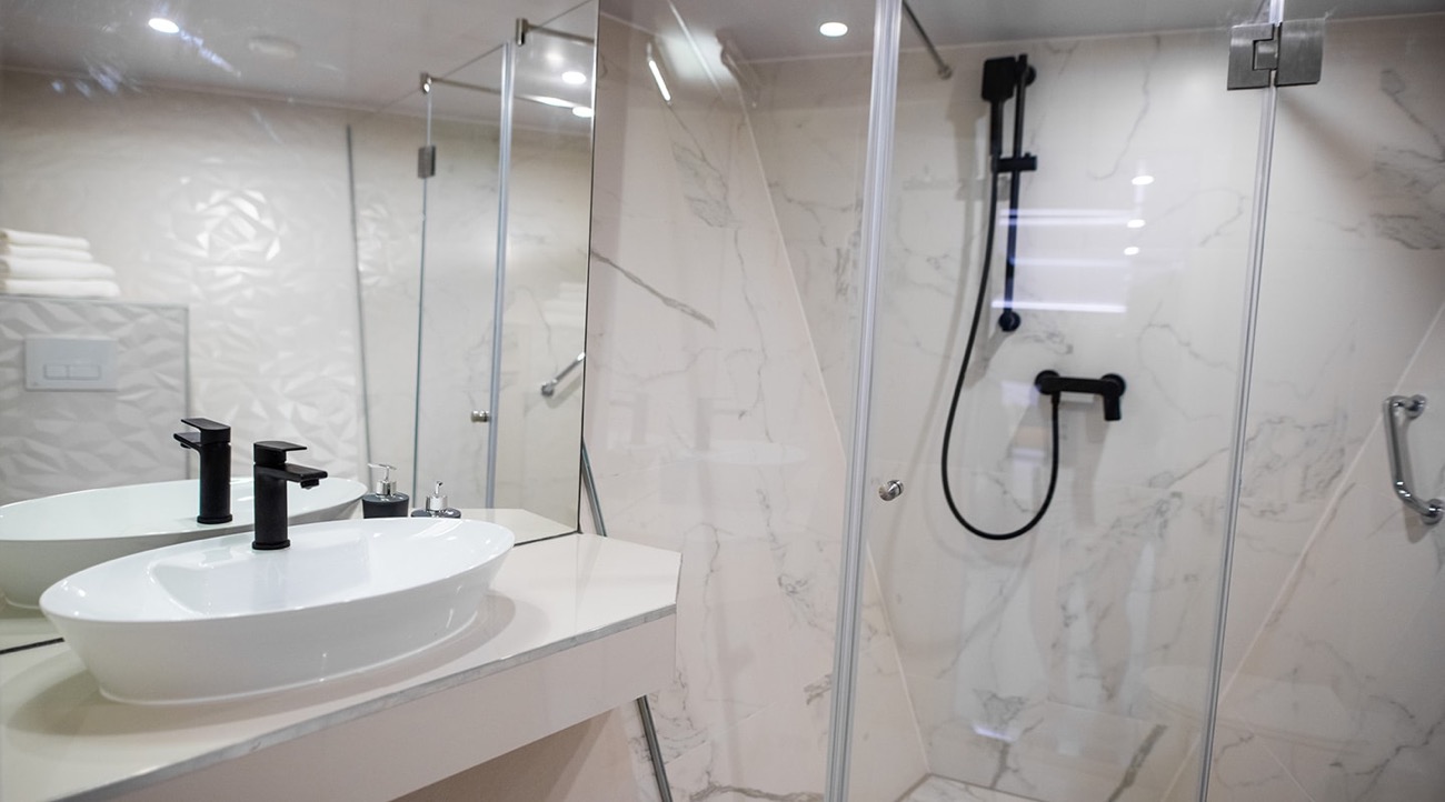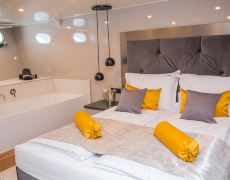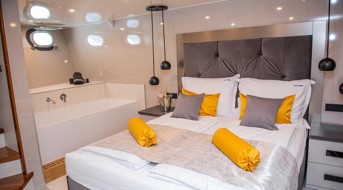 Main Deck: Master cabin with a double bed (180x195 cm) and in-cabin bathtub. 5 Double cabins with double beds (180x195 cm). 2 Convertible cabins (double or twin) with 2 single beds (90x195 cm).