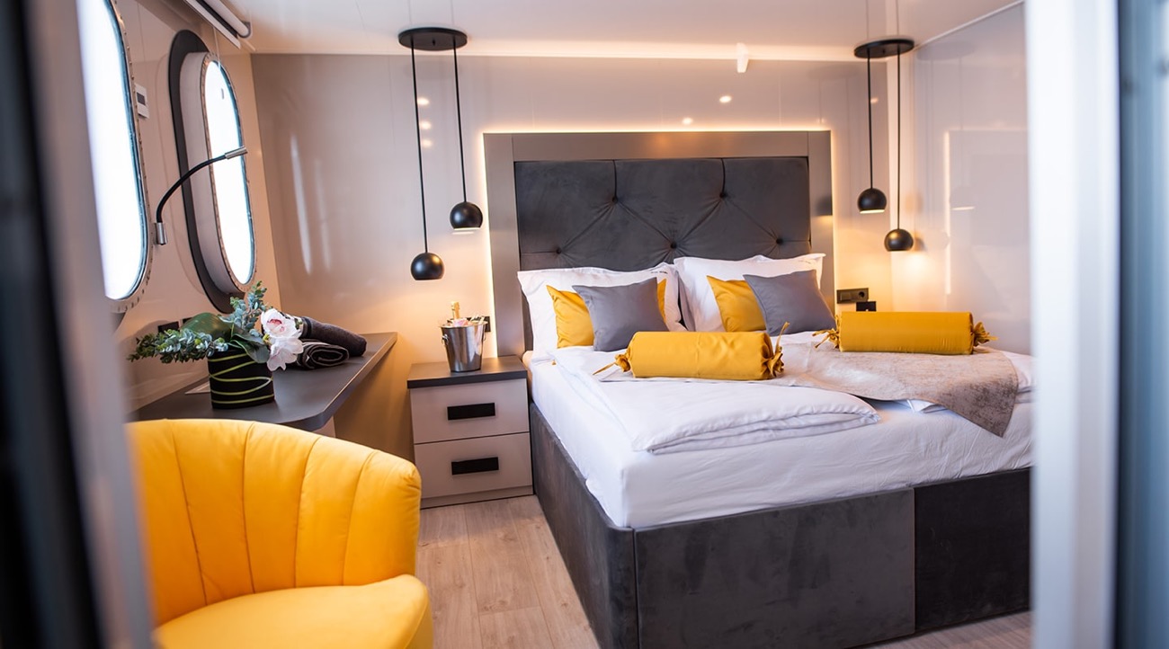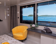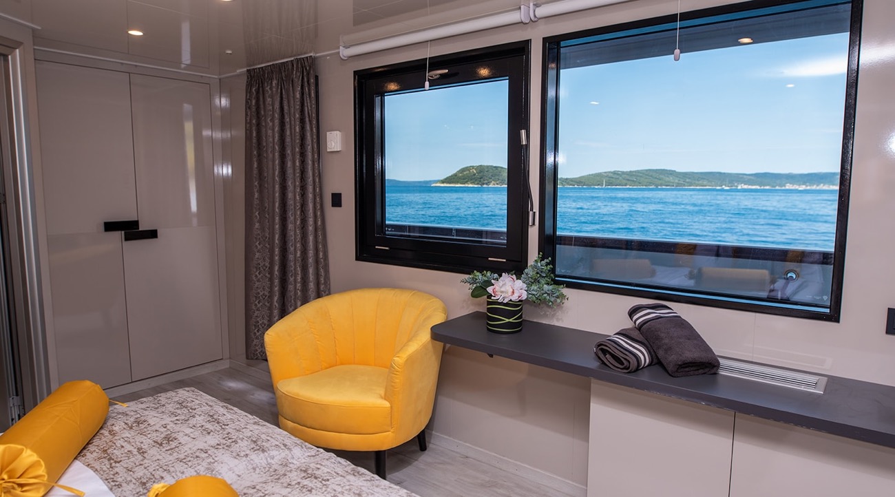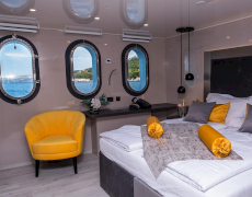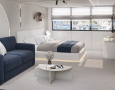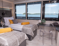 Lower Deck: 5 Double cabins with double beds (180x195 cm). 3 Convertible cabins (double or twin) with 2 single beds (90x195 cm).