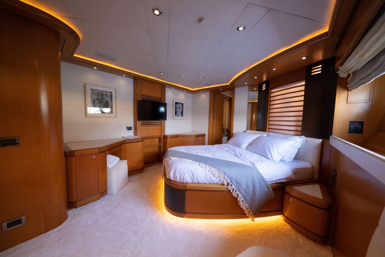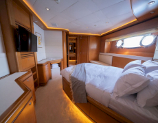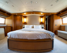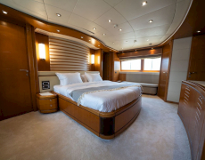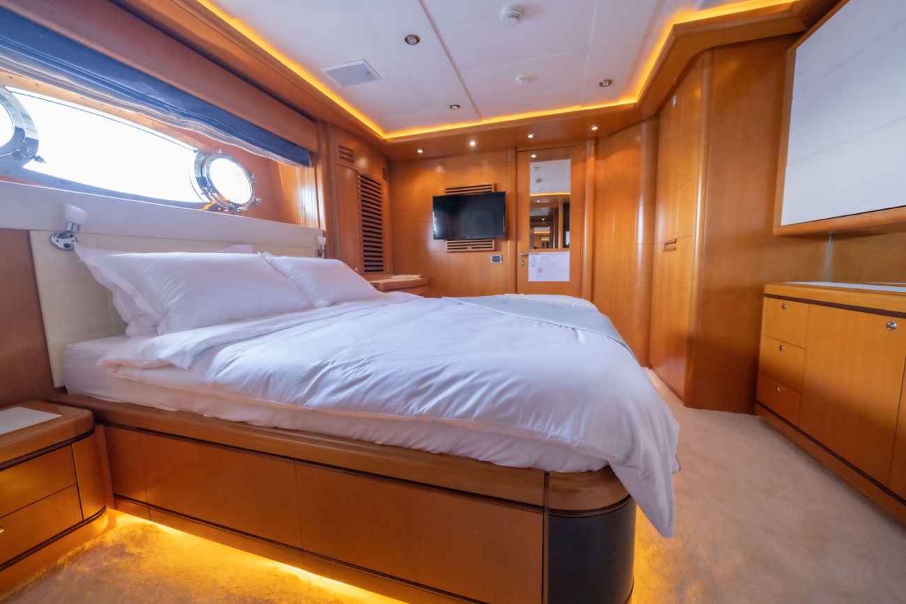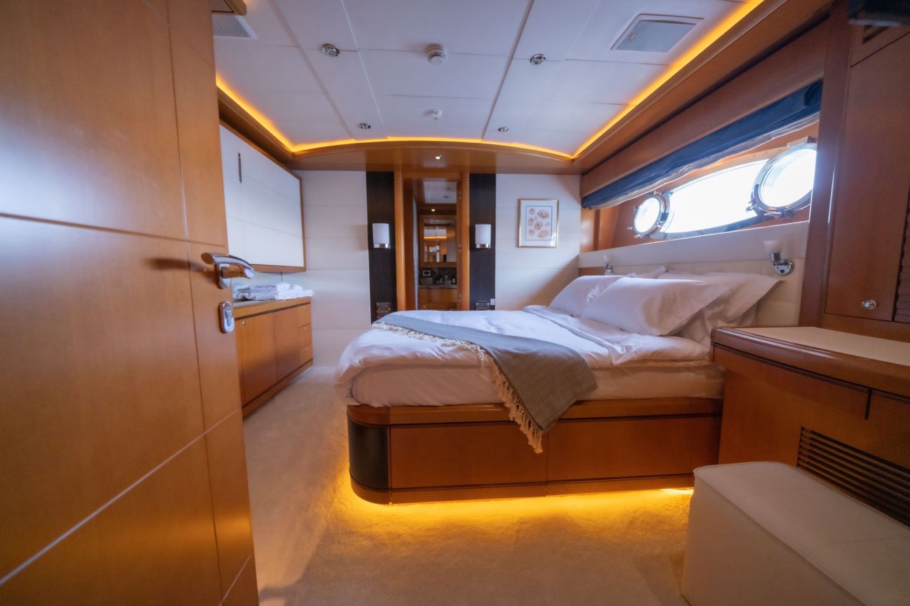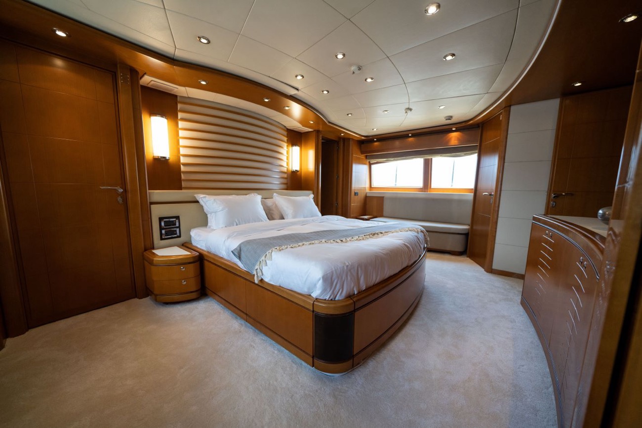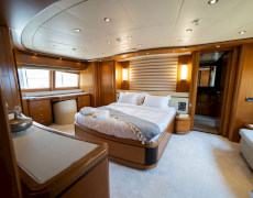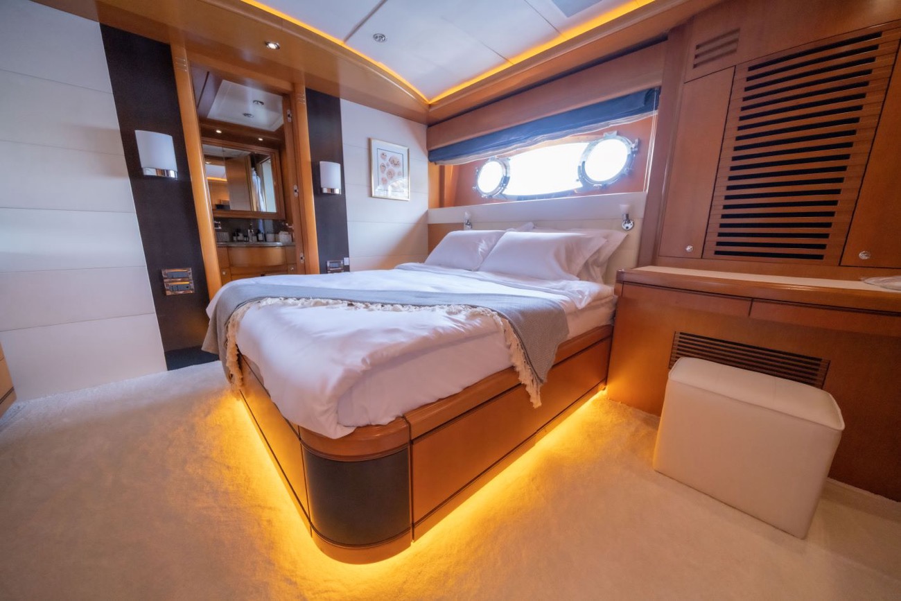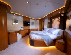 Master suite (main deck), 2 VIP cabins (lower deck), 1 Double cabin (upper deck), 2 Double cabins each with a Pullman bed (lower deck)