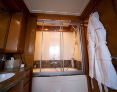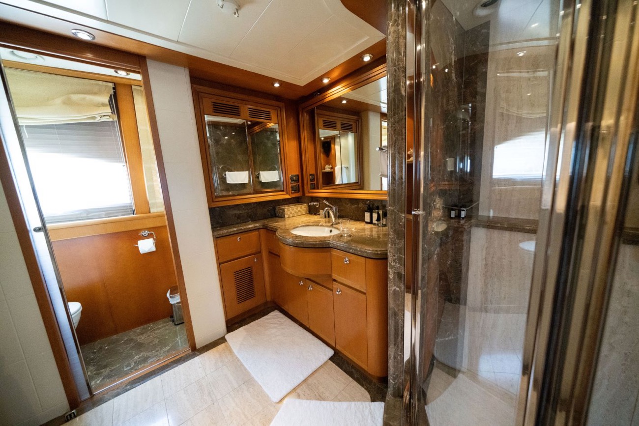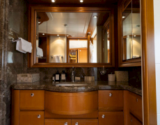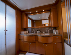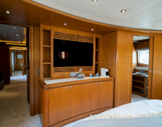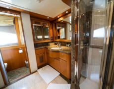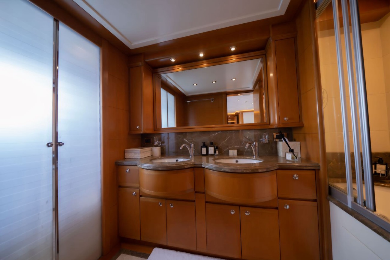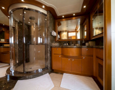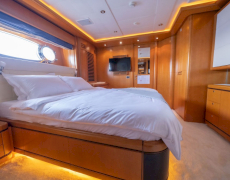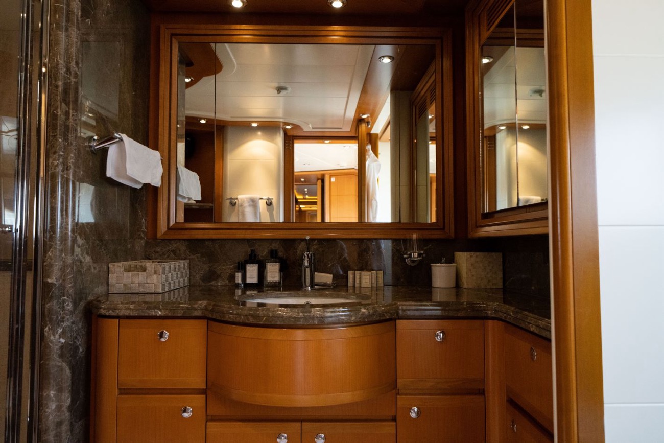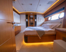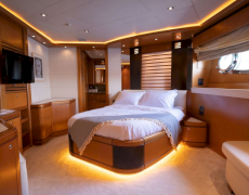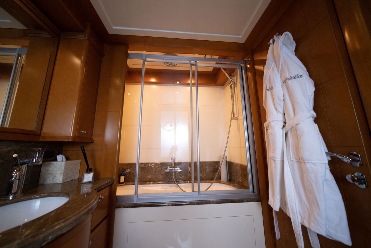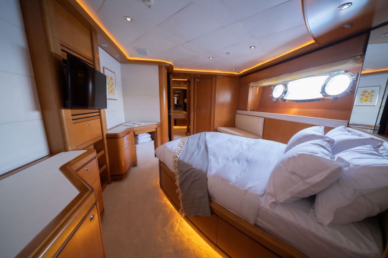 Master suite (main deck), 2 VIP cabins (lower deck), 1 Double cabin (upper deck), 2 Double cabins each with a Pullman bed (lower deck)