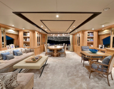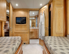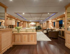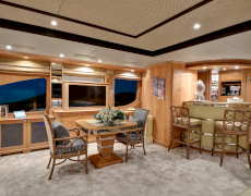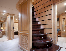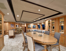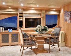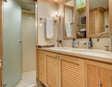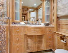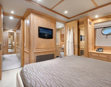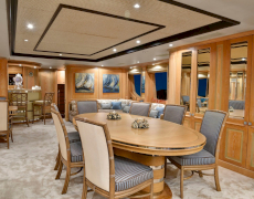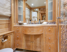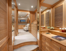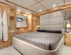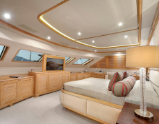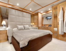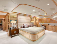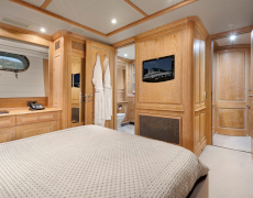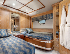 The motor yacht QUEST R is able to accommodate 12 guests in 5 cabins. Master stateroom is located on the main deck. It is very spacious and light. It also features a closet for the guests belongings. Next to the master cabin there’s an office that can be used during charter for business purposes.